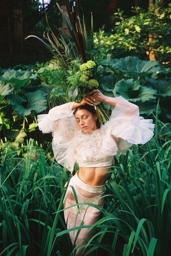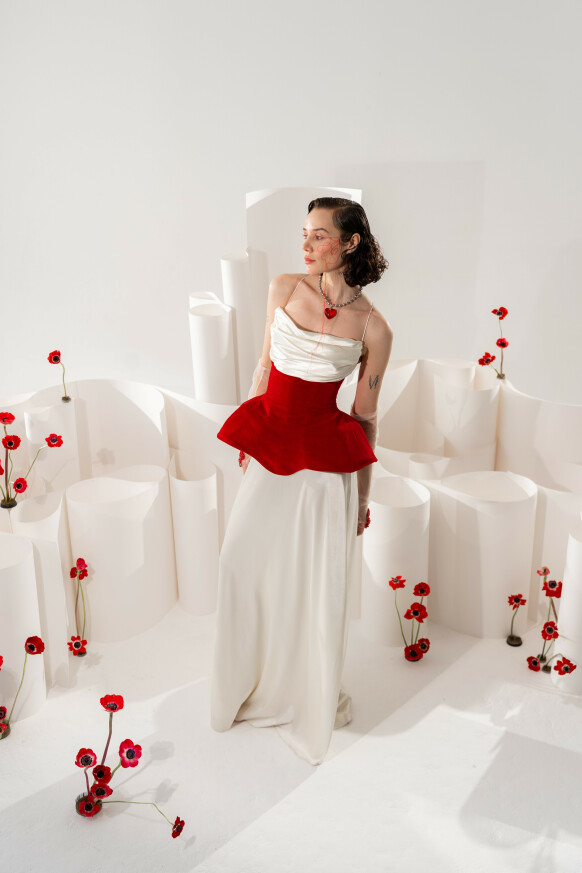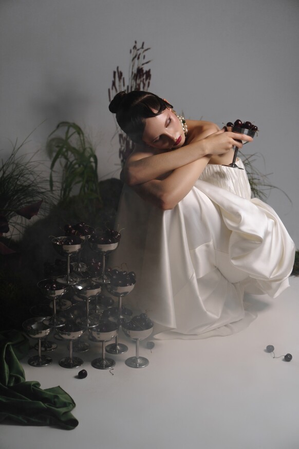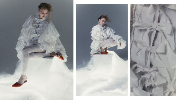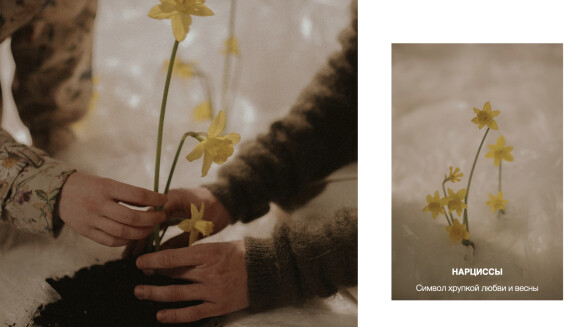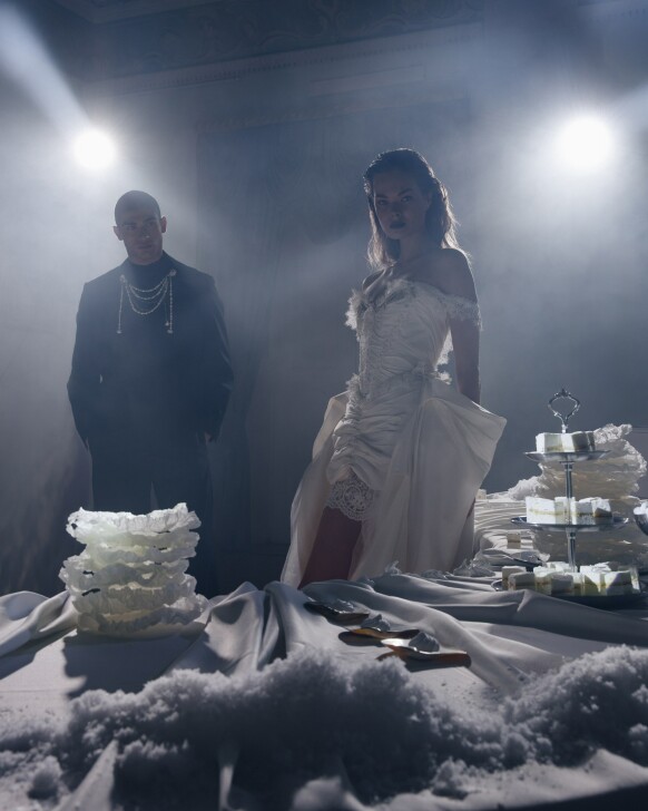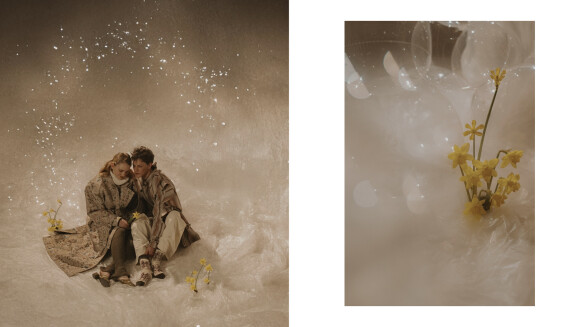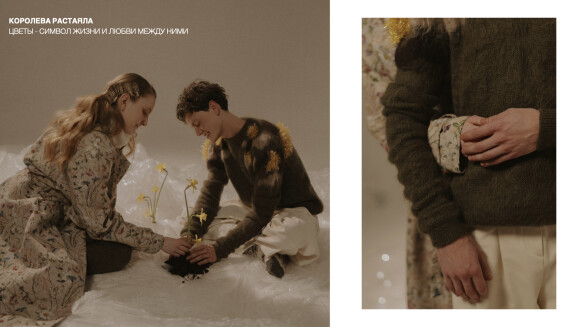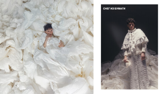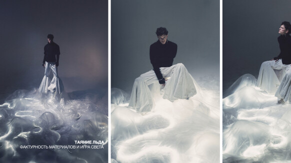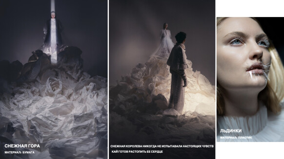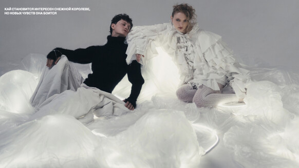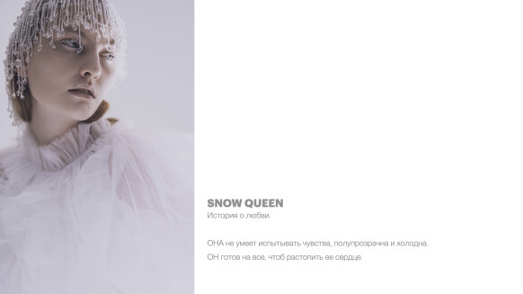 Для воплощения идеи использовались простые материалы: бумага (снег), прозрачная пленка и световые решения (таяние льда), минимум цветов (зарождение новых чувств). Одежда бренда GAPANOVICH своими объемами и многословностью идеально подчеркнула видение нашей версии сказки.