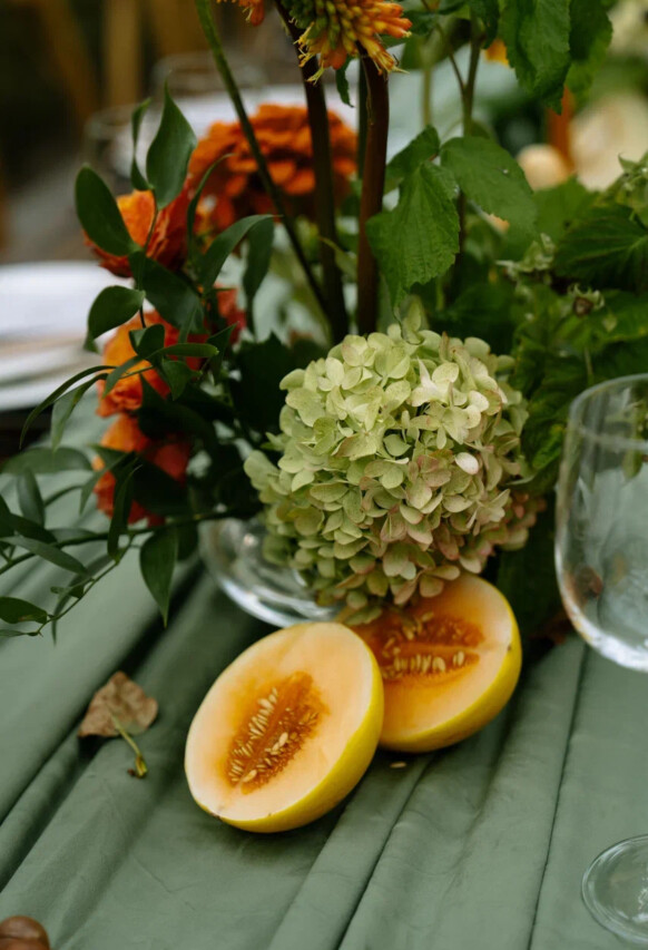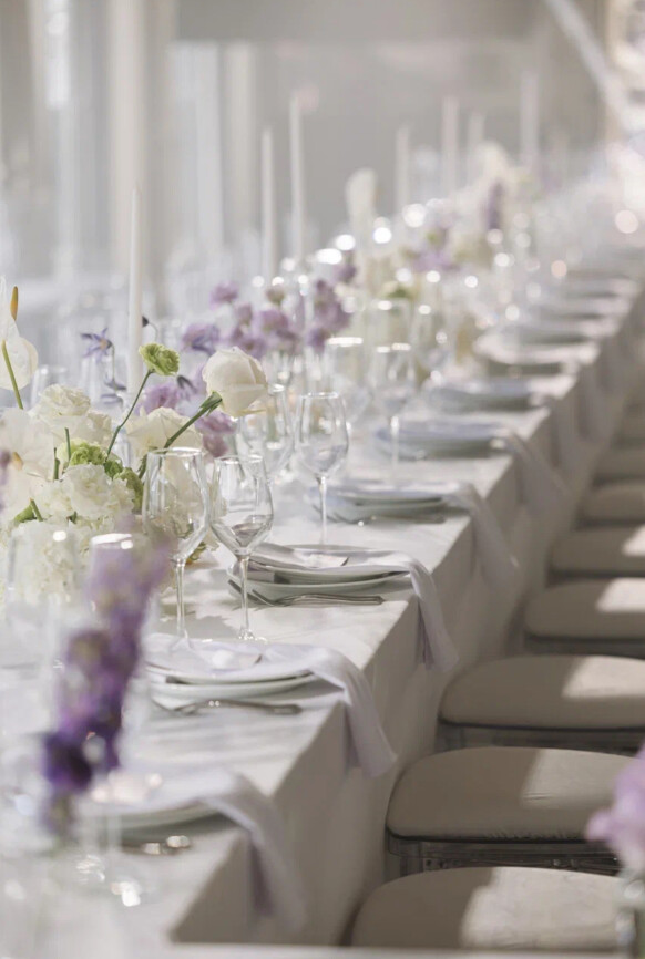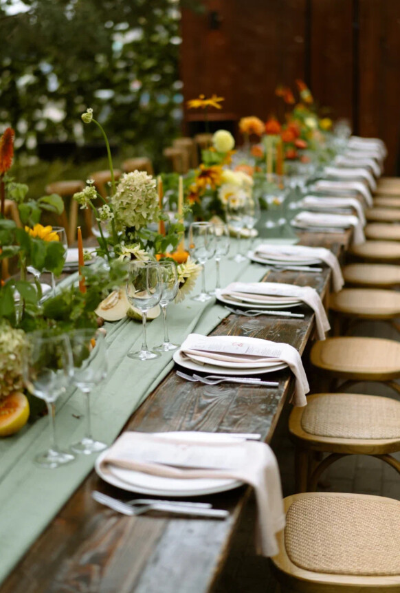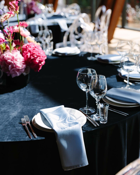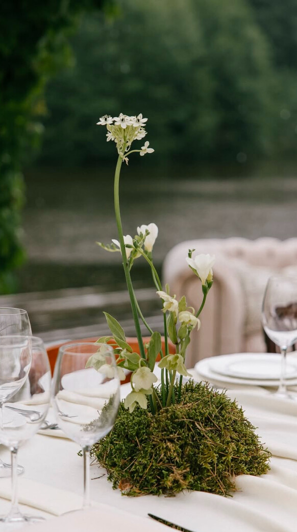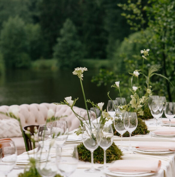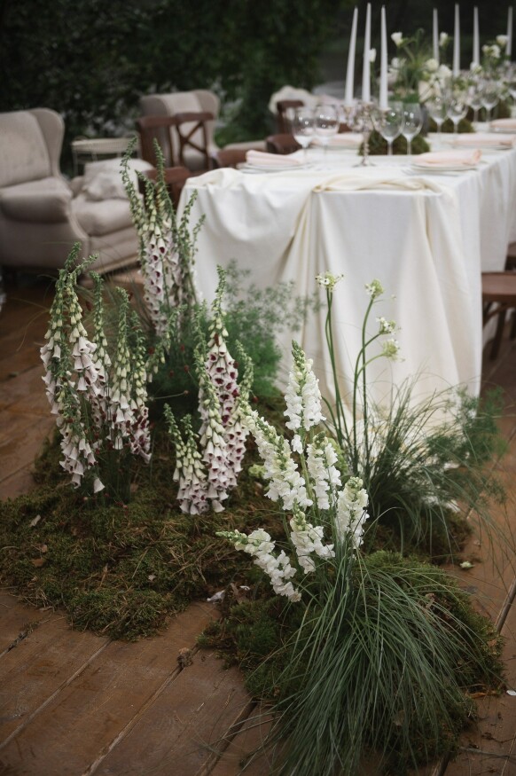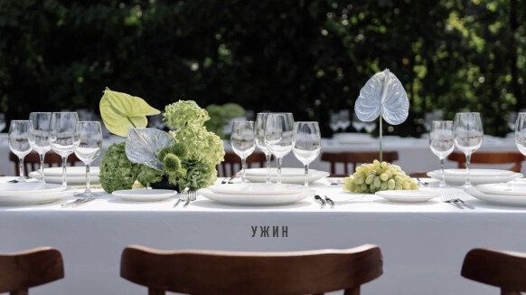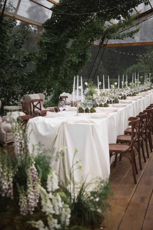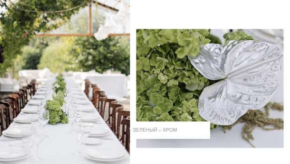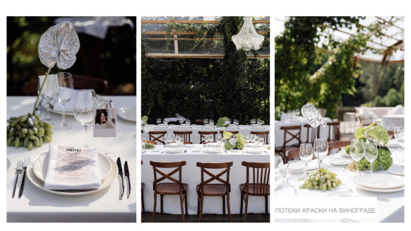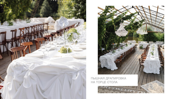 Идеальные белые скатерти, немного хрома, минимум зеленой флористики. Столы должны выделяться на фоне веранды, заросшей диким виноградом.