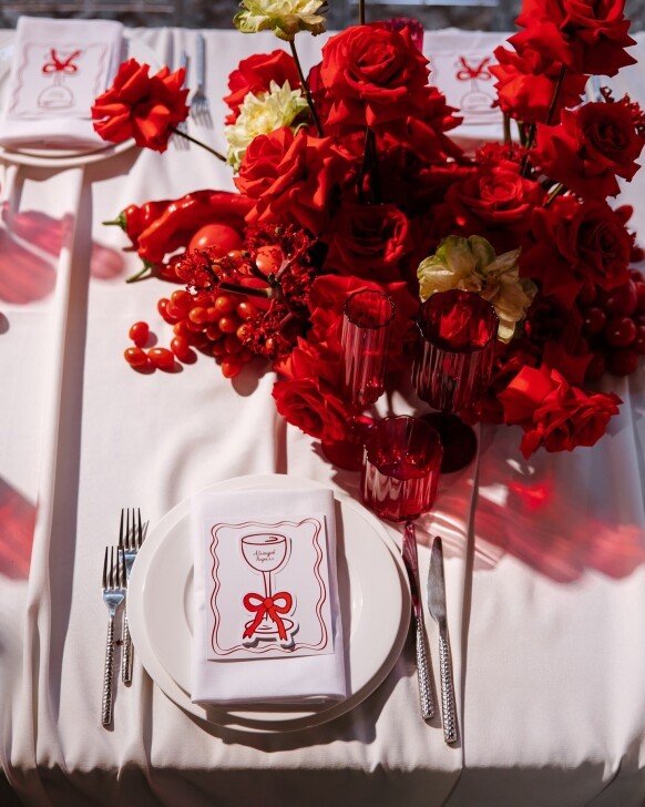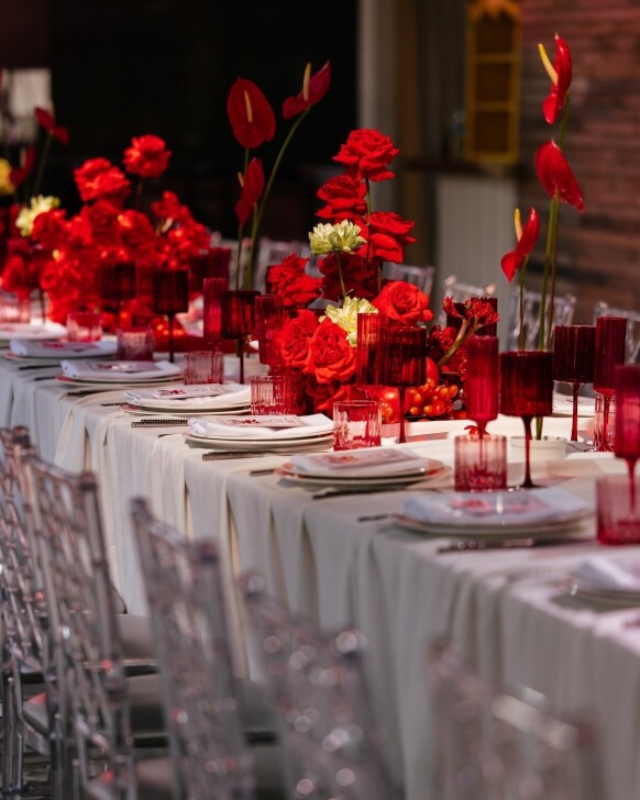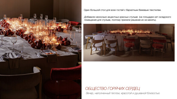 С помощью акцентов красного цвета в декоре и полиграфии, большого количества свечей, тактильно приятных материалов мы создали атмосферу, в которой хотелось улыбаться и наслаждаться красивым праздником.