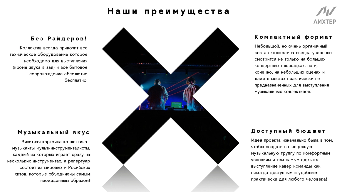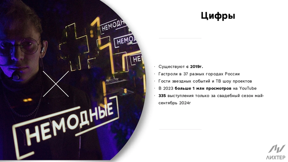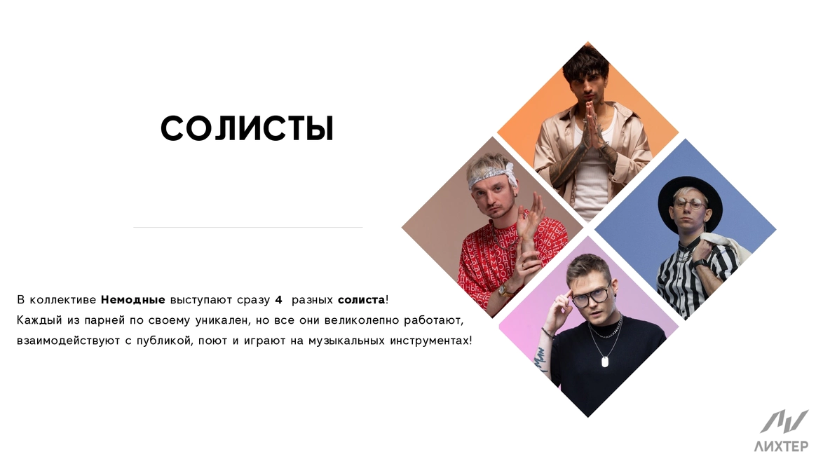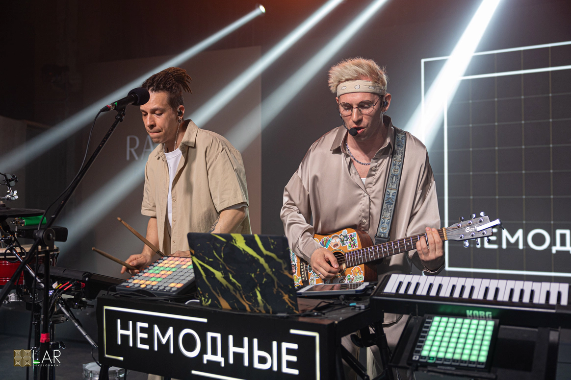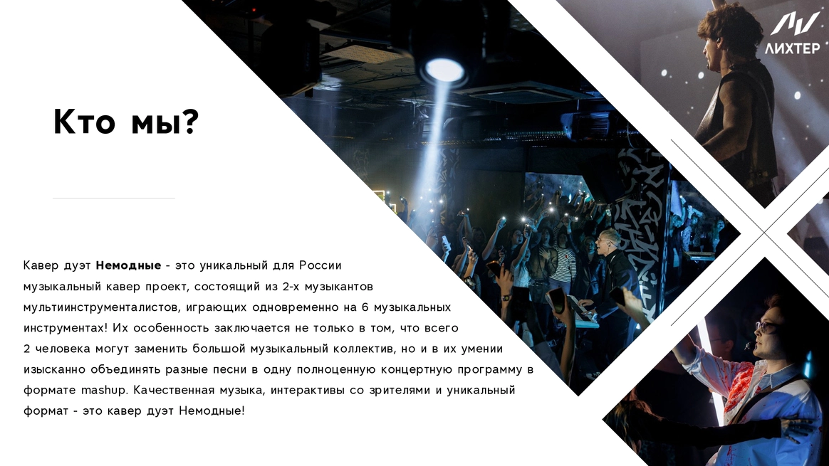 Кавер дуэт Немодные - это уникальный для России музыкальный кавер проект, состоящий из 2-х музыкантов мультиинструменталистов, играющих одновременно на музыкальных инструментах! Их особенность заключается не только в том, что всего 2 человека могут заменить большой музыкальный коллектив, но и в их умении изысканно объединять разные песни в одну полноценную концертную программу в формате mashup. Коллектив уверенно смотрится на больших площадках за счёт артистичности и энергии ребят, но так как группа состоит из двух человек, то прекрасно подходят для небольших сцен и в мест практически не предназначенных для выступления музыкальных коллективов.