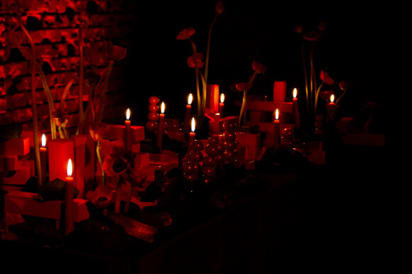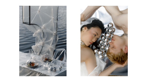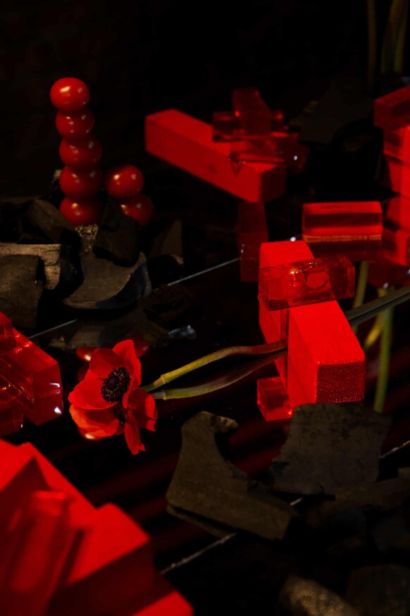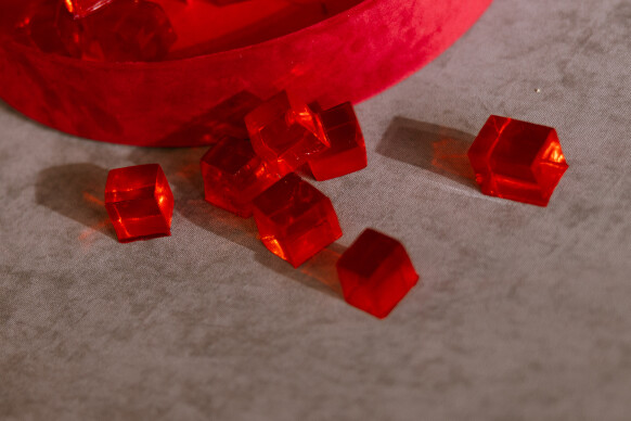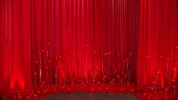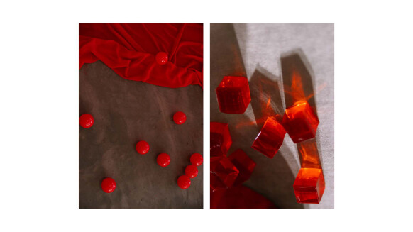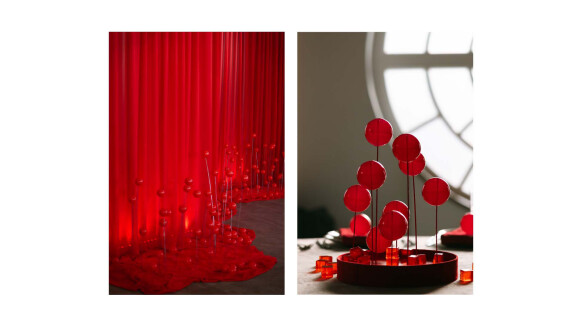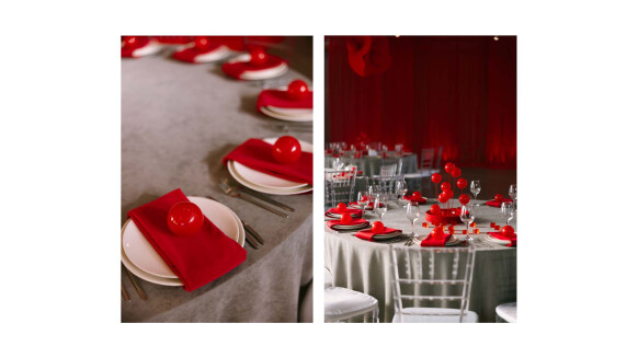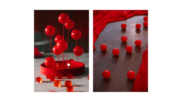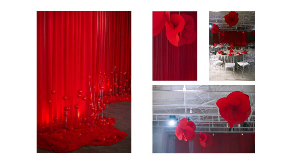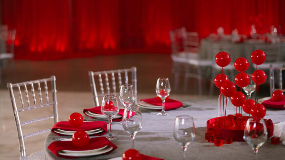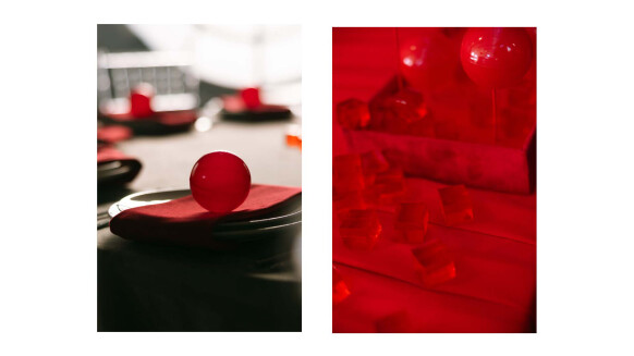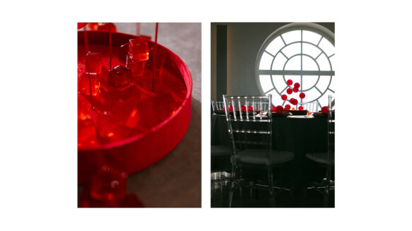 Через контраст форм и единство цвета мы хотели показать,что даже при разнице в характерах ребят есть то,что их объединяет.Это сила их чувства.При подготовке мы столкнулись с задачей со «звездочкой»- свадьба должна была быть без цветов.Это было единственное пожелание от невесты.Мною была предложена альтернатива цветам-множество красных шариков.Цветы,правда,всё-таки были в виде фантазийных люстр.Контраст формы и фактуры мы поддержали в виде кубиков желе.