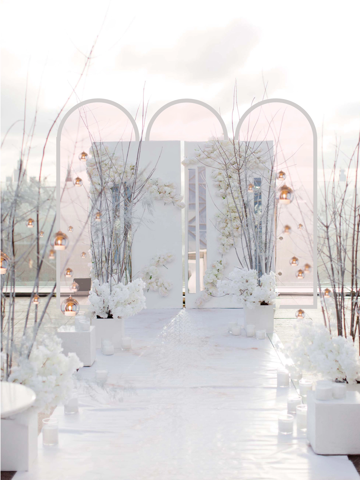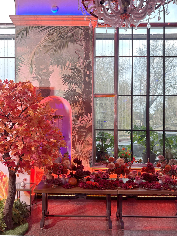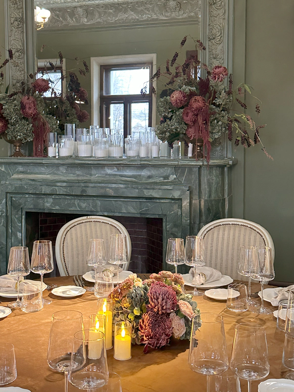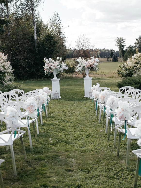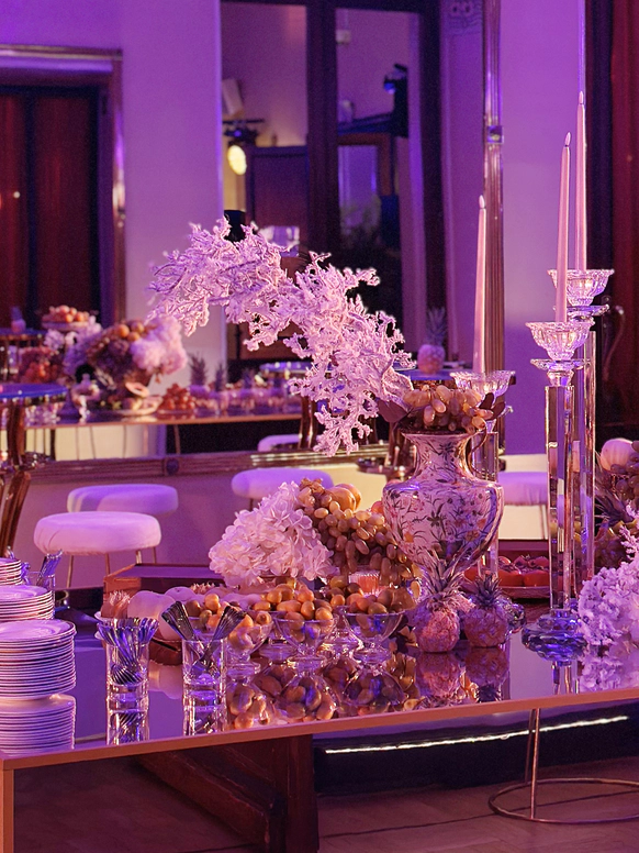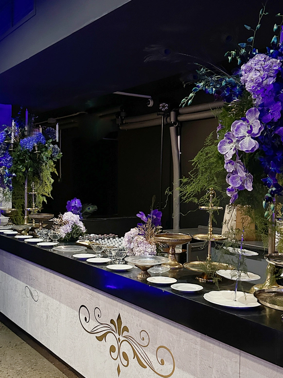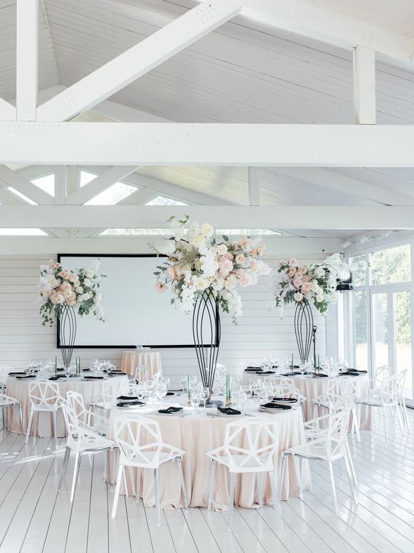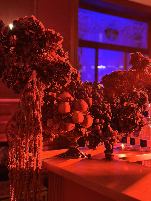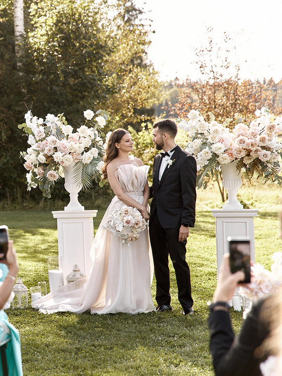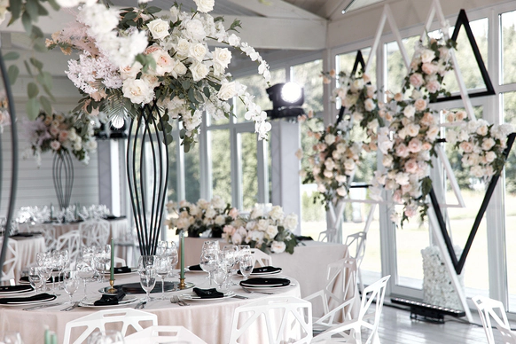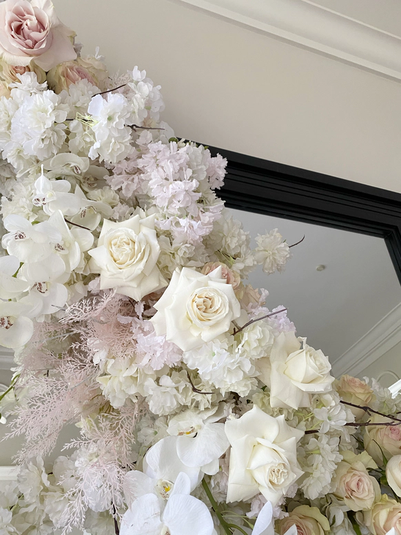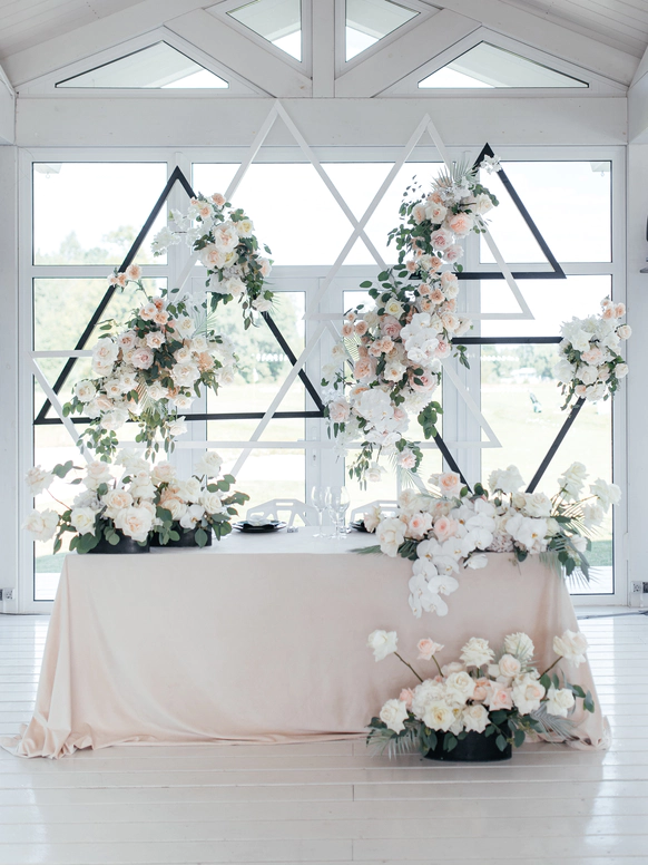 В контраст к этому мы ввели мягкую флористику в пудрово-молочных оттенках — как воплощение невесты: лёгкость, чувственность, эмоциональная глубина. Воздушные, струящиеся цветочные композиции перекликаются с пластикой её платья и смягчают графичность форм, создавая баланс между жёсткой геометрией и живым движением.