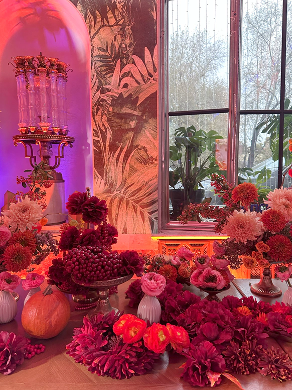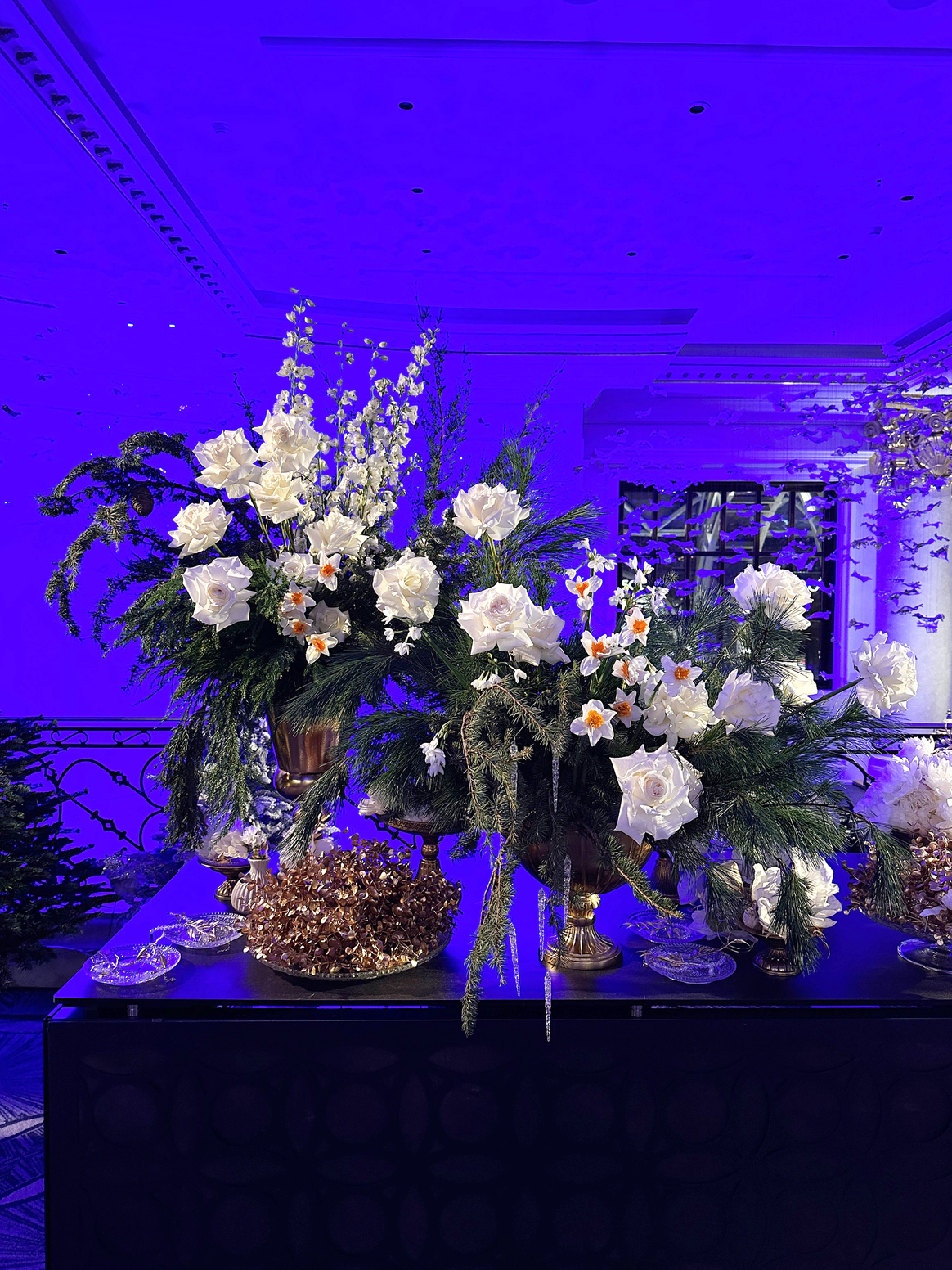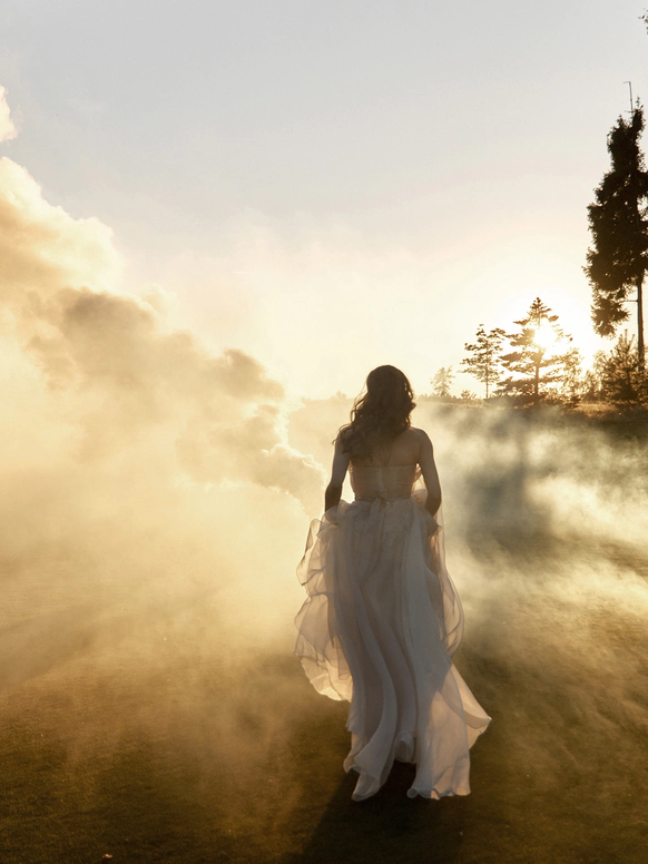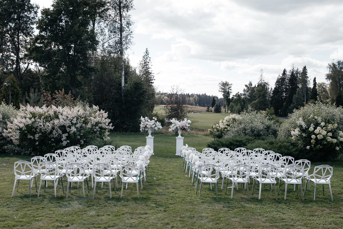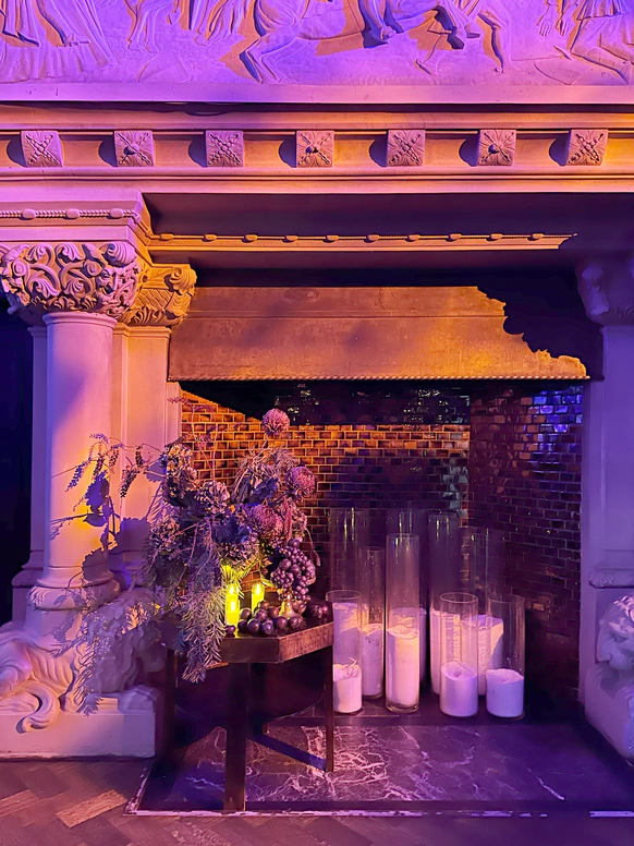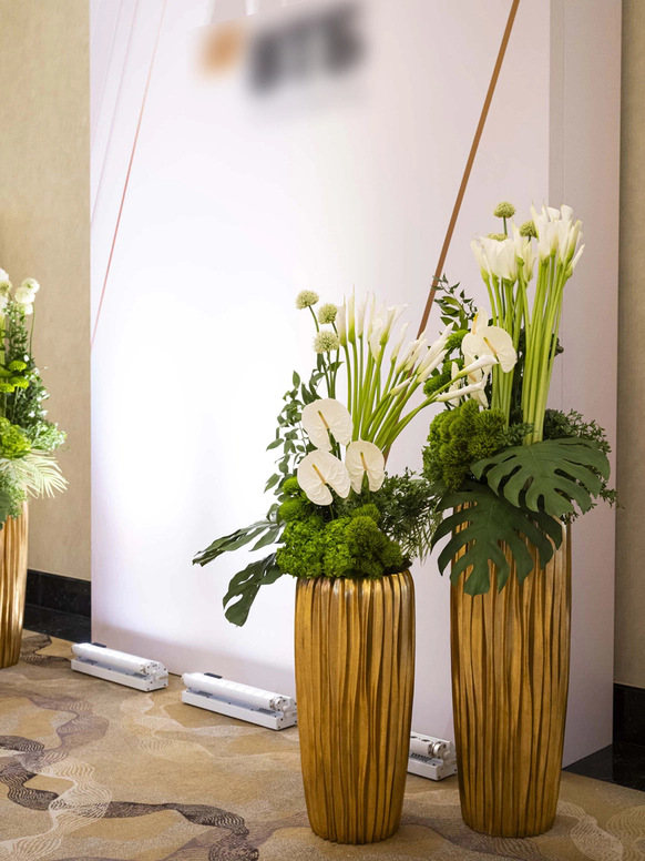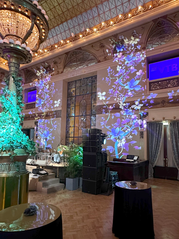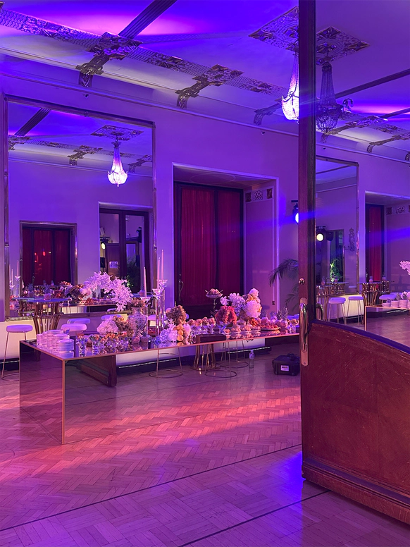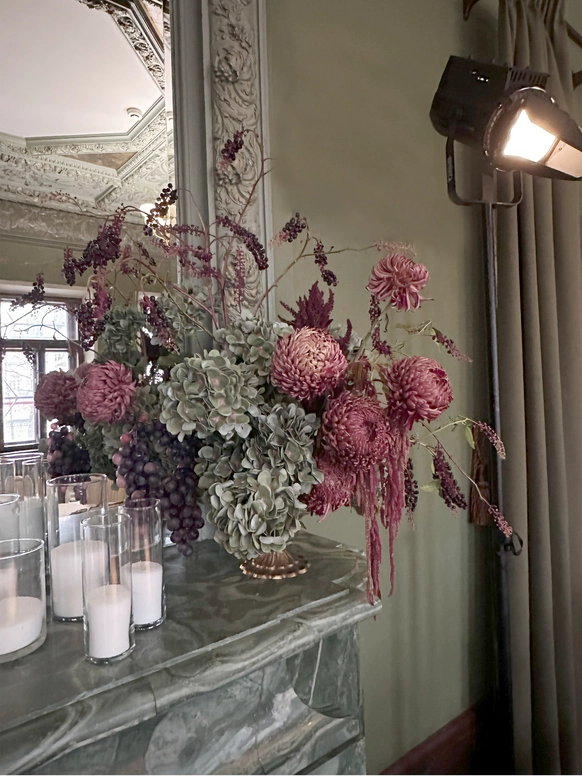 В контраст к этому мы ввели мягкую флористику в пудрово-молочных оттенках — как воплощение невесты: лёгкость, чувственность, эмоциональная глубина. Воздушные, струящиеся цветочные композиции перекликаются с пластикой её платья и смягчают графичность форм, создавая баланс между жёсткой геометрией и живым движением.