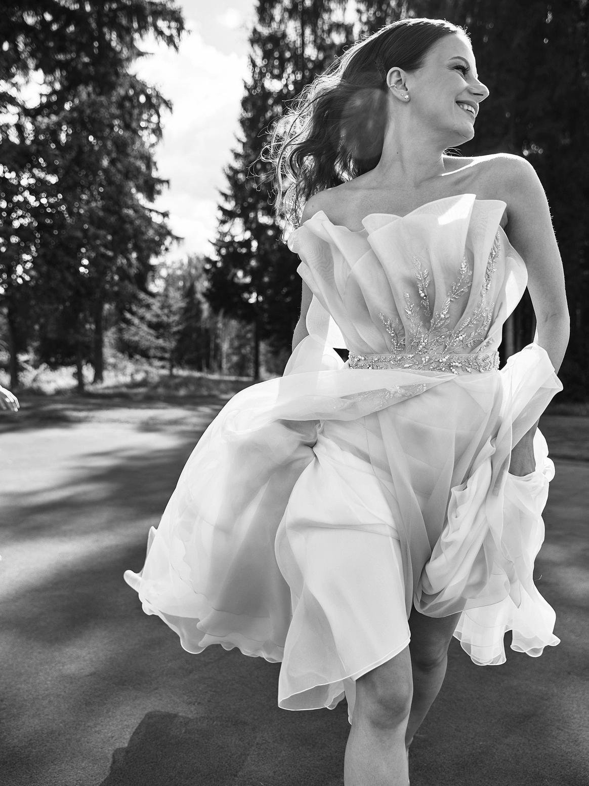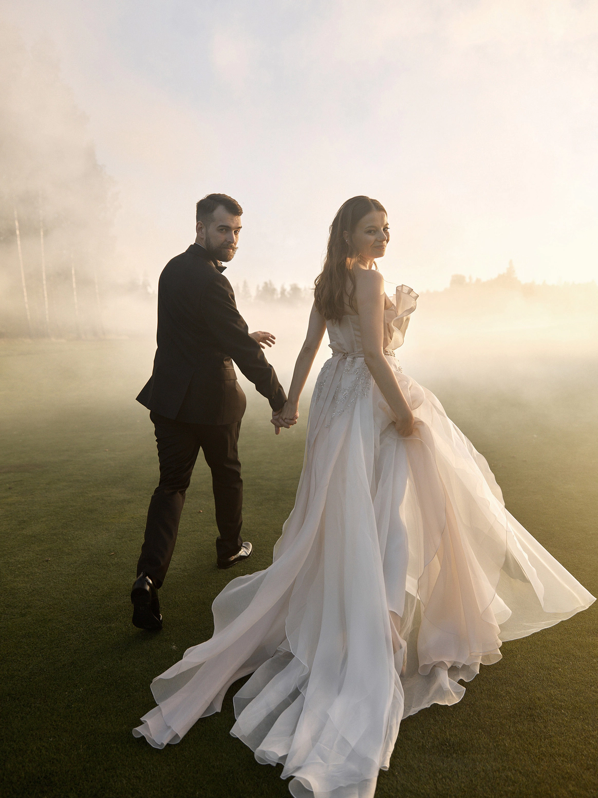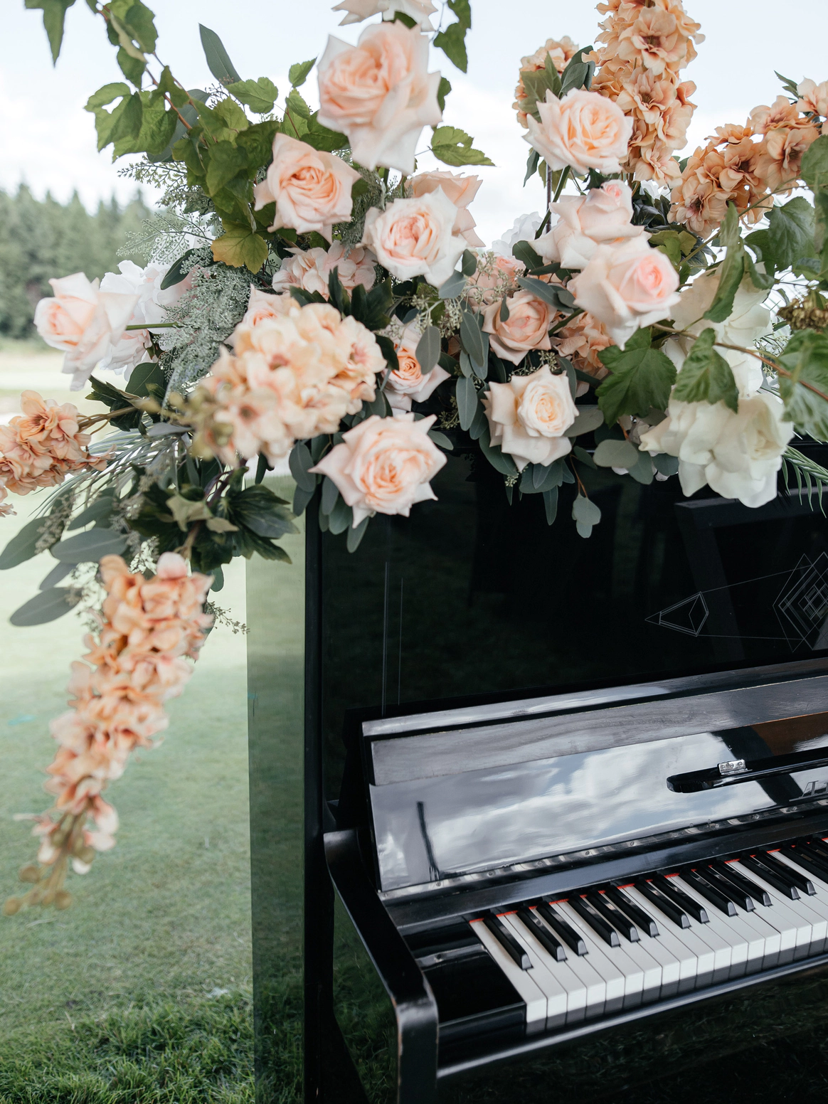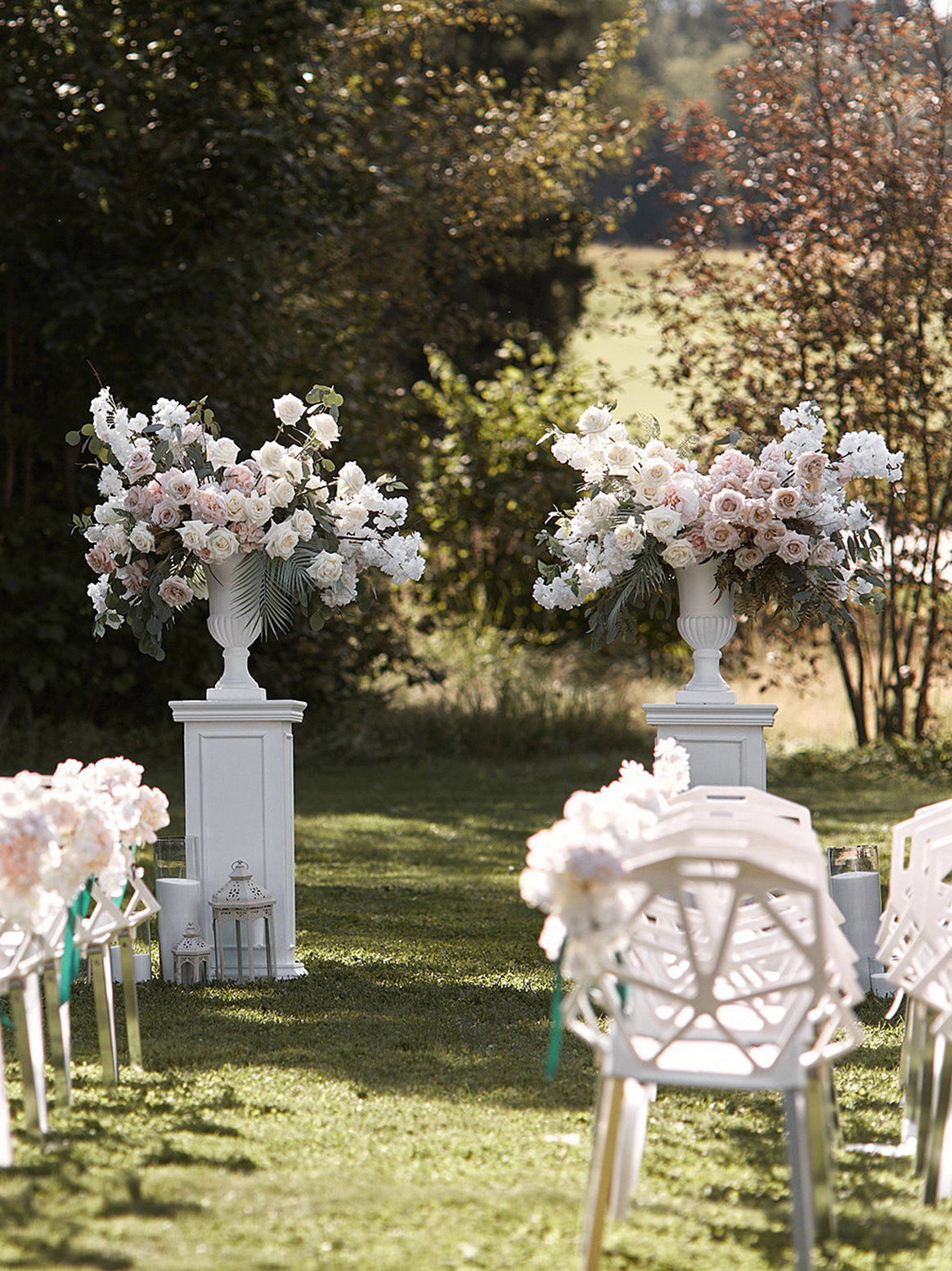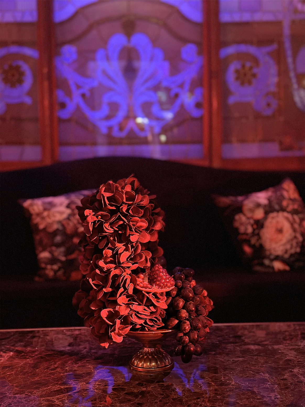 В контраст к этому мы ввели мягкую флористику в пудрово-молочных оттенках — как воплощение невесты: лёгкость, чувственность, эмоциональная глубина. Воздушные, струящиеся цветочные композиции перекликаются с пластикой её платья и смягчают графичность форм, создавая баланс между жёсткой геометрией и живым движением.