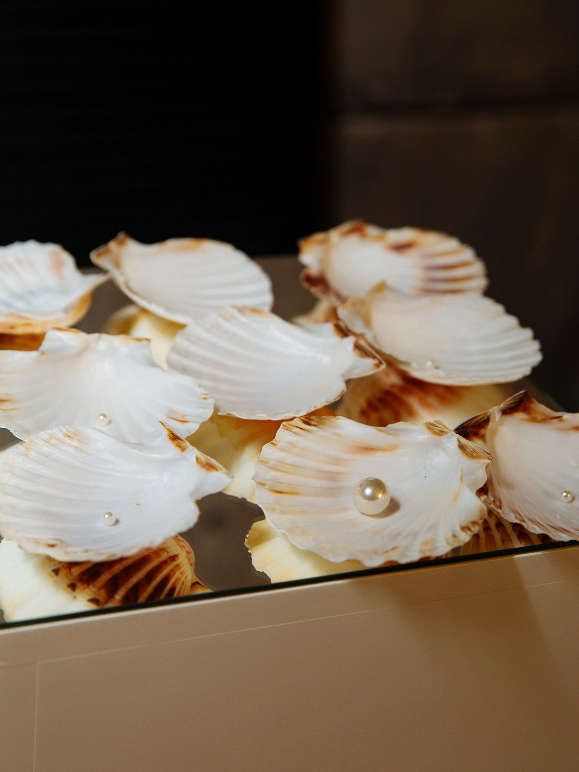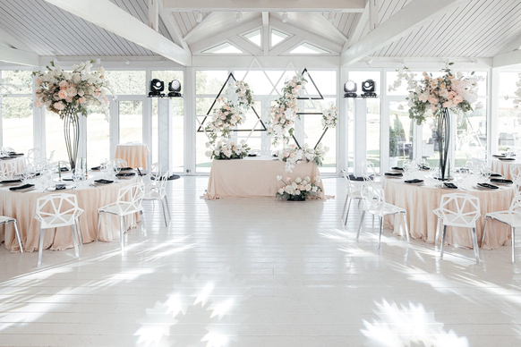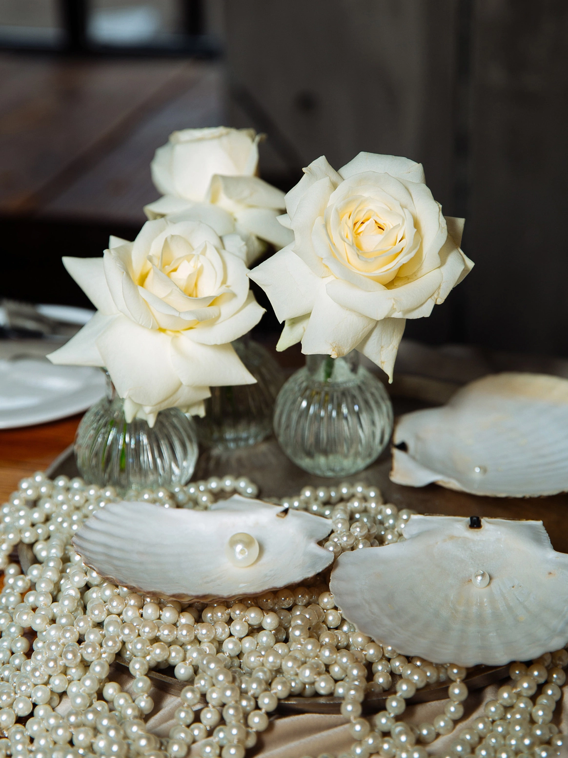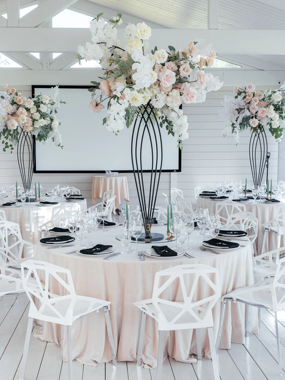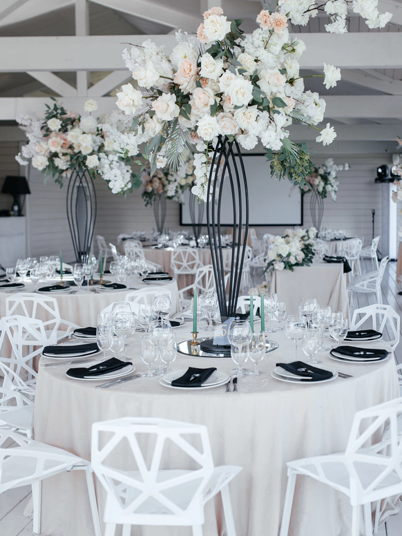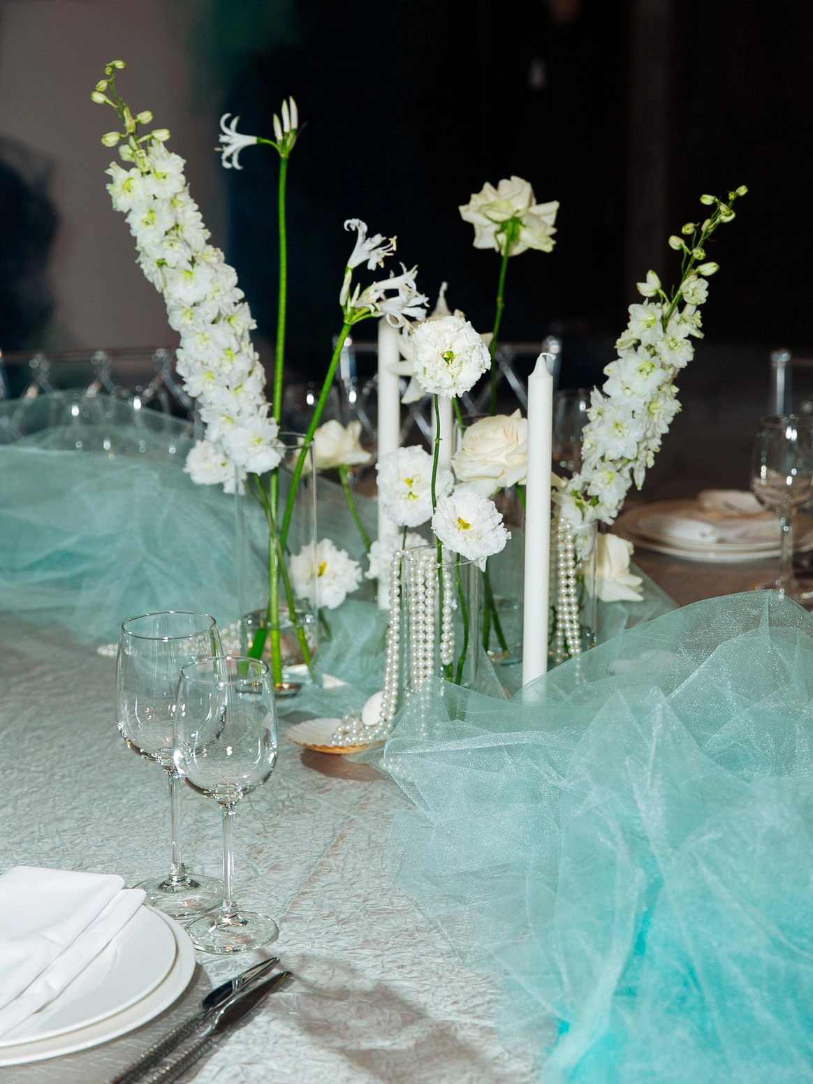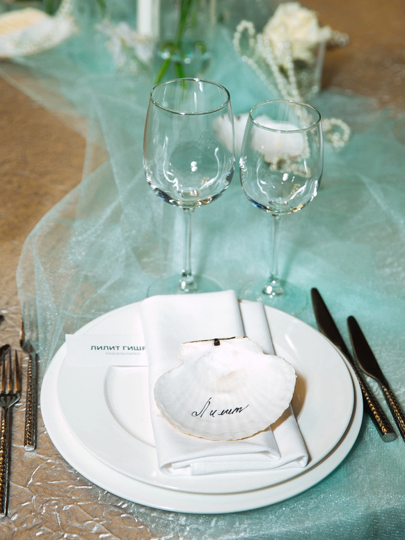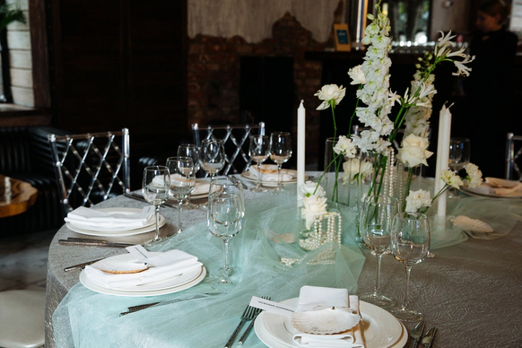 Столы стали метафорой берега. Полупрозрачная ткань ложилась на скатерти как морская пена, а вместе с волной на «сушу» были вынесены раковины, жемчуг и стеклянные формы. Белая флористика, устремлённая вверх из прозрачных цилиндров, напоминала всплеск воды, застывший в моменте.