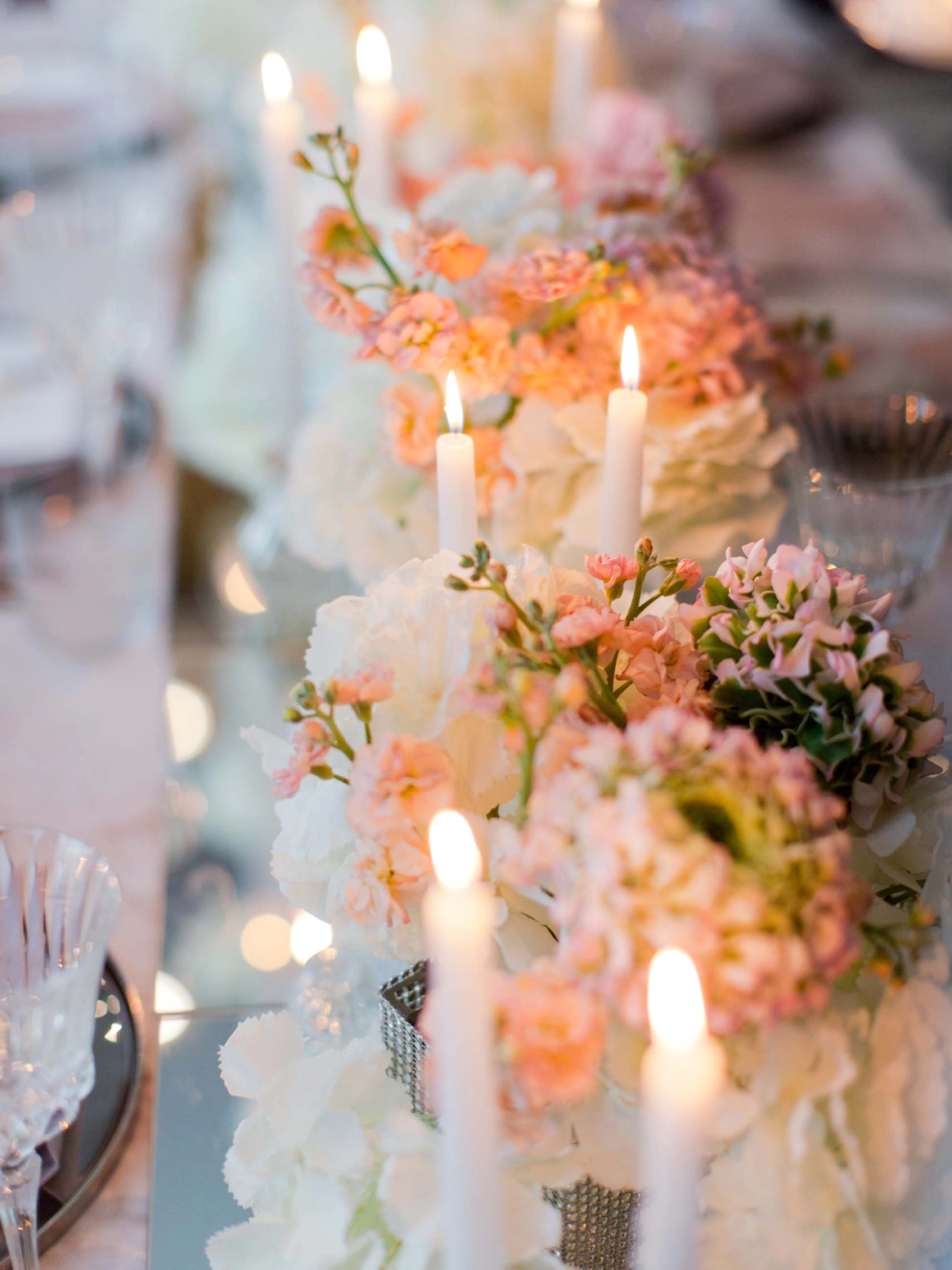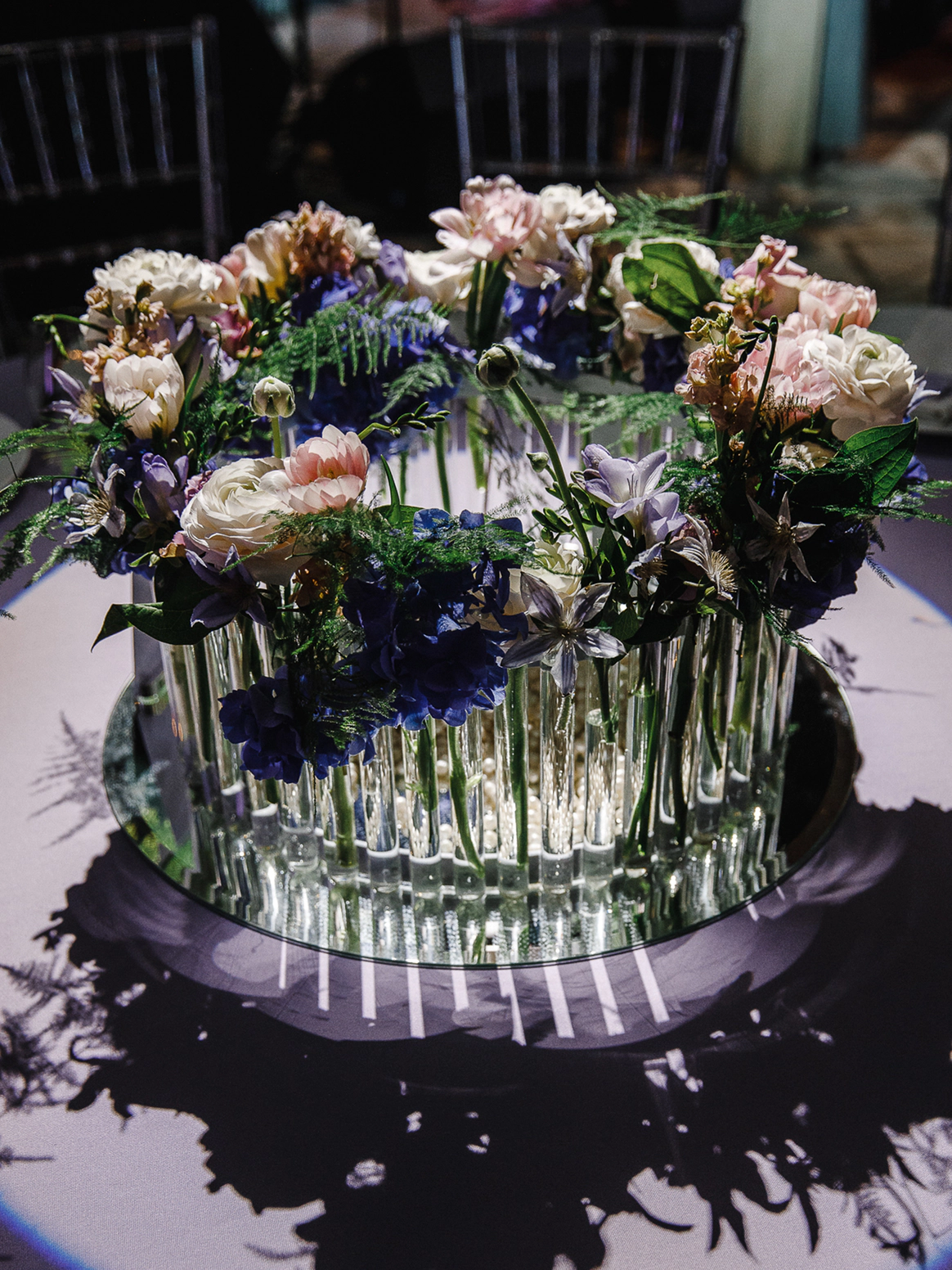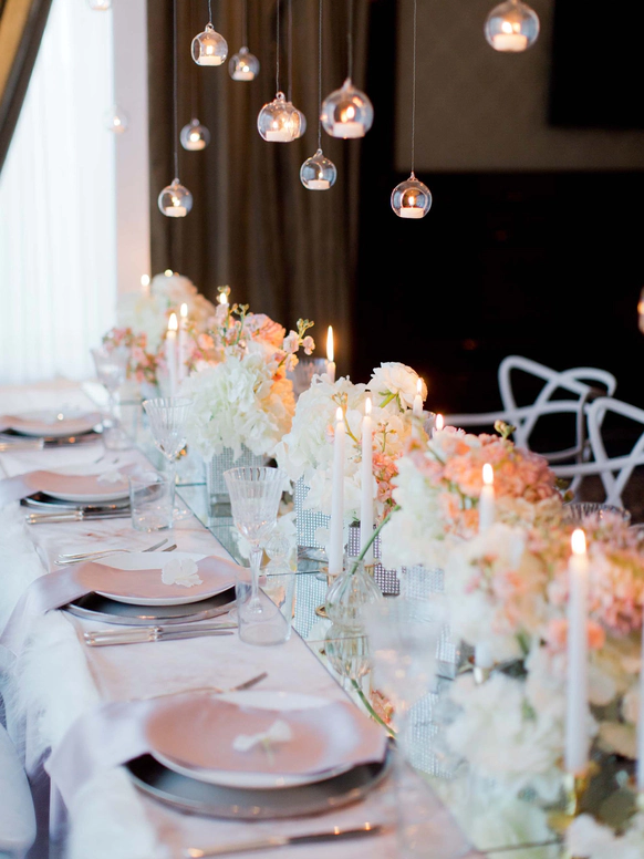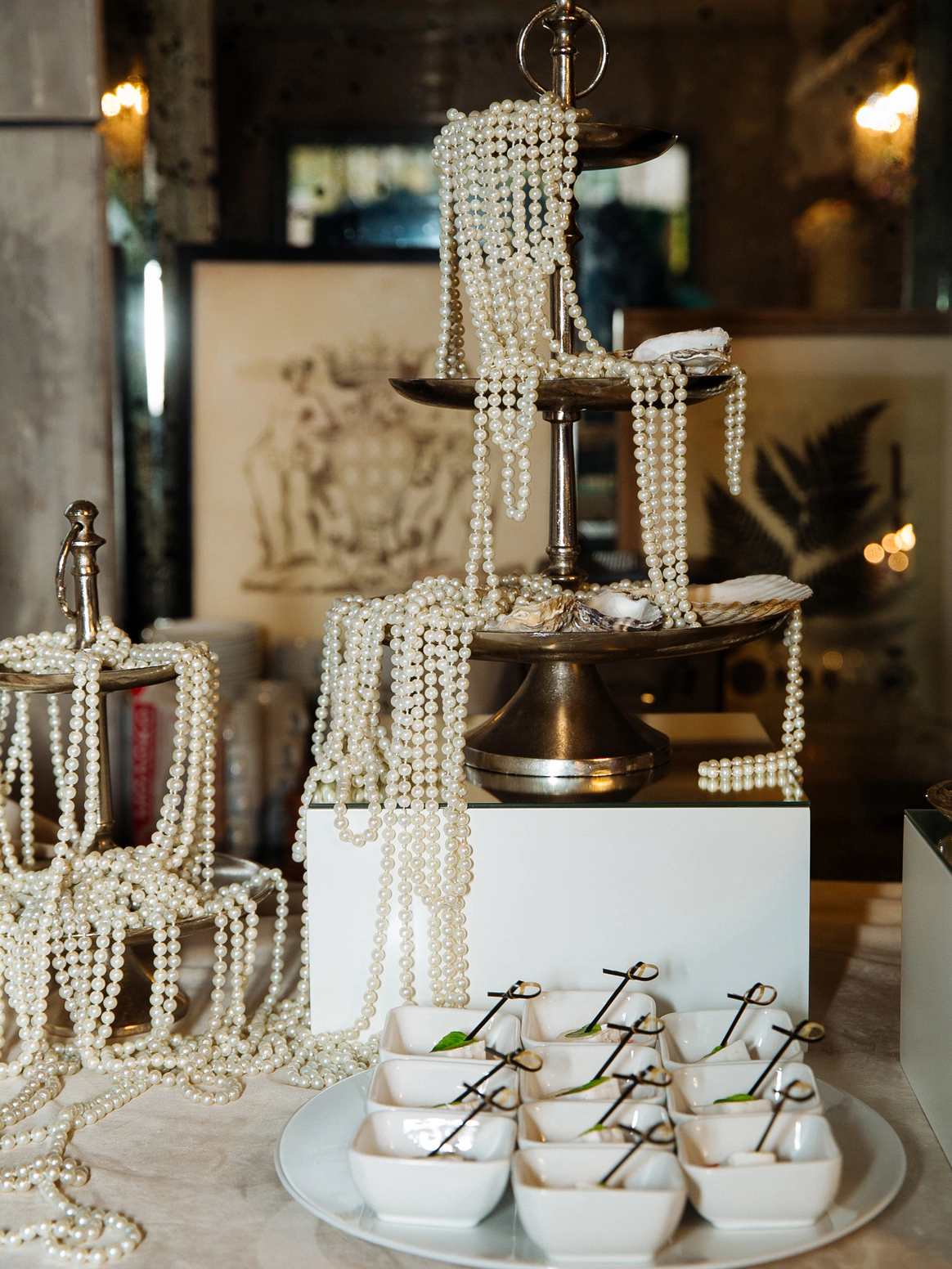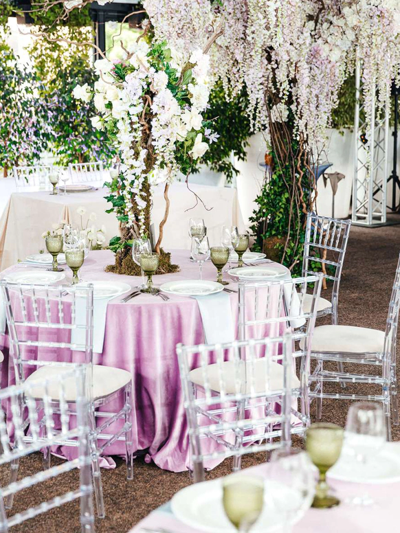 Столы стали метафорой берега. Полупрозрачная ткань ложилась на скатерти как морская пена, а вместе с волной на «сушу» были вынесены раковины, жемчуг и стеклянные формы. Белая флористика, устремлённая вверх из прозрачных цилиндров, напоминала всплеск воды, застывший в моменте.