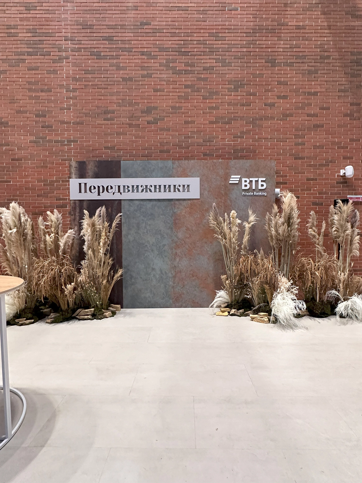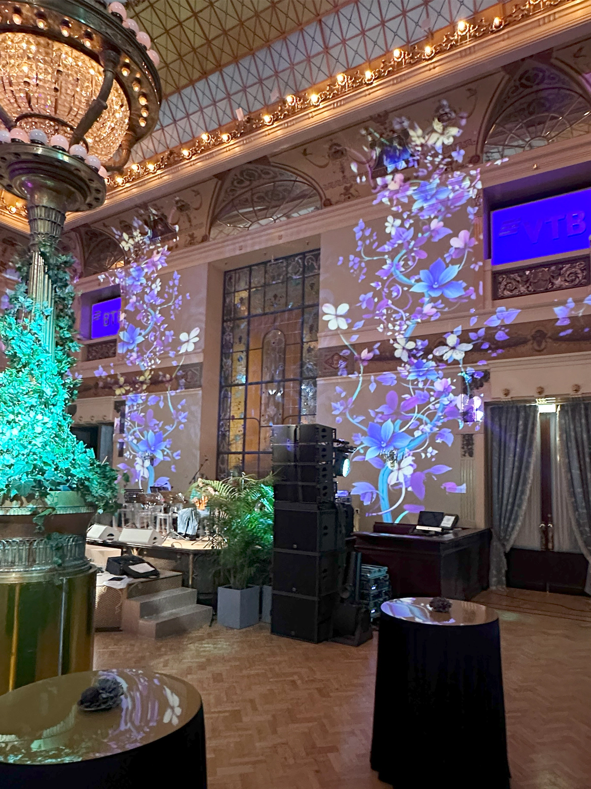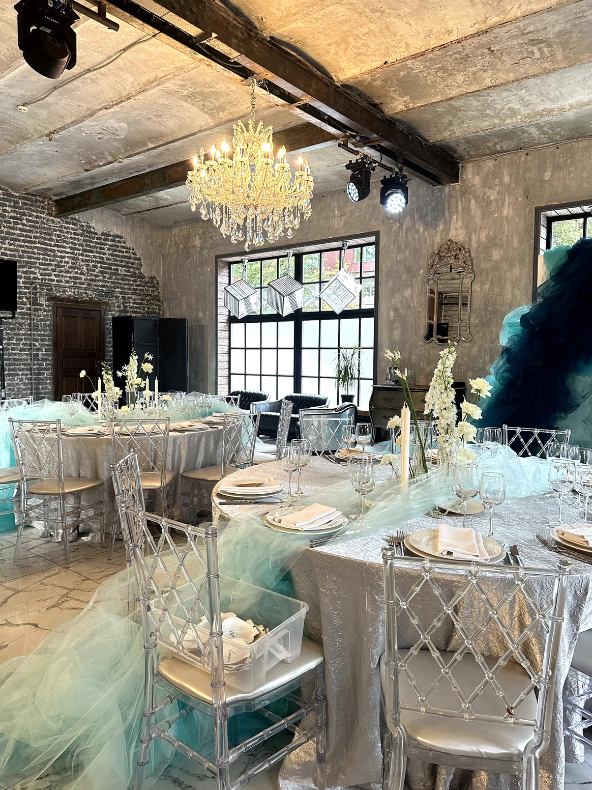 Центром композиции стала масштабная фотозона, имитирующая морскую пучину. Многослойный текстиль глубоких бирюзовых и сине-зелёных оттенков формировал живую волну — плотную в глубине и воздушную по краям. Инсталляция не ограничивалась задником: «волна» выходила в зал, создавая ощущение, что море разлилось внутри индустриального пространства.