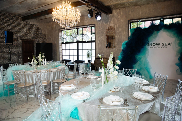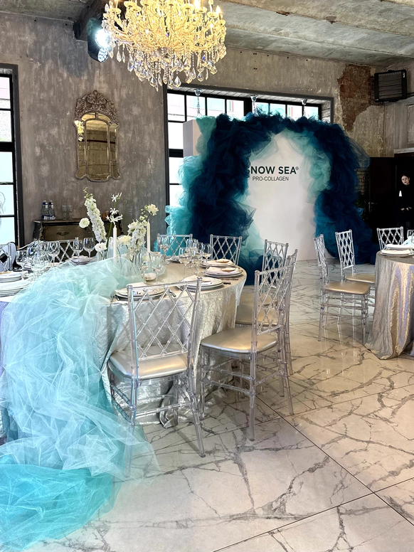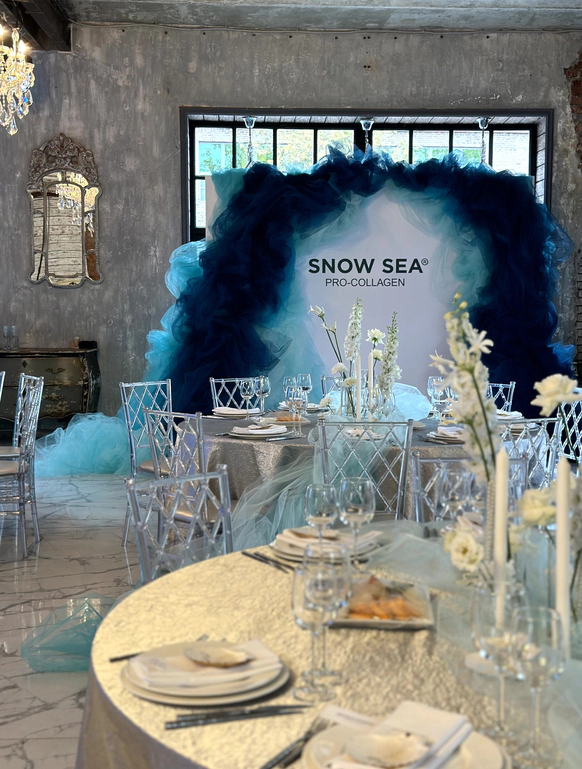 Этот проект — презентация новой линейки Snow Sea на основе ламинарии, созданная как иммерсивная среда бренда. Задача состояла не просто в оформлении мероприятия для блогеров и медиа, а в создании сильного визуального инфоповода: пространство должно было буквально погрузить гостей в стихию, из которой рождается продукт.