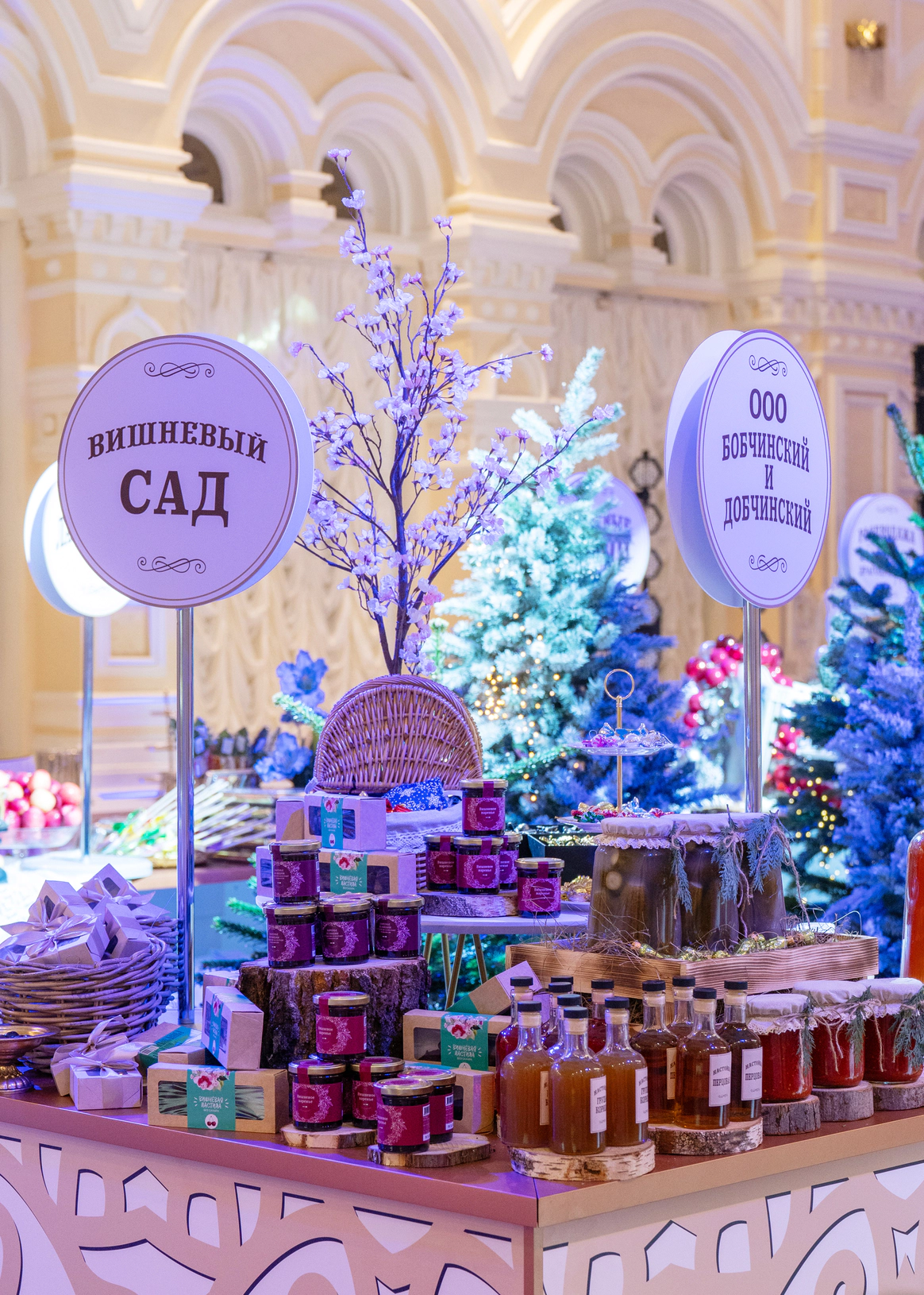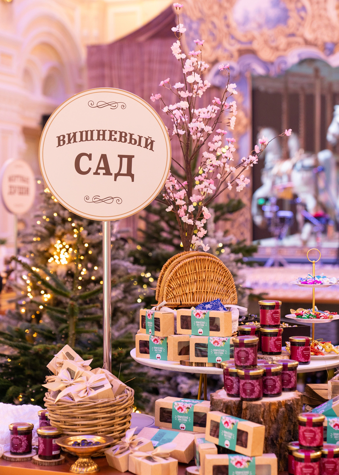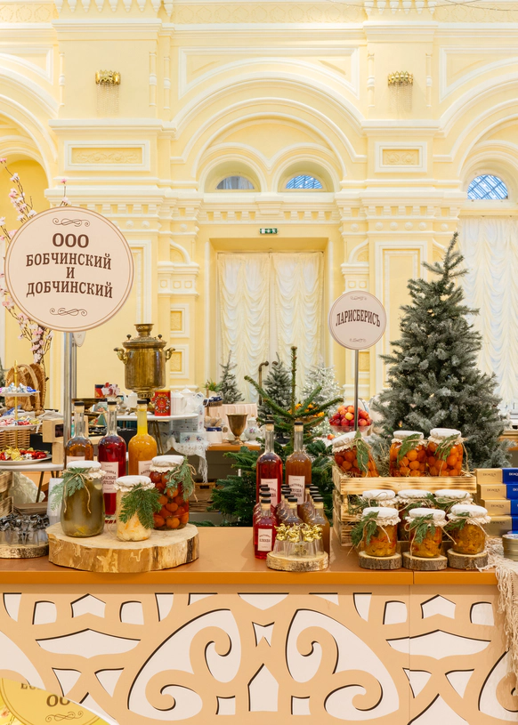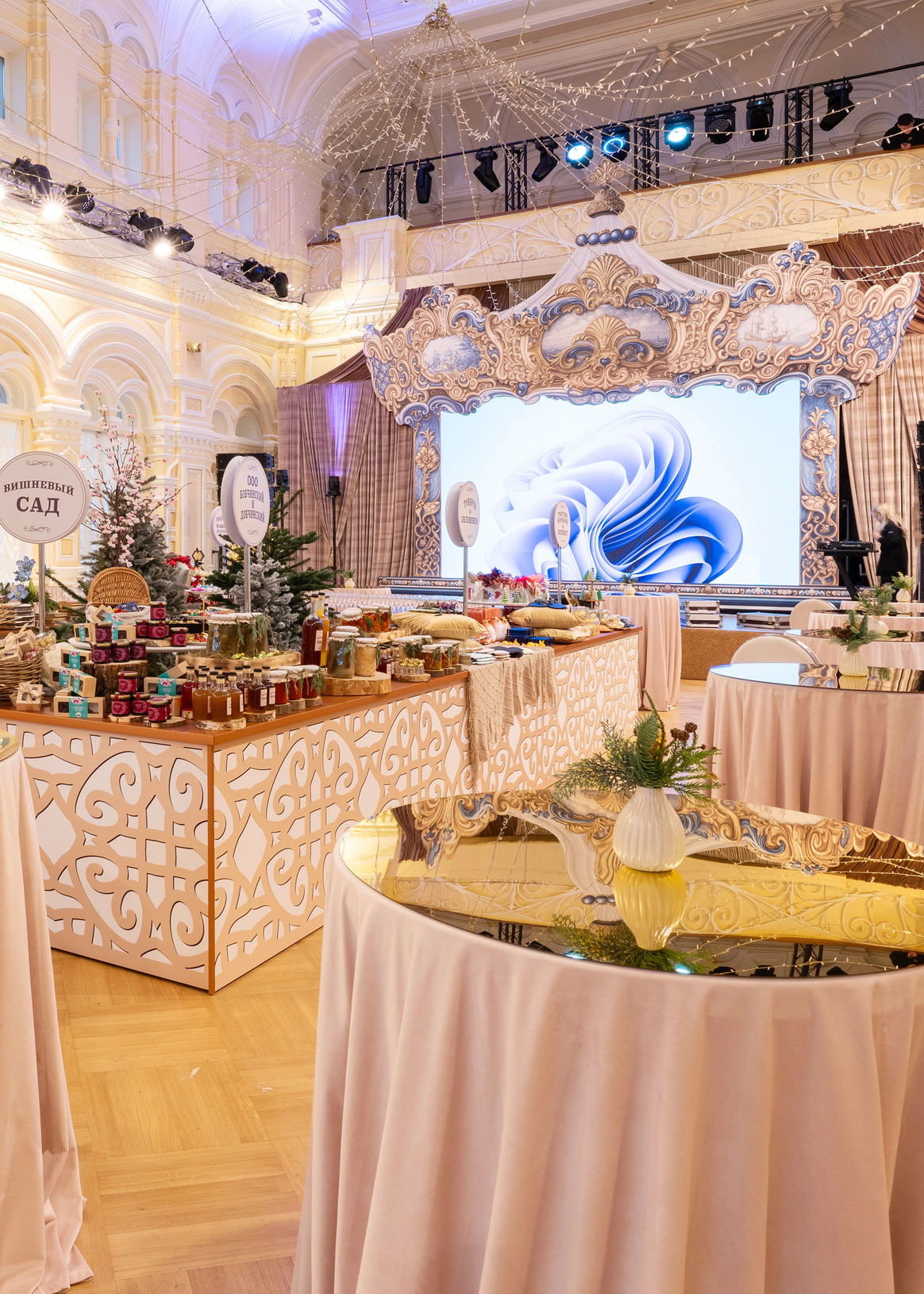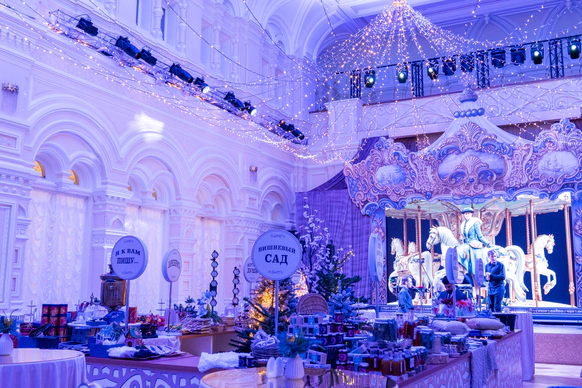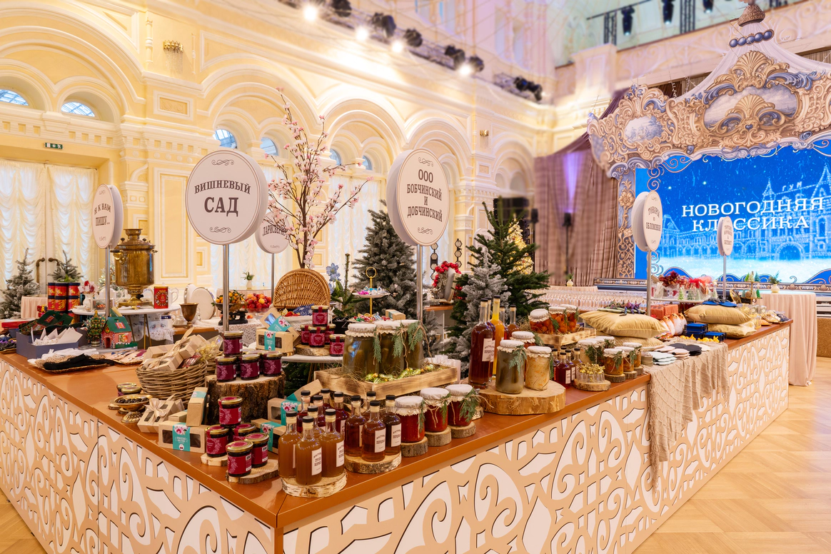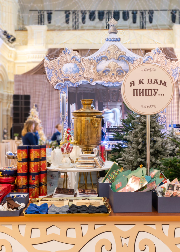 Центр зала заняли ярмарочные ряды, где классика стала интерактивной. Лавки получили названия по мотивам произведений русской литературы, а гости обменивали выданные на входе монеты на тематические подарки. Так культурный код превратился в игровую механику и вовлёк аудиторию в живой сценарий.