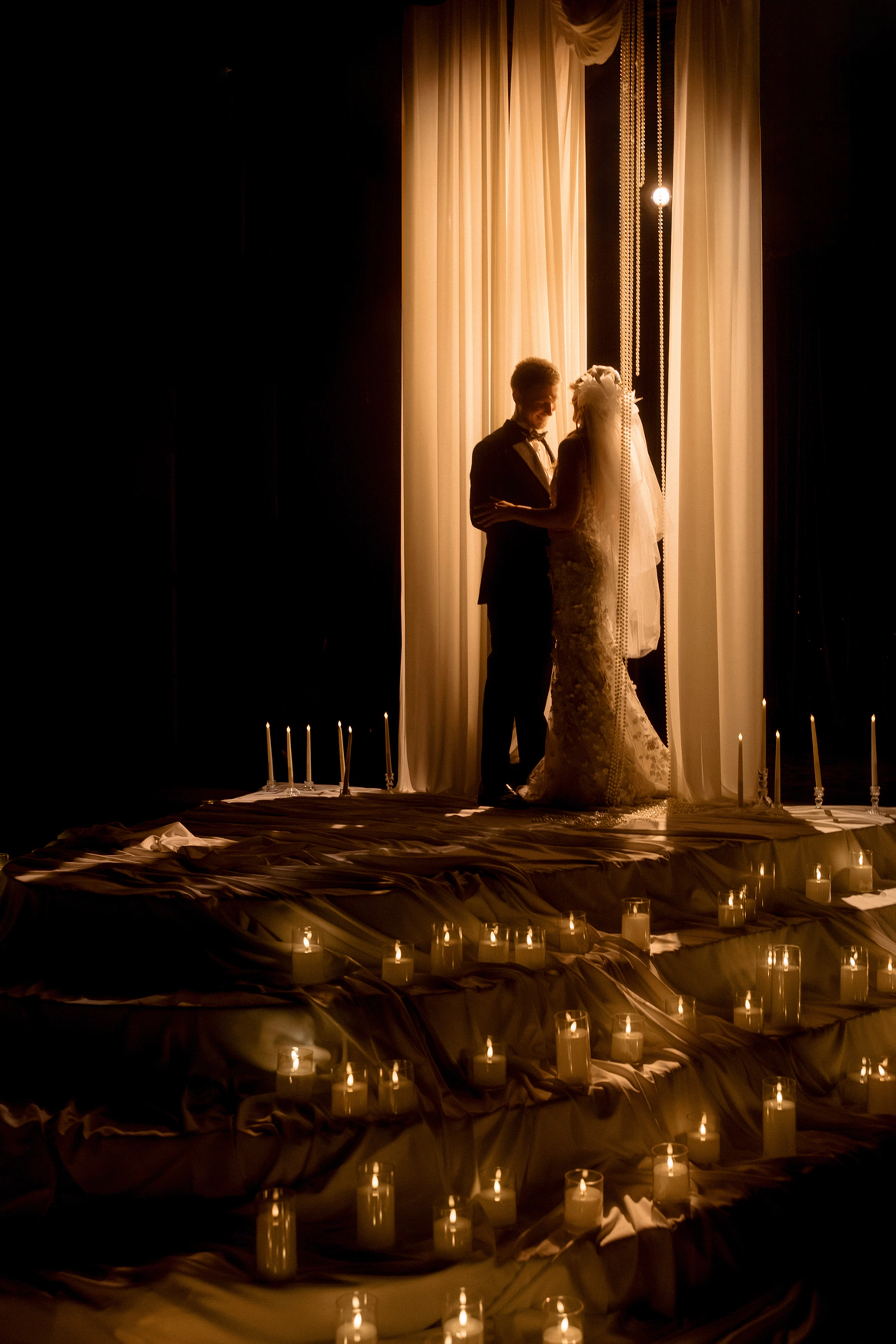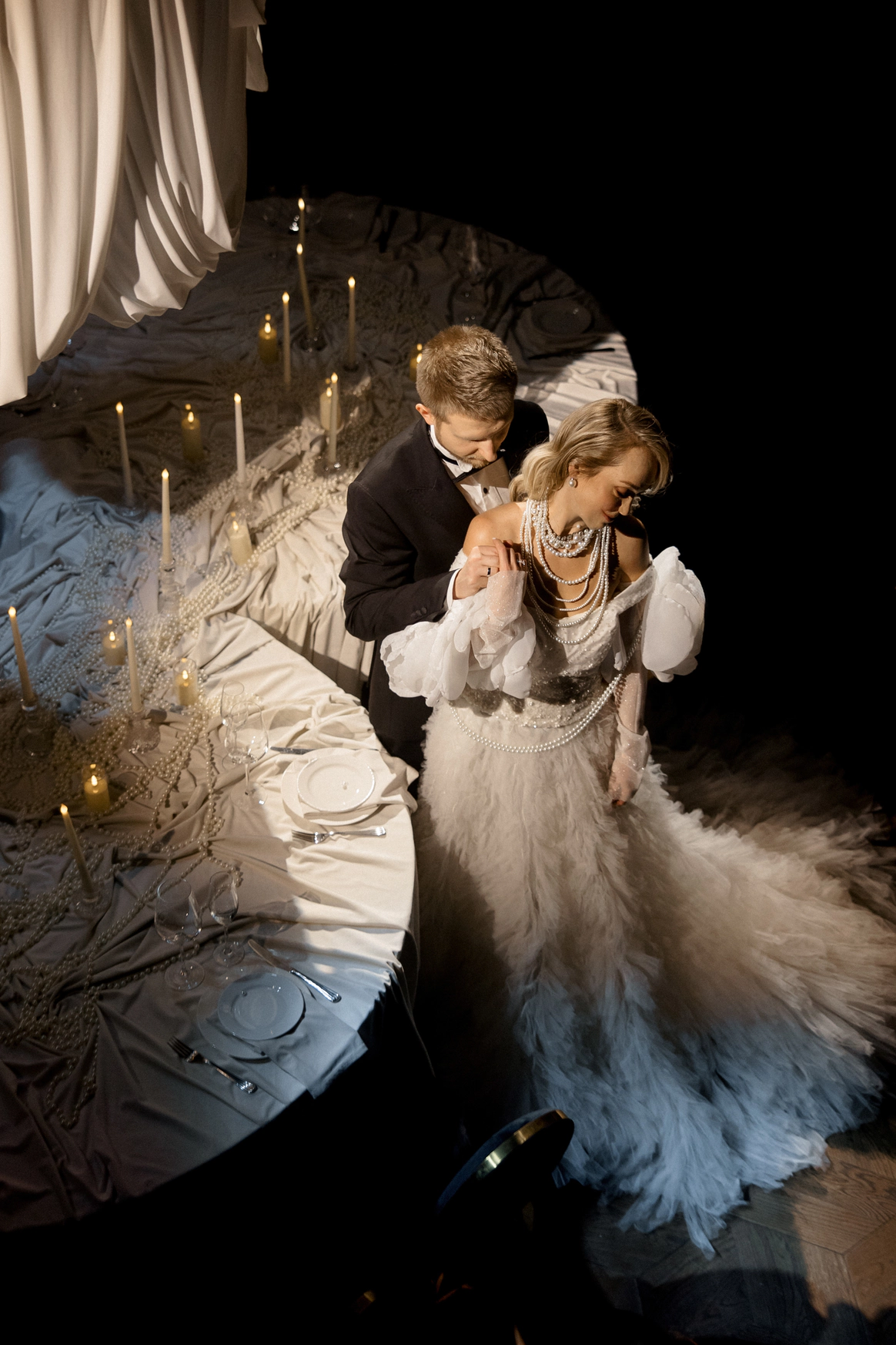 Концепцией вечера стало кружево. Ведь ниточки их судеб сплетались так долго и плотно, что стали напоминать красивую кружевную салфетку. Мы добавили элементы такого паттерна в арку, декор и платья невесты, что позволило создать единую картинку.