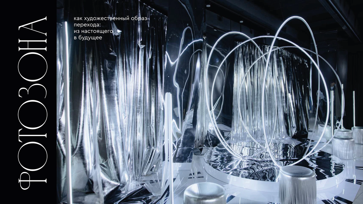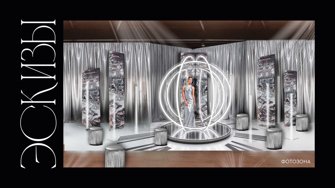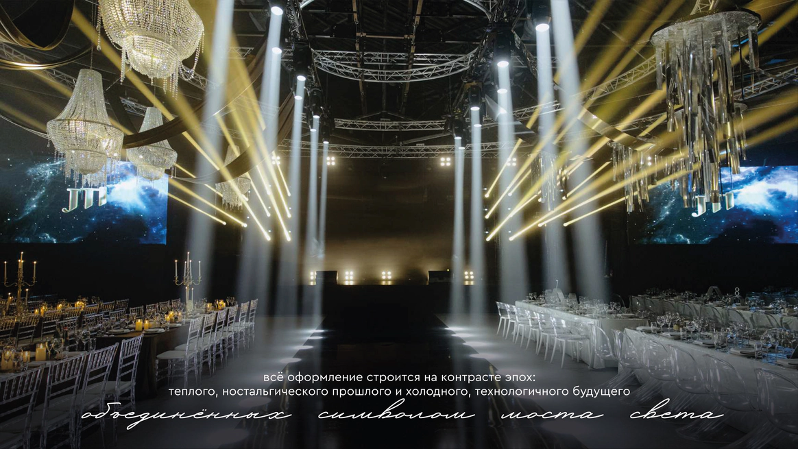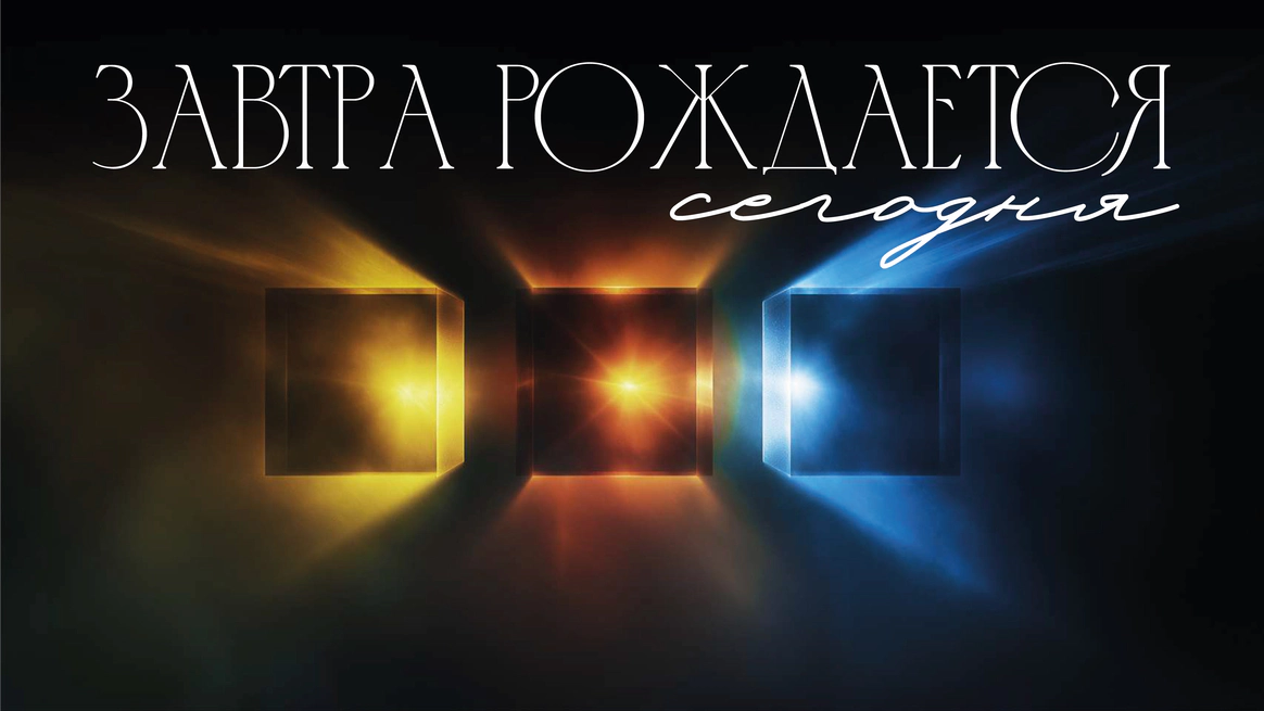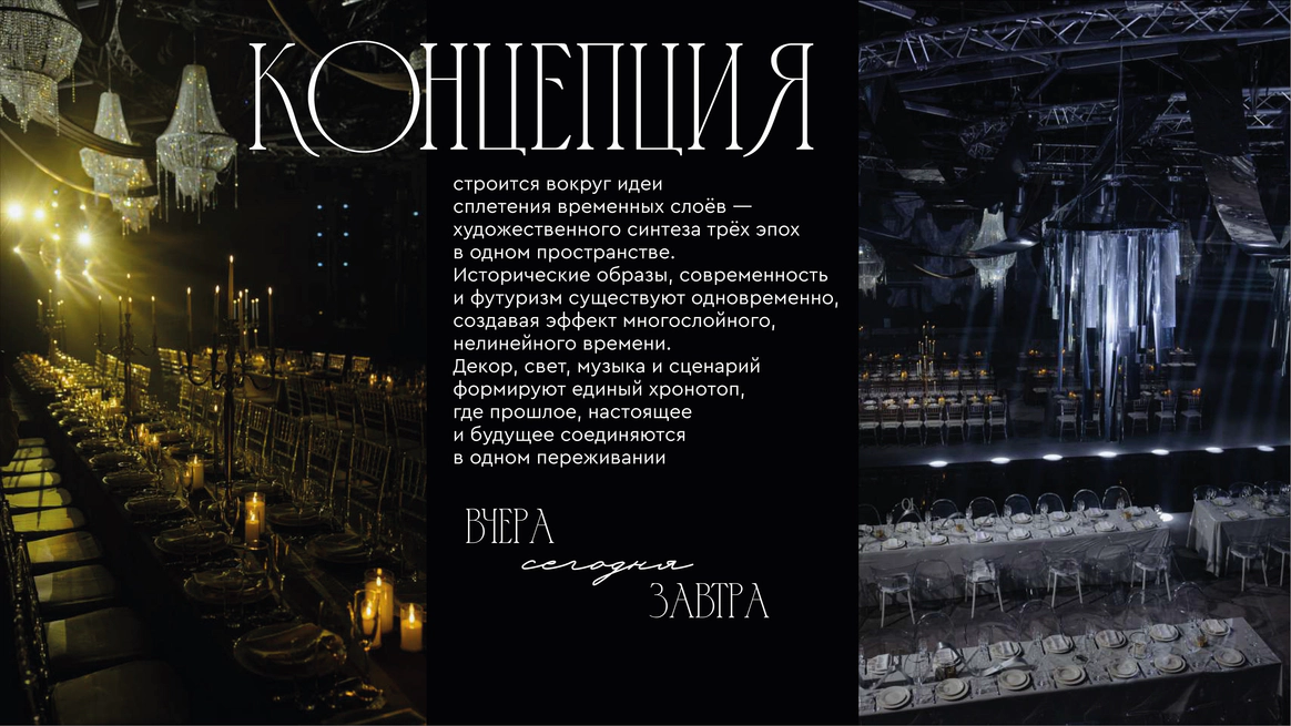 Прошлое было раскрыто через тёплую глубину фактур, настоящее — через строгую структуру, будущее — через свет и технологичную графику линий. Контраст эпох стал образом движения и развития.