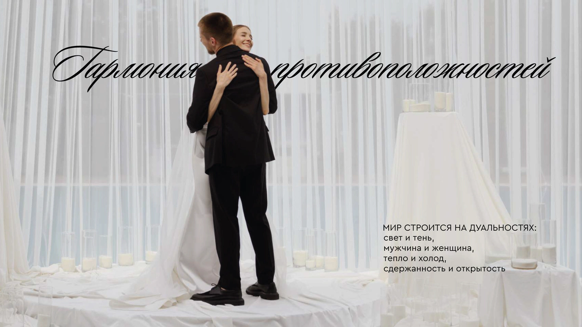 Жених — не фон и не опора в тени. Он партнёр в этом напряжении. Их союз — не про сглаживание углов, а про притяжение двух противоположностей.