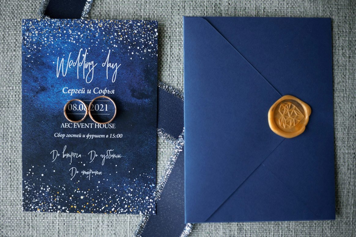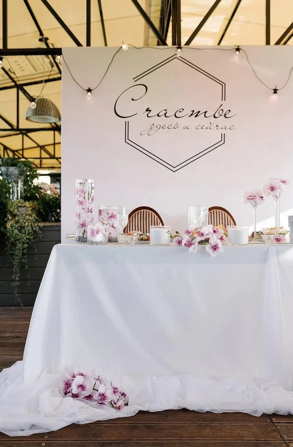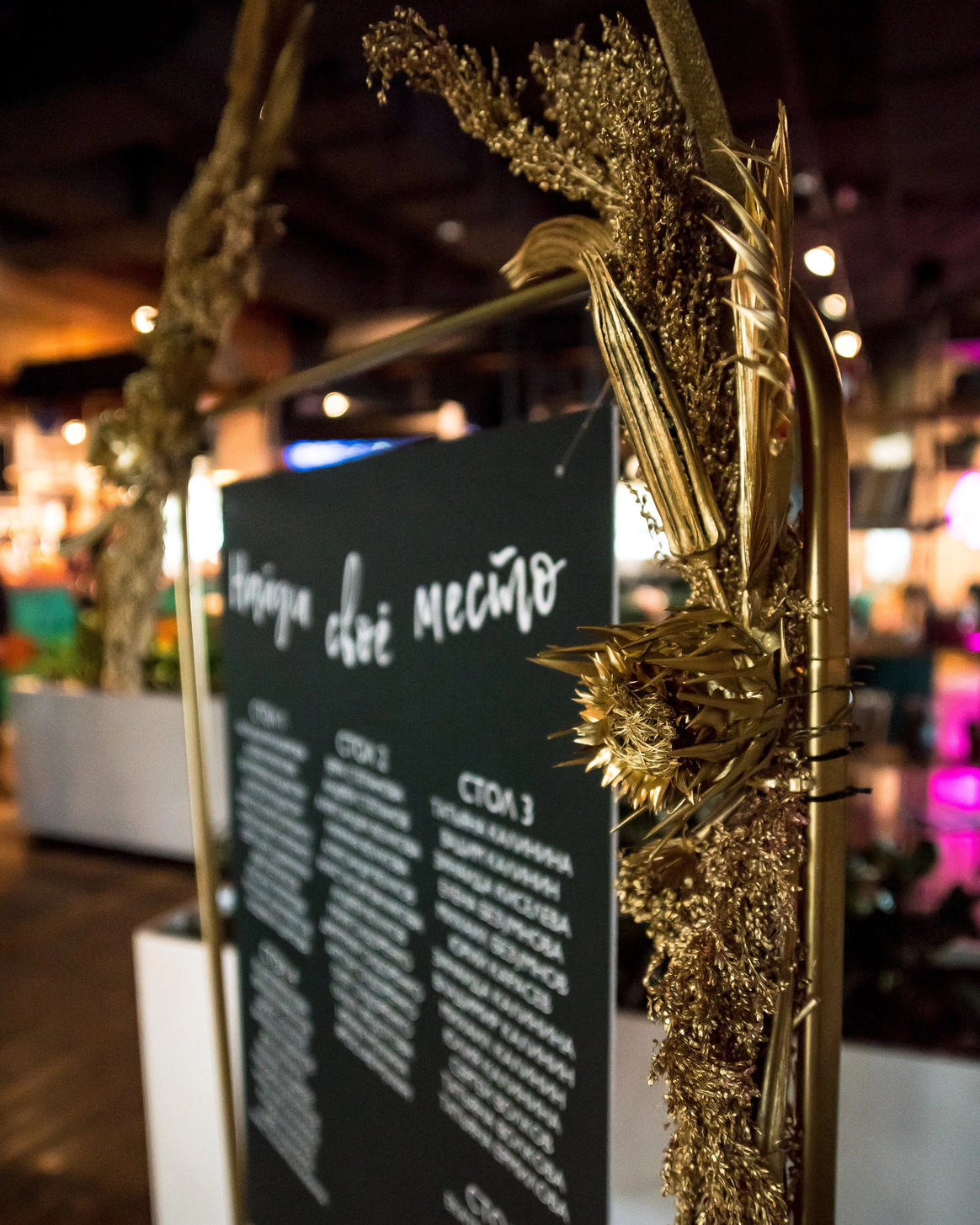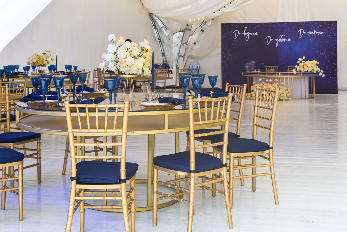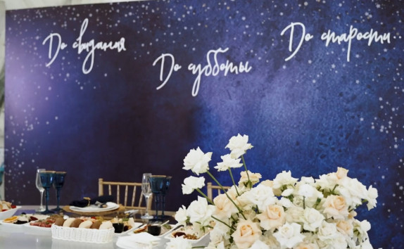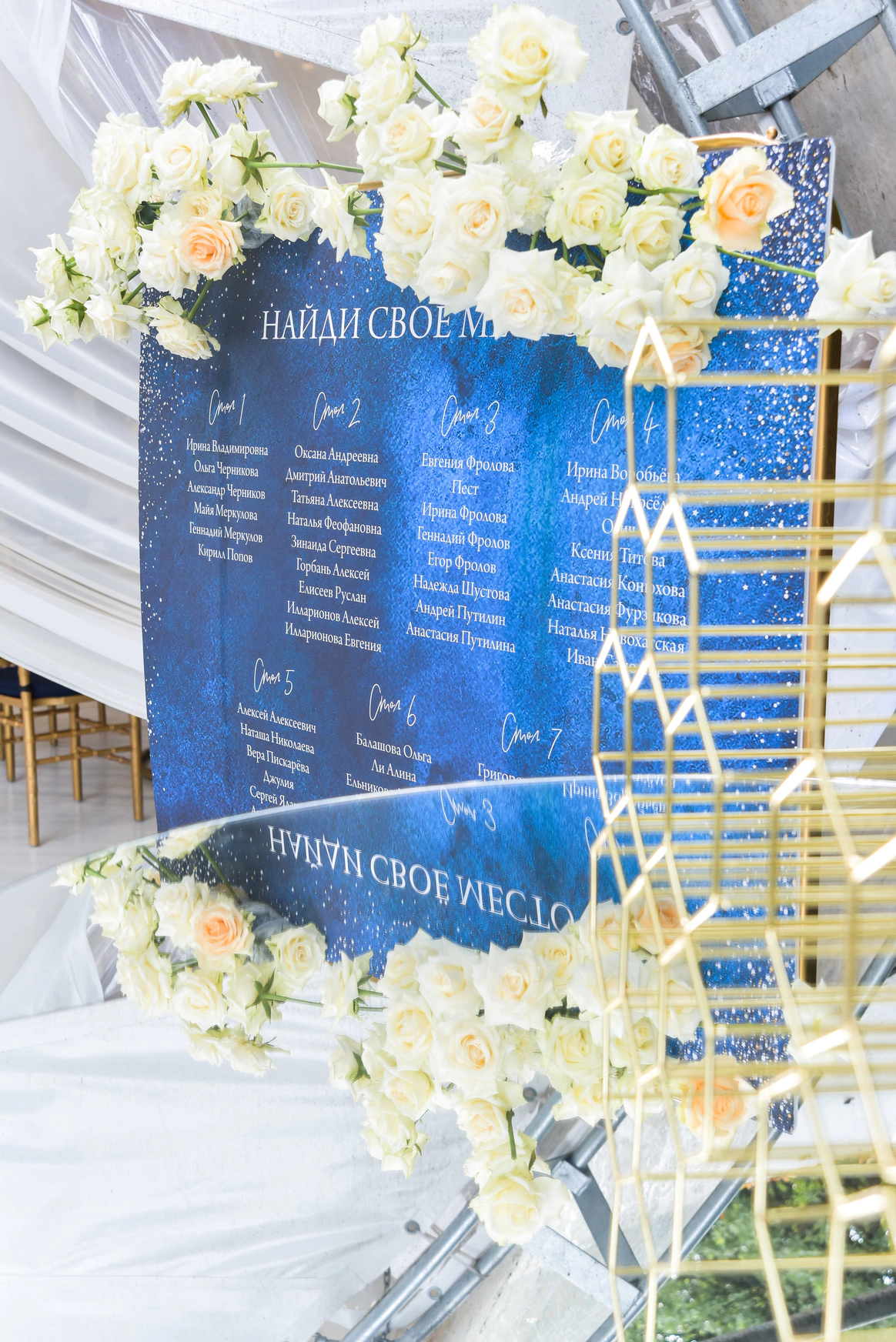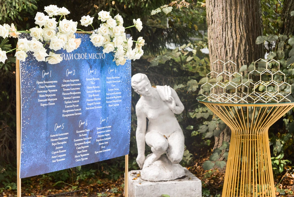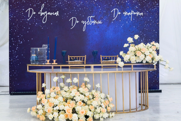 - До свидания - До субботы - До старости Так закончилась первая переписка Сергея и Софьи. Узнав это и увидев безмерно влюбленных ребят, появилась концепция свадьбы - «до бесконечности». Основными цветами в декоре стали глубокий синий и благородное золото, олицетворяющие бесконечную вселенную и звезды. Цветочные композиции из роз, золотые голые столы и янтарные стулья с синими подушками, сервировка, полиграфия и многие другие детали - все это стало воплощением четкой геометрии созвездий и хаоса звезд. Зона выездной регистрации продолжает тему бесконечности вселенной. Великолепная золотая конструкция с композициями из живых роз, диантуса и гортензии,образующими арку, стала символом небосвода на выездной регистрации Сергея и Софьи. Ярким вечерним акцентом стала неоновая вывеска, созданная по макету жениха, и олицетворяющая вечность чувств Софьи и Сергея.