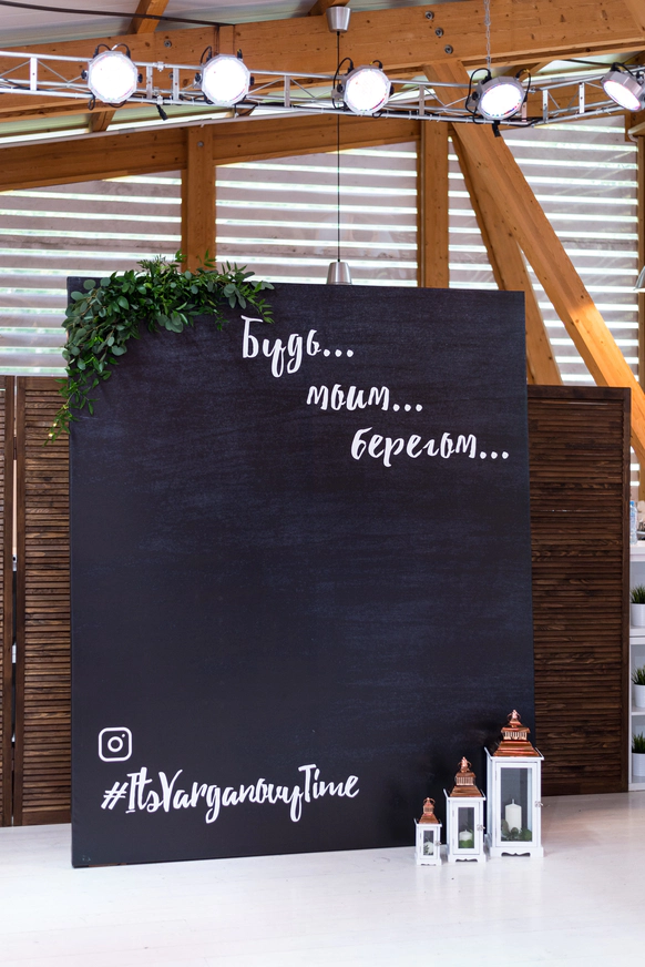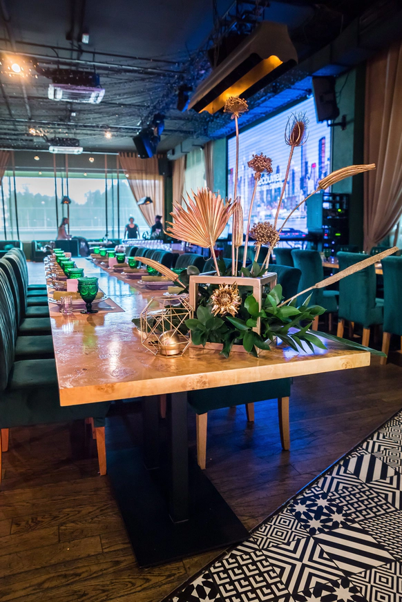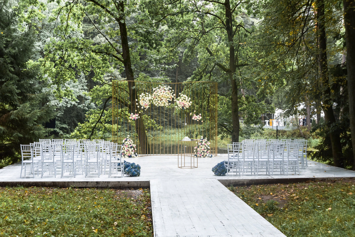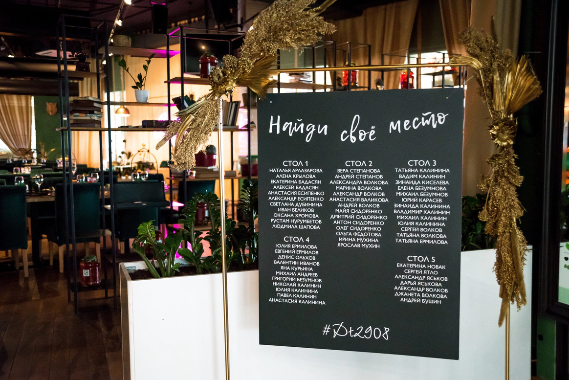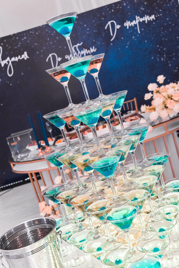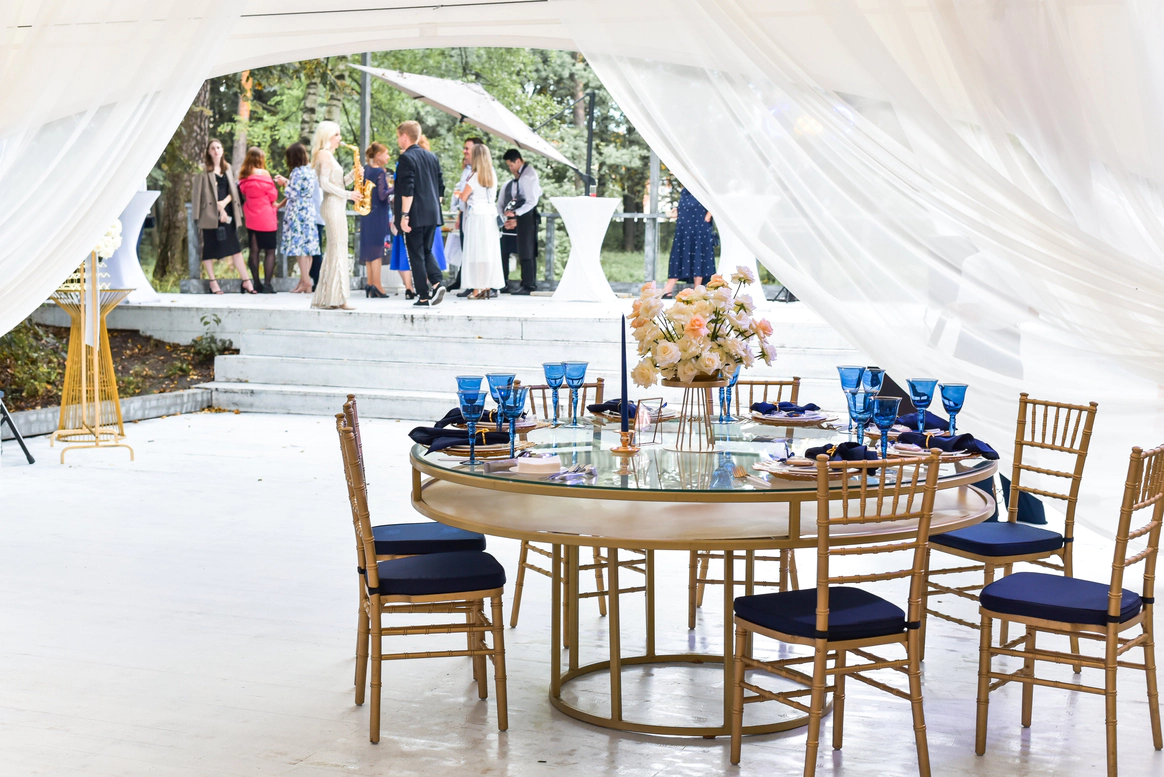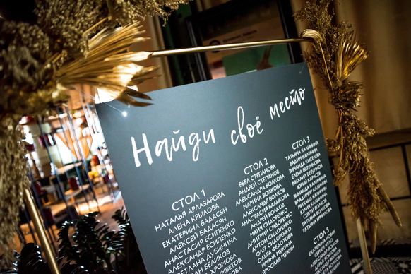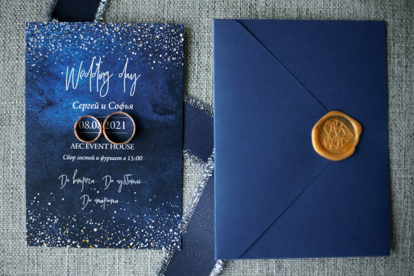 - До свидания - До субботы - До старости Так закончилась первая переписка Сергея и Софьи. Узнав это и увидев безмерно влюбленных ребят, появилась концепция свадьбы - «до бесконечности». Основными цветами в декоре стали глубокий синий и благородное золото, олицетворяющие бесконечную вселенную и звезды. Цветочные композиции из роз, золотые голые столы и янтарные стулья с синими подушками, сервировка, полиграфия и многие другие детали - все это стало воплощением четкой геометрии созвездий и хаоса звезд. Зона выездной регистрации продолжает тему бесконечности вселенной. Великолепная золотая конструкция с композициями из живых роз, диантуса и гортензии,образующими арку, стала символом небосвода на выездной регистрации Сергея и Софьи. Ярким вечерним акцентом стала неоновая вывеска, созданная по макету жениха, и олицетворяющая вечность чувств Софьи и Сергея.