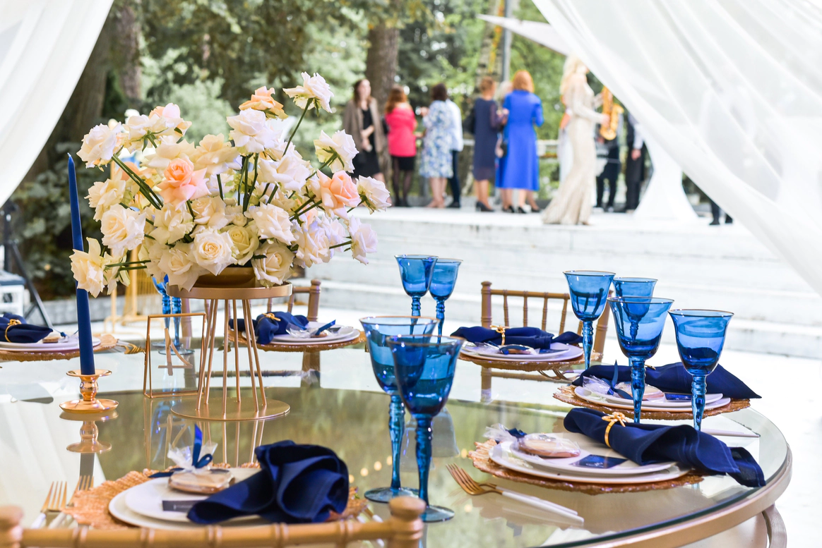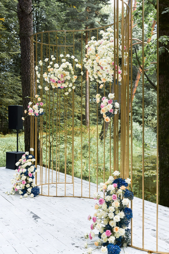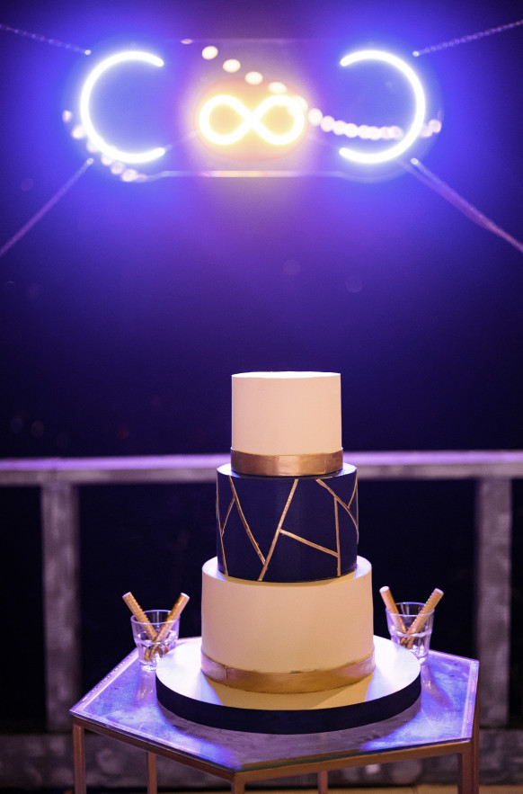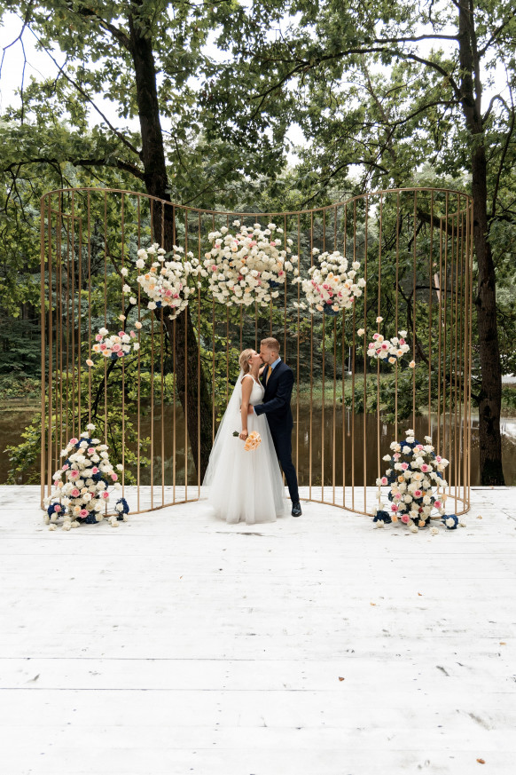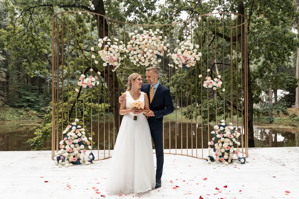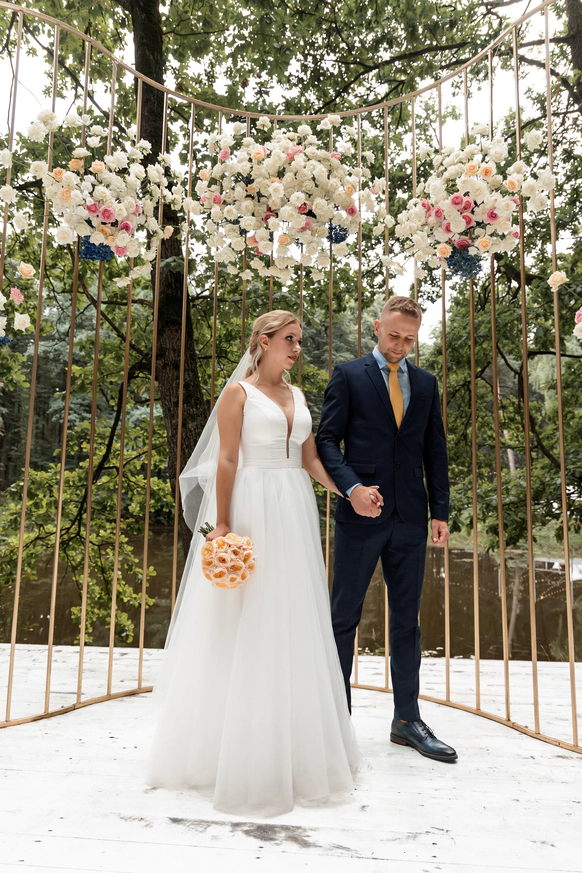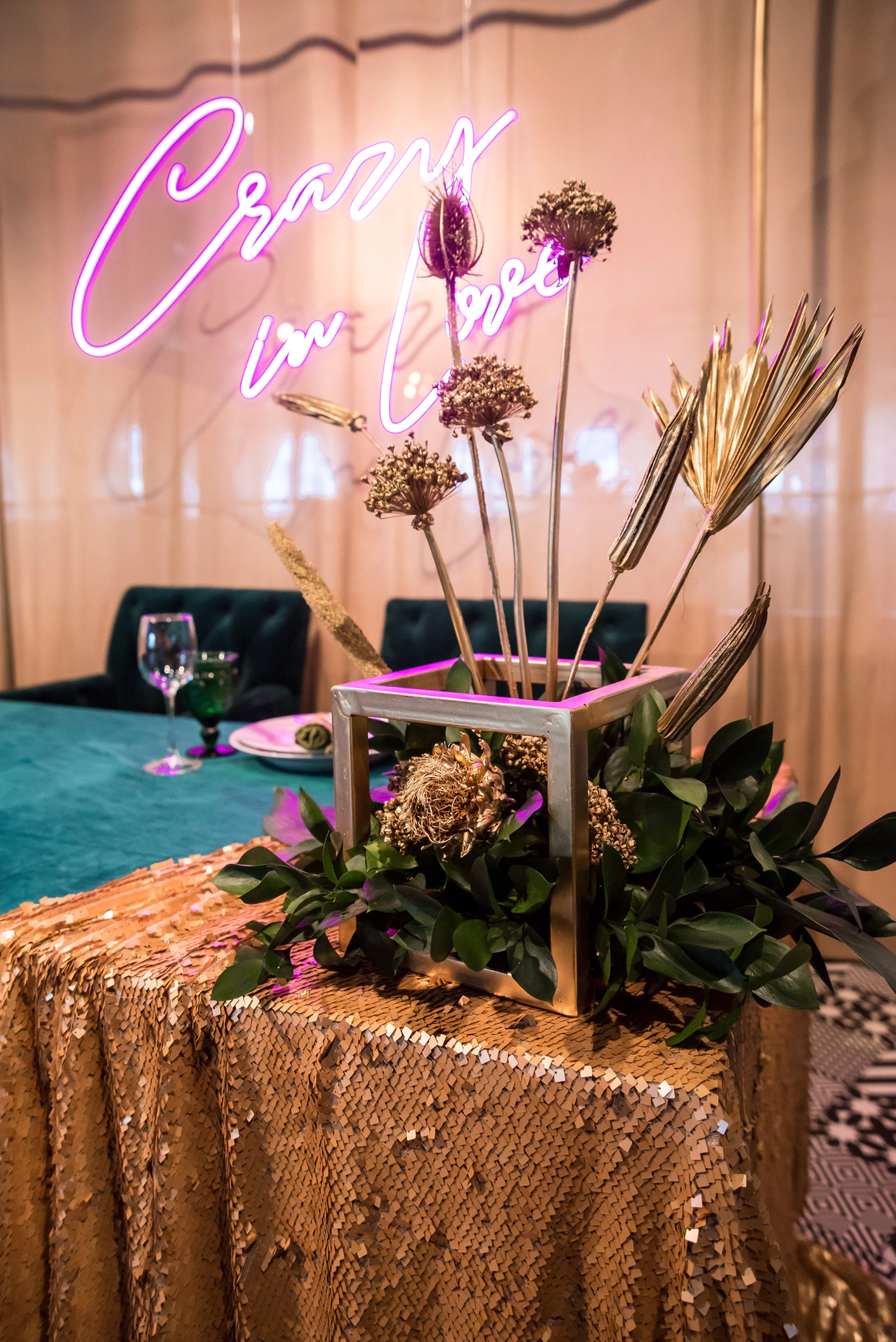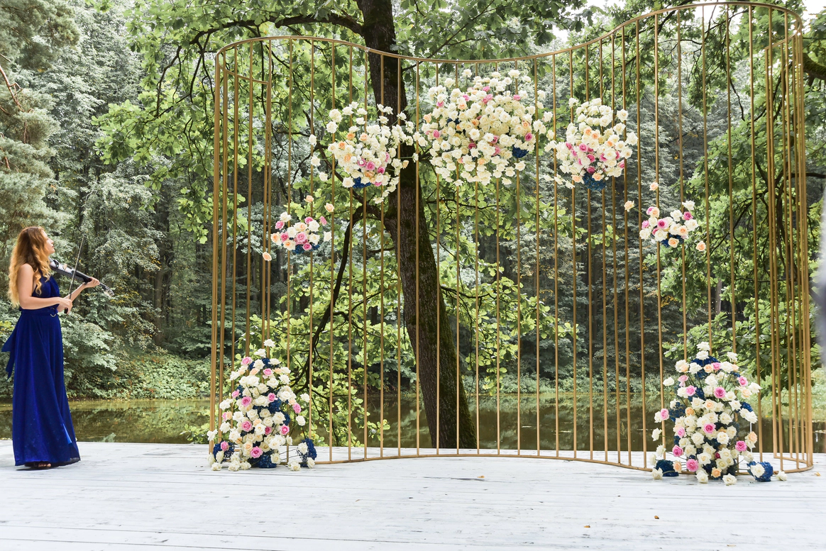 - До свидания - До субботы - До старости Так закончилась первая переписка Сергея и Софьи. Узнав это и увидев безмерно влюбленных ребят, появилась концепция свадьбы - «до бесконечности». Основными цветами в декоре стали глубокий синий и благородное золото, олицетворяющие бесконечную вселенную и звезды. Цветочные композиции из роз, золотые голые столы и янтарные стулья с синими подушками, сервировка, полиграфия и многие другие детали - все это стало воплощением четкой геометрии созвездий и хаоса звезд. Зона выездной регистрации продолжает тему бесконечности вселенной. Великолепная золотая конструкция с композициями из живых роз, диантуса и гортензии,образующими арку, стала символом небосвода на выездной регистрации Сергея и Софьи. Ярким вечерним акцентом стала неоновая вывеска, созданная по макету жениха, и олицетворяющая вечность чувств Софьи и Сергея.