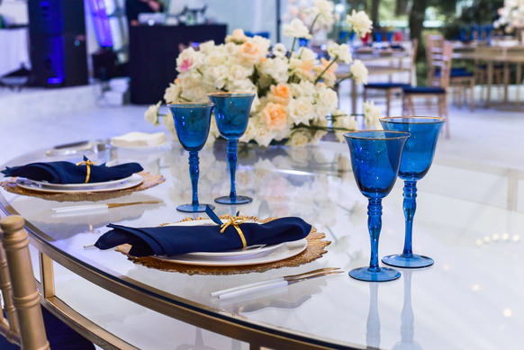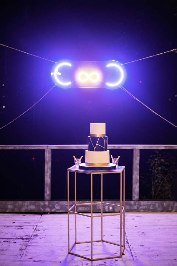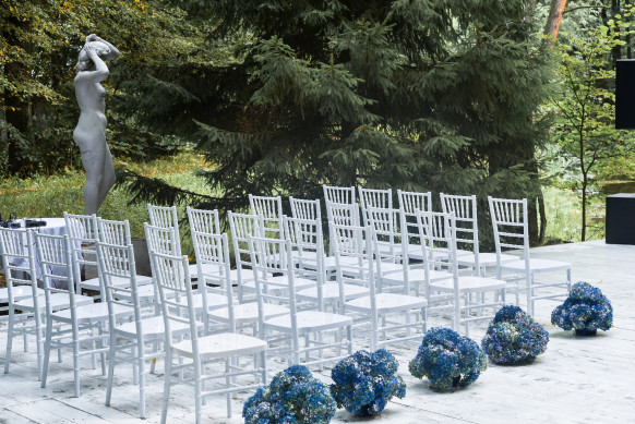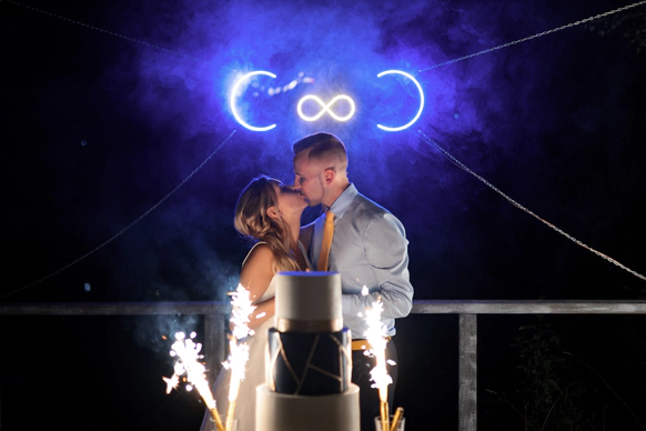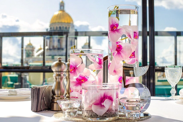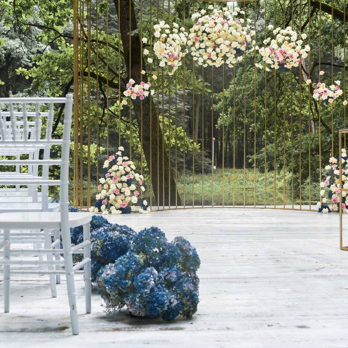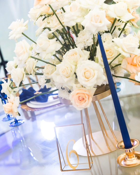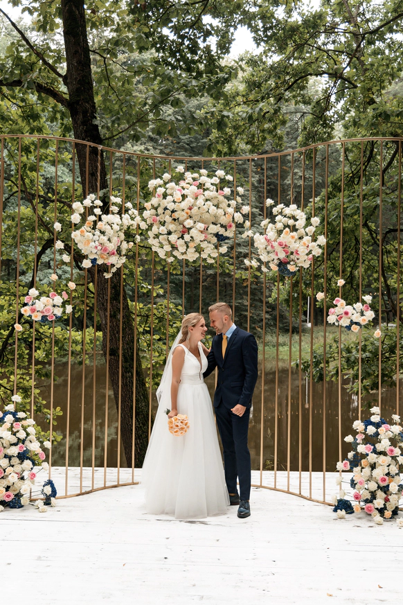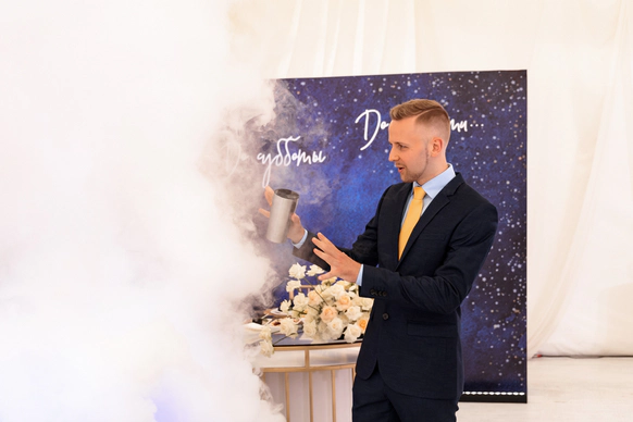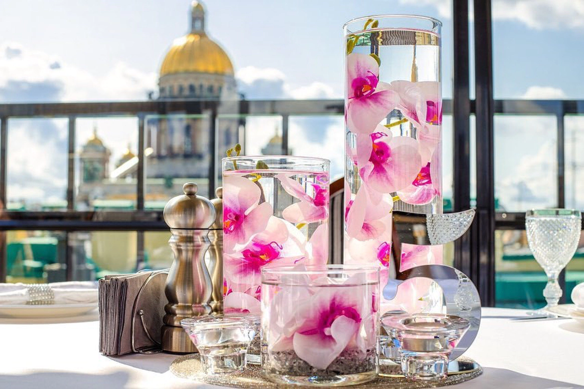 - До свидания - До субботы - До старости Так закончилась первая переписка Сергея и Софьи. Узнав это и увидев безмерно влюбленных ребят, появилась концепция свадьбы - «до бесконечности». Основными цветами в декоре стали глубокий синий и благородное золото, олицетворяющие бесконечную вселенную и звезды. Цветочные композиции из роз, золотые голые столы и янтарные стулья с синими подушками, сервировка, полиграфия и многие другие детали - все это стало воплощением четкой геометрии созвездий и хаоса звезд. Зона выездной регистрации продолжает тему бесконечности вселенной. Великолепная золотая конструкция с композициями из живых роз, диантуса и гортензии,образующими арку, стала символом небосвода на выездной регистрации Сергея и Софьи. Ярким вечерним акцентом стала неоновая вывеска, созданная по макету жениха, и олицетворяющая вечность чувств Софьи и Сергея.