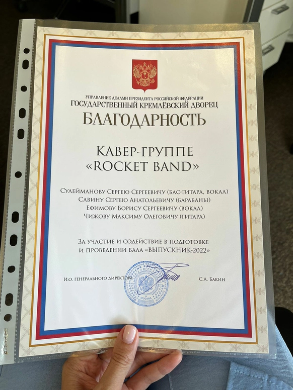 Всем привет это кавер группа “Rocket Band” г.Москва Мы занимаемся тем, что любим и любим то, что делаем! Естественно, как любая уважающая себя и вас группа, мы исполняем Районы-кварталы и Хали-Гали, но в своих ремиксах🤘 Главный вокалист нашей команды Борис Ефимов, конечно же, участник проекта «Голос» 13 сезон, а так же проектов «X Фактор» и «Главная сцена». Остальные участники нашего бэнда, Сулейманов Сергей, Савин Сергей, Чижов Максим - отъявленные музыканты и конечно же все работают со звездами нашей эстрады. Пока что в нашей копилке: Стас Пьеха, ВиаГра, MBAND, Glukoza, Хаммали&Наваи, TSOY💥 Мы выступали в Лужниках в 2021 году, аж целых 3 дня подряд, на чемпионате мира по футболу, но только пляжному) Мы оч любим людей и поэтому практически каждый год, за благодарность☝️, составляем компанию выпускникам в Государственном Кремлёвском Дворце) Мы хорошие и работаем с огоньком, и как сказал Сократ, когда мы выступали на очередном выпускном его академии ведущих: «Просто заберите их!»
