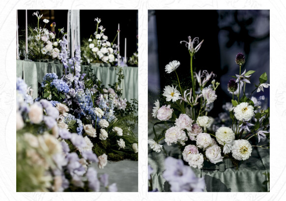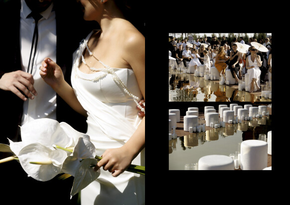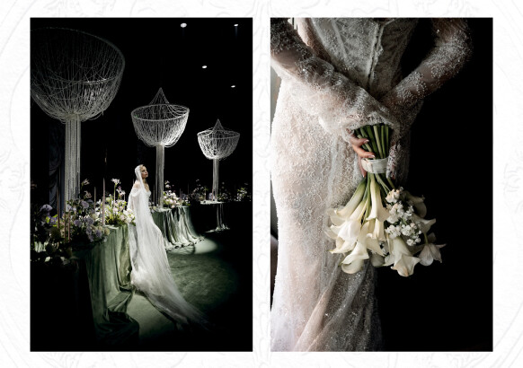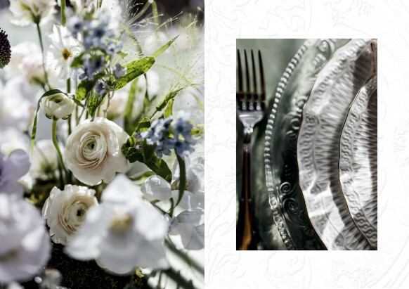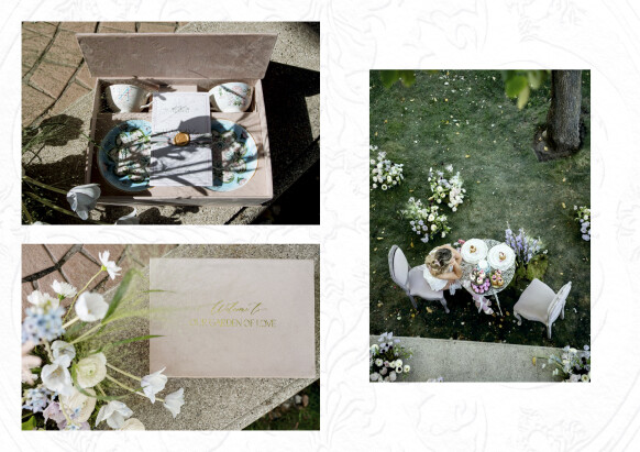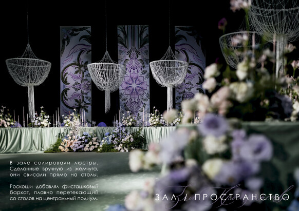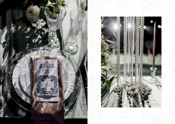В деталях - хрусталь и фарфор, жемчуг и бархат, для карточек меню - бумага ручного литья с добавлением семян цветов, для приглашений - чайные пары, расписанные художником. Каждый элемент на этой свадьбе был продуман до мелочей.