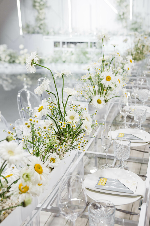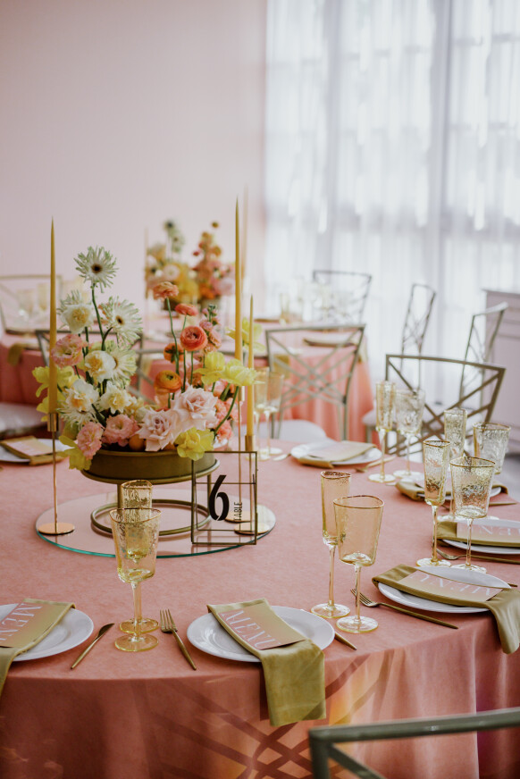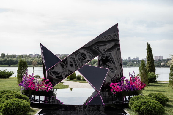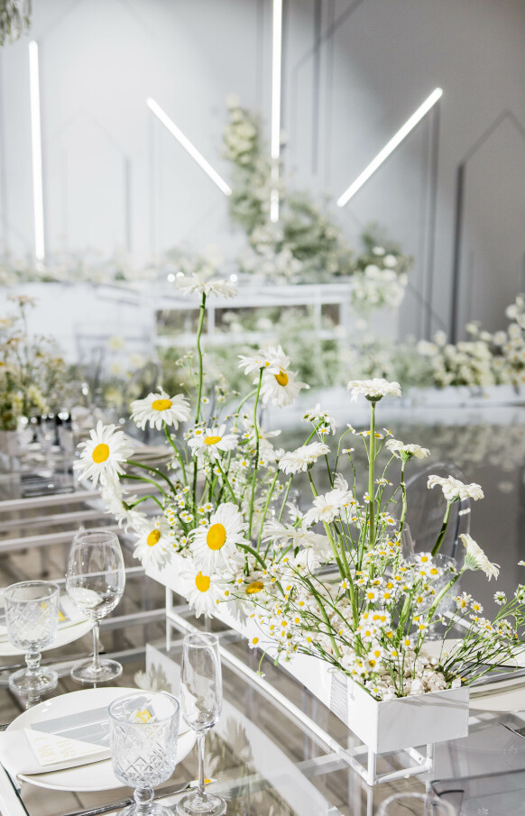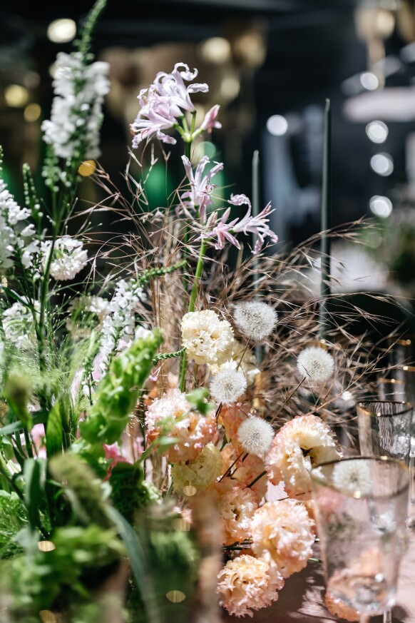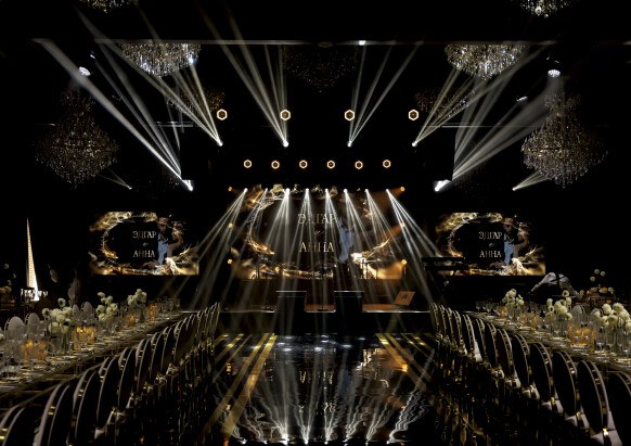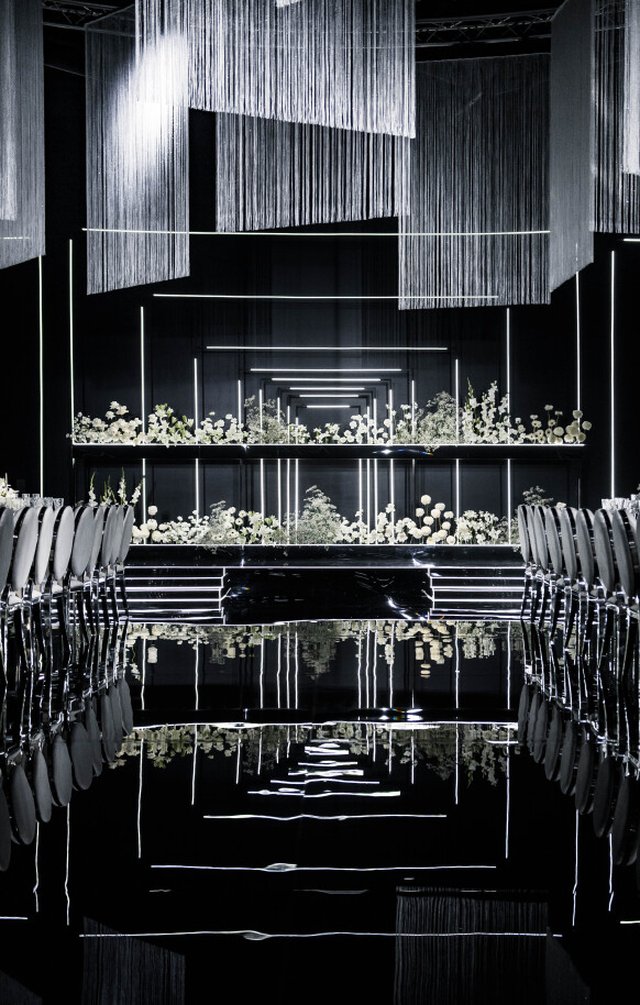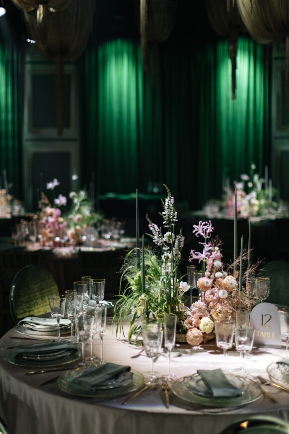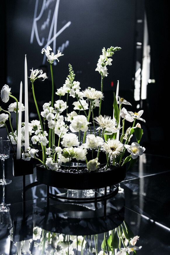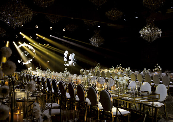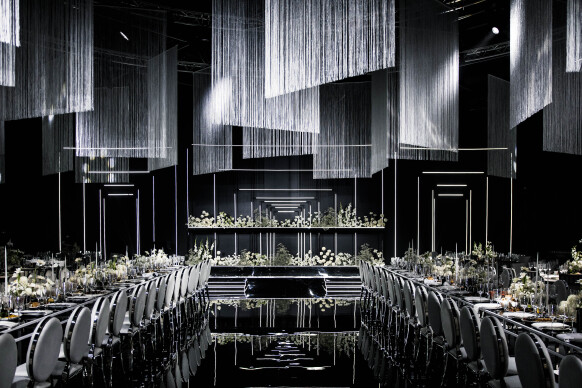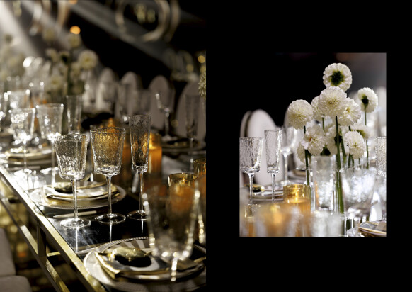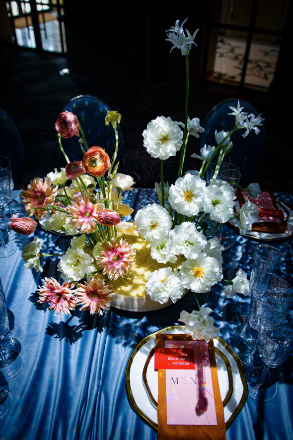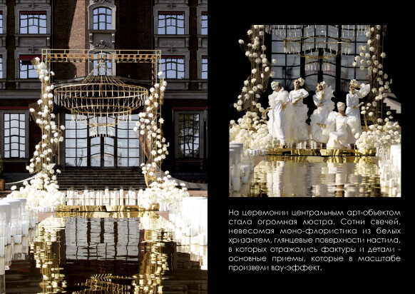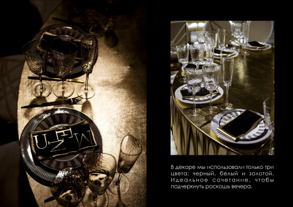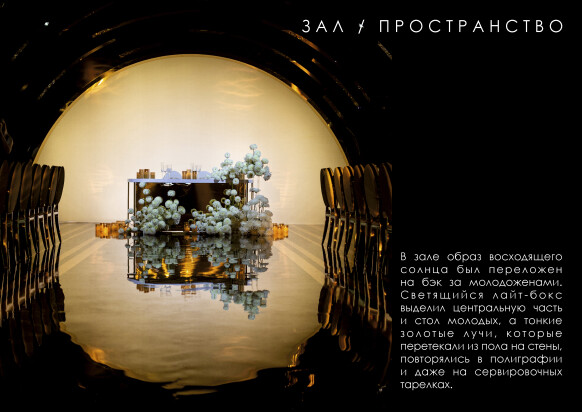 Большая работа была проведена с профессиональным светом. Это позволило деликатно выделить все глянцевые и металлизированные поверхности, а также подчеркнуть невесомую флористику в стеклянных колбах. К слову, в зале доминировали лишь белые георгины, которые уравновешивали своей простотой и легкостью обилие золотого и черного.