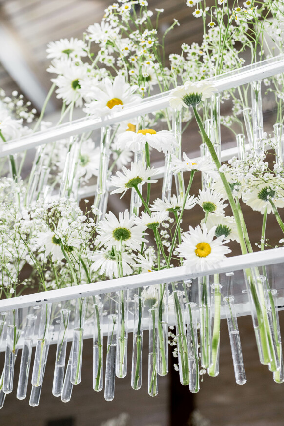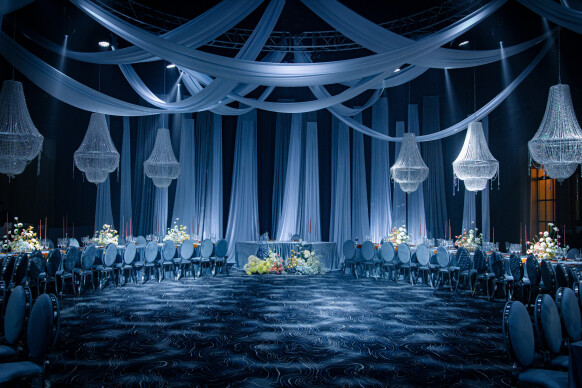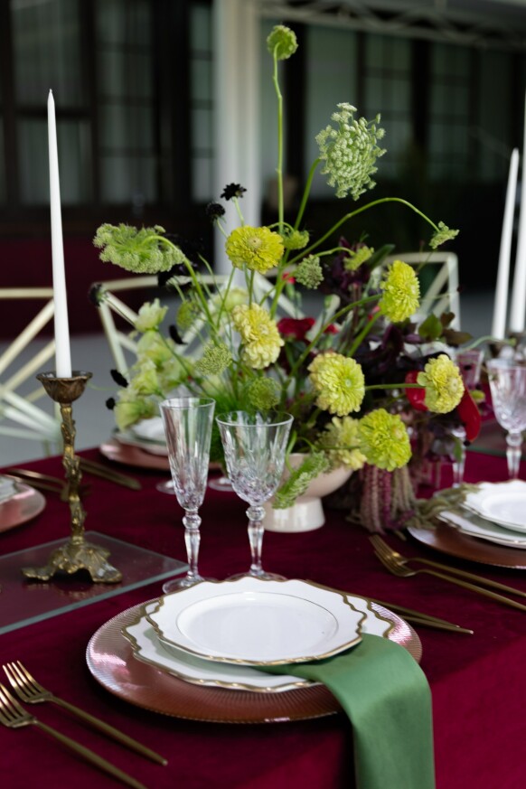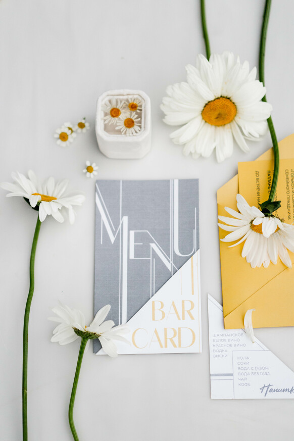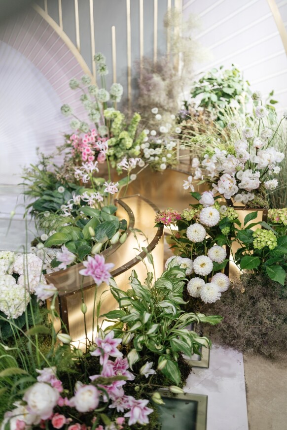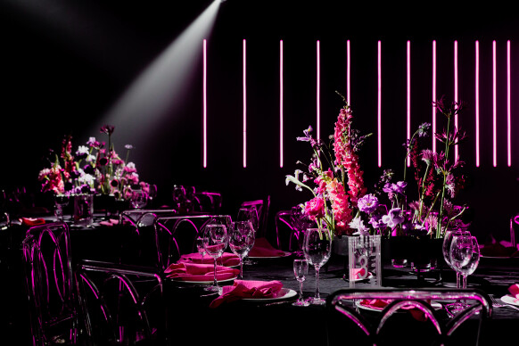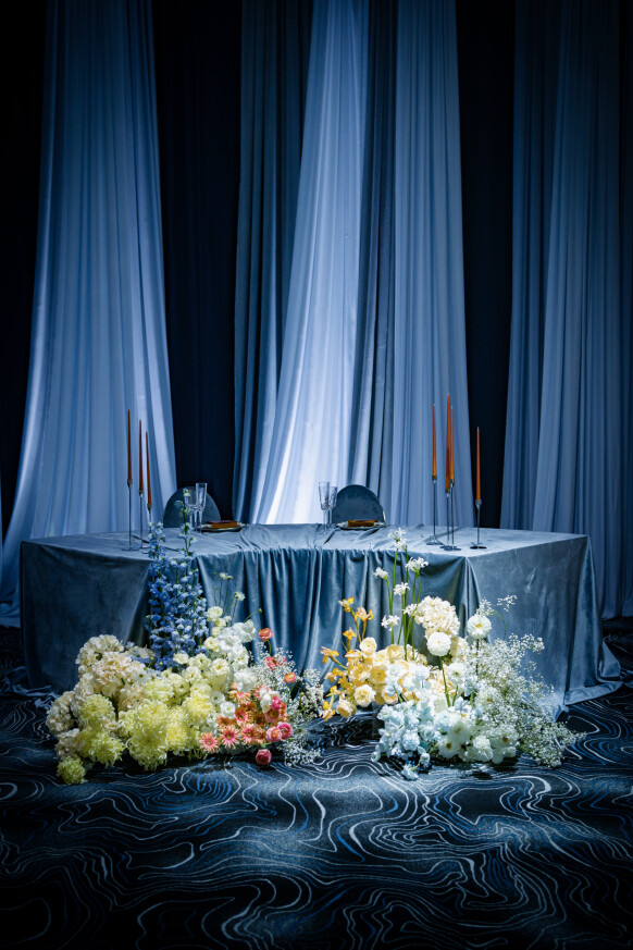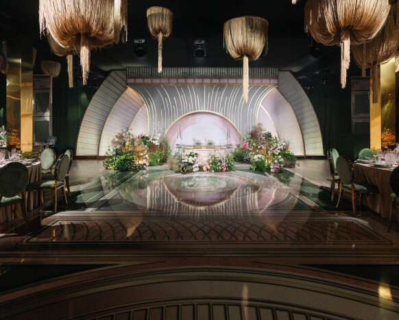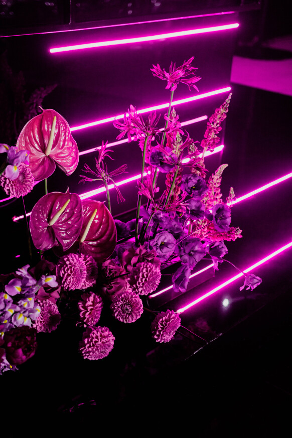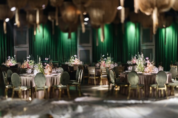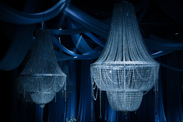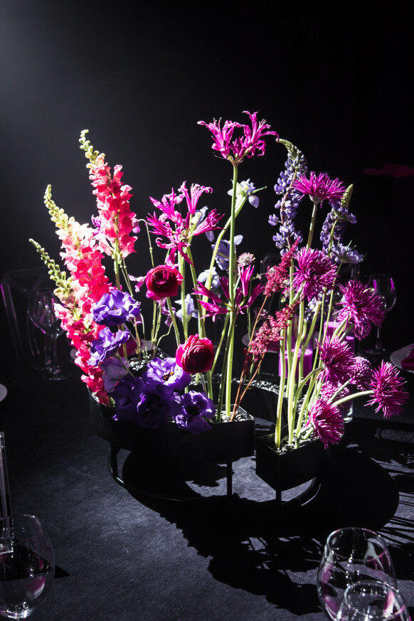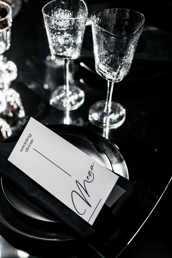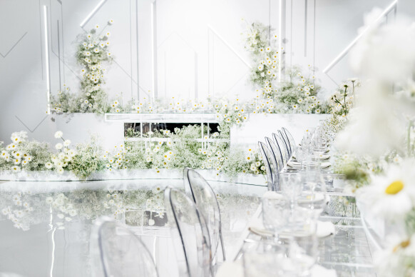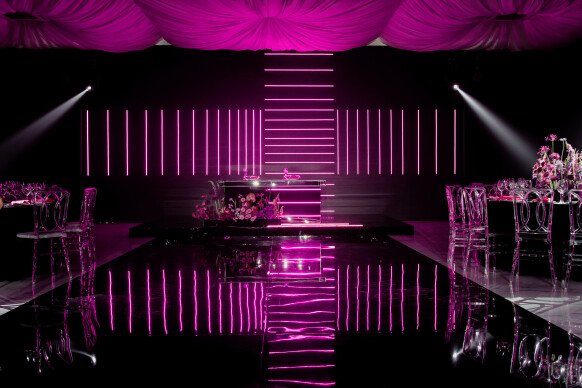 Большая работа была проведена с профессиональным светом. Это позволило деликатно выделить все глянцевые и металлизированные поверхности, а также подчеркнуть невесомую флористику в стеклянных колбах. К слову, в зале доминировали лишь белые георгины, которые уравновешивали своей простотой и легкостью обилие золотого и черного.