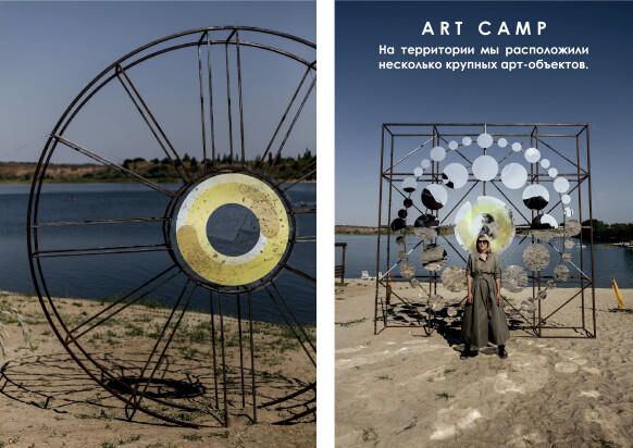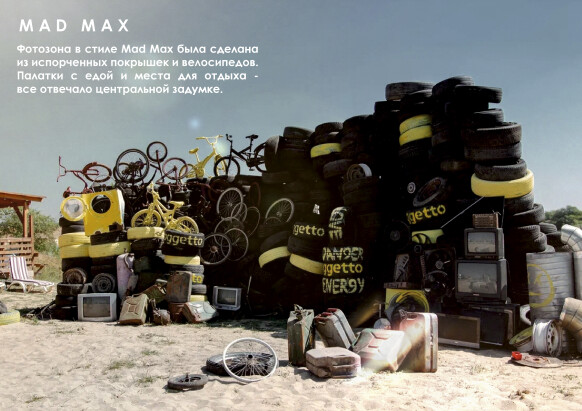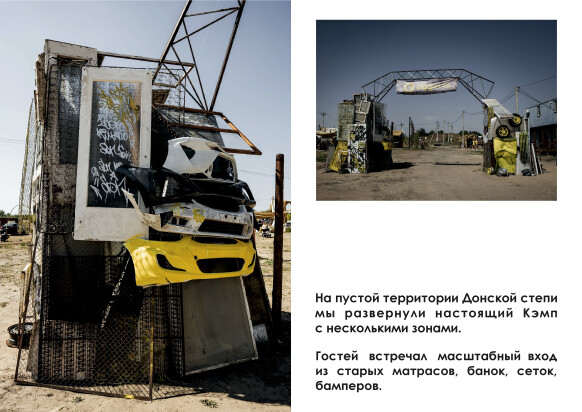 На пустой территории Донской степи мы развернули настоящий Кэмп с несколькими зонами. Гостей встречал масштабный вход из старых матрасов, банок, сеток, бамперов. Фотозона в стиле Mad Max была сделана из испорченных покрышек и велосипедов. Палатки с едой и места для отдыха - все отвечало центральной задумке.