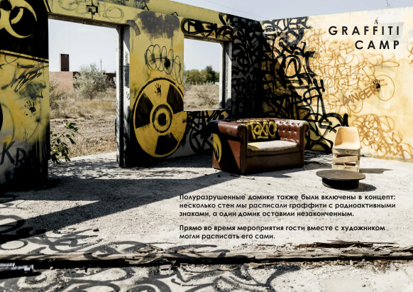 Полуразрушенные домики также были включены в концепт: несколько стен мы расписали граффити с радиоактивными знаками, а один домик оставили незаконченным. Прямо во время мероприятия гости вместе с художником могли расписать его сами.