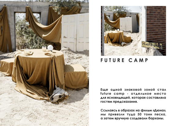 Еще одной знаковой зоной стал future - camp - отдельное место для ясновидящей, которая составляла гостям предсказания. Ссылаясь в образах на фильм «Дюна», мы привезли туда 50 тонн песка, а затем вручную создавали барханы.