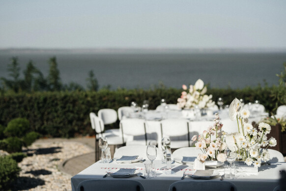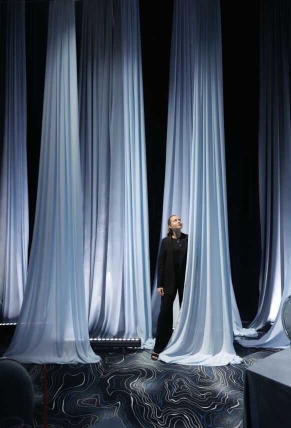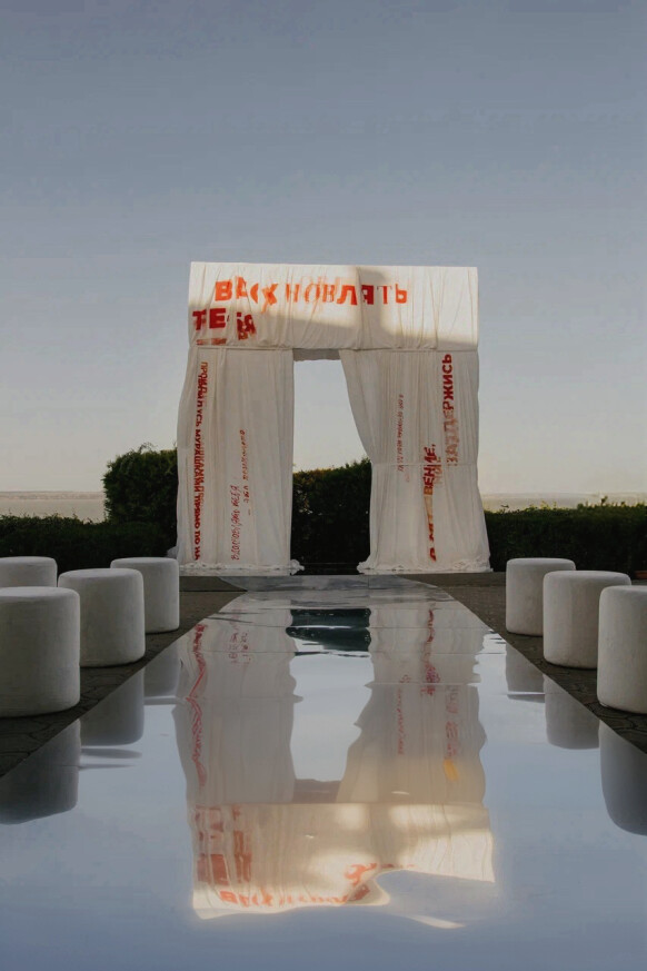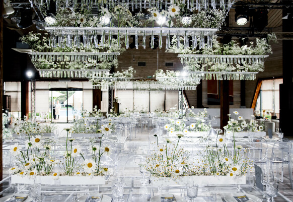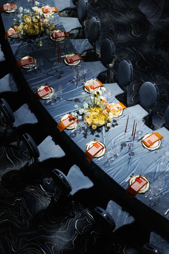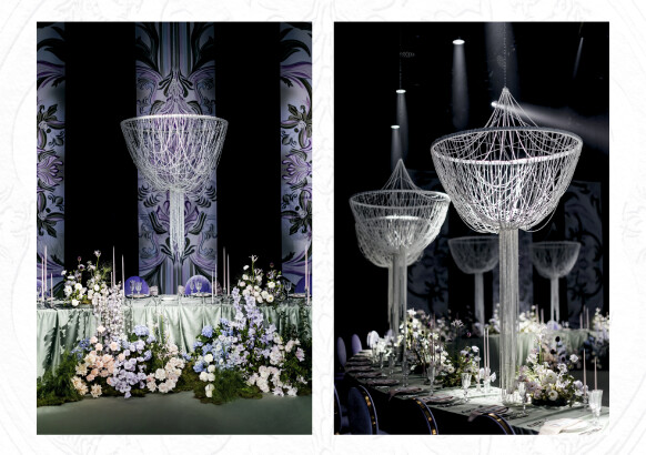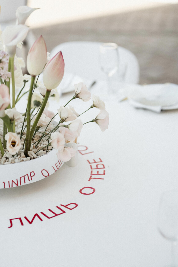 Принты на подвесных полотнах были созданы нашими дизайнерами при помощи нейросети. К слову, расстановка была также продиктована стилистикой званого ужина - гости разместились за единым овальным столом только с одной стороны.