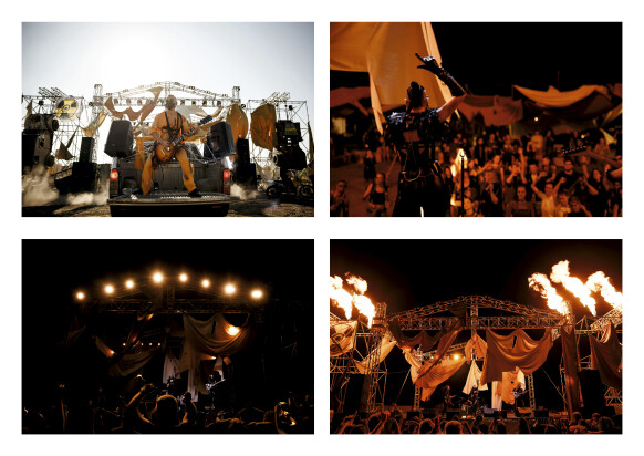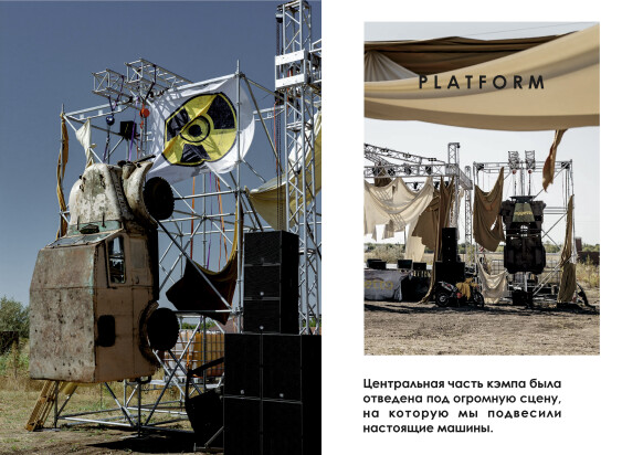 Центральная часть кэмпа была отведена под огромную сцену, на которую мы подвесили настоящие машины. Здесь нам очень хотелось размахнуться, но техники просили сделать автомобили максимально легкими. Нам хотелось добиться реалистичности, а не бутафории, поэтому мы купили старые военные машины, вытащили из них всю внутрянку и подвесили только корпуса. В вечернее время на территории всего кемпа загоралась подсветка от гирлянд и прожекторов, чтобы блеклый пейзаж пустоши ожил огнями.