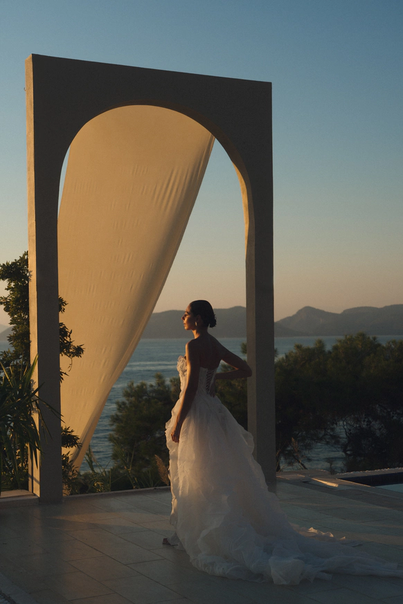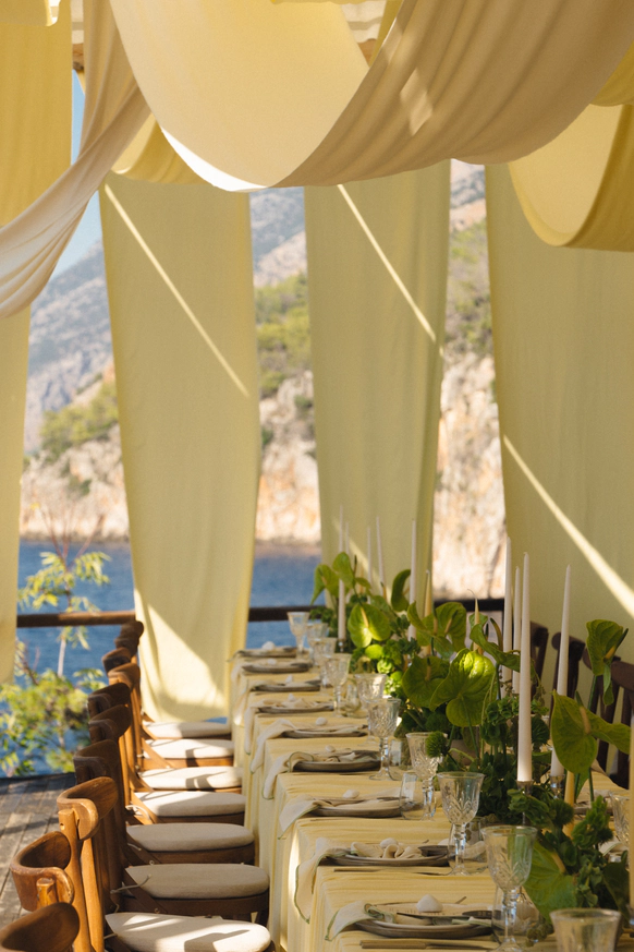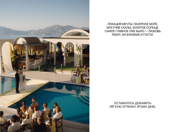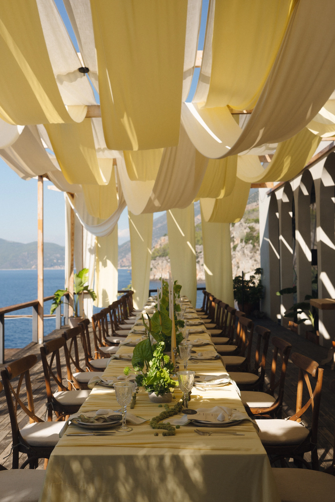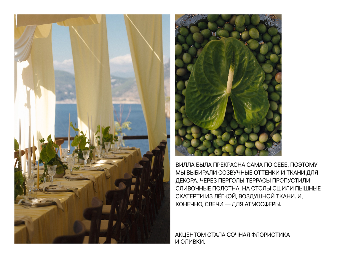 Локация мечты: лазурное море, могучие скалы, золотое солнце. Самое главное - уже есть. Это любовь ребят, их близкие и гости. Оставалась добавить легкую огранку этому дню. Вилла была прекрасна сама по себе, поэтому мы выбирали созвучные оттенки и ткани для декора. Через перголы террасы пропустили сливочные провесы, на столы сшили пышные скатерти из легкой и воздушной ткани. И, конечно, свечи для атмосферы! Акцентной стала сочная флористика и оливки.