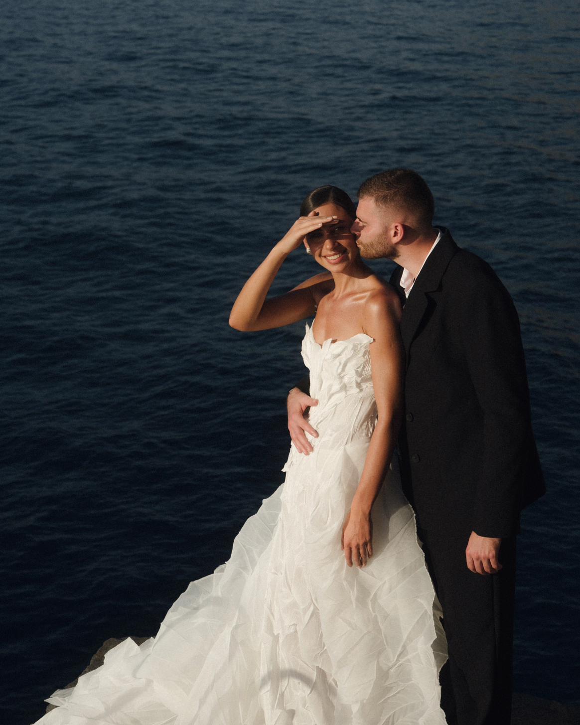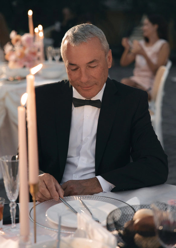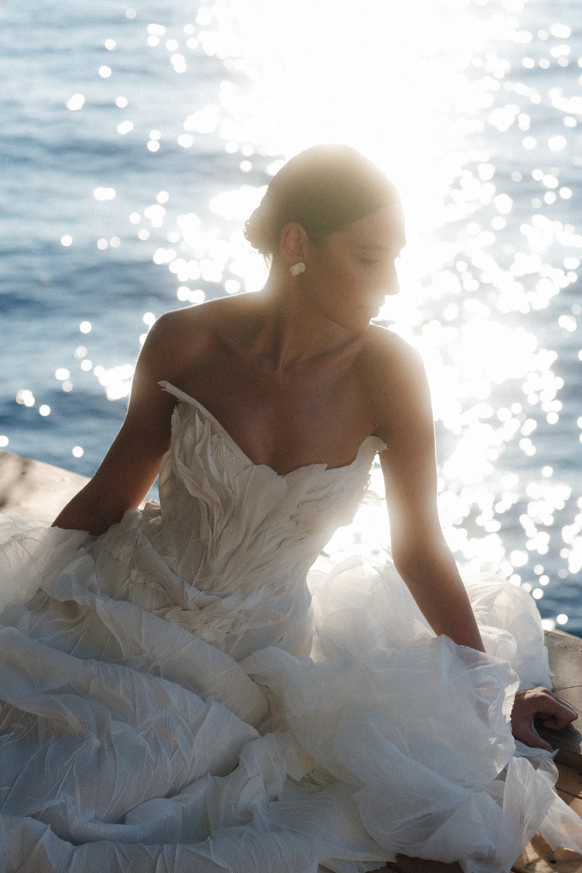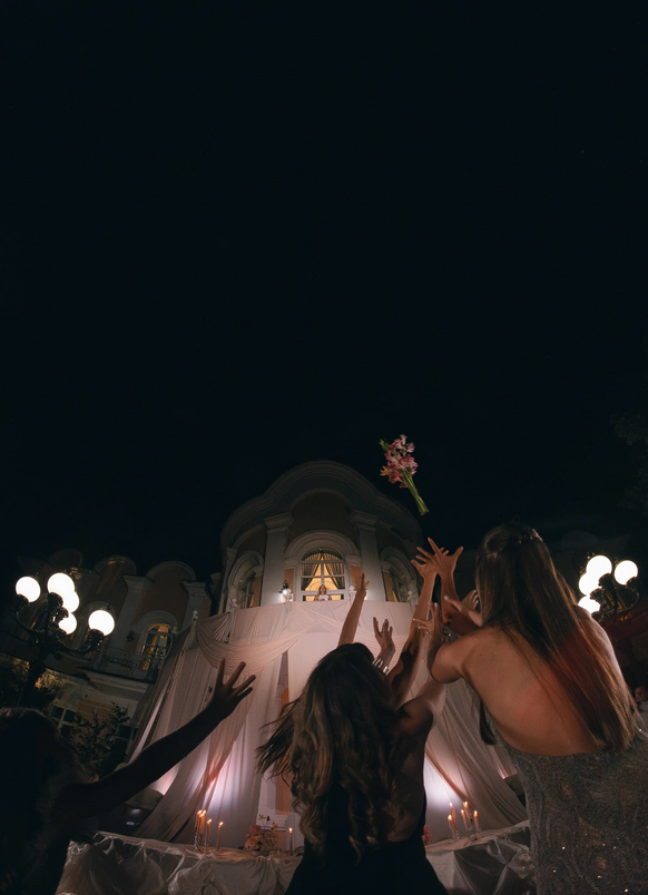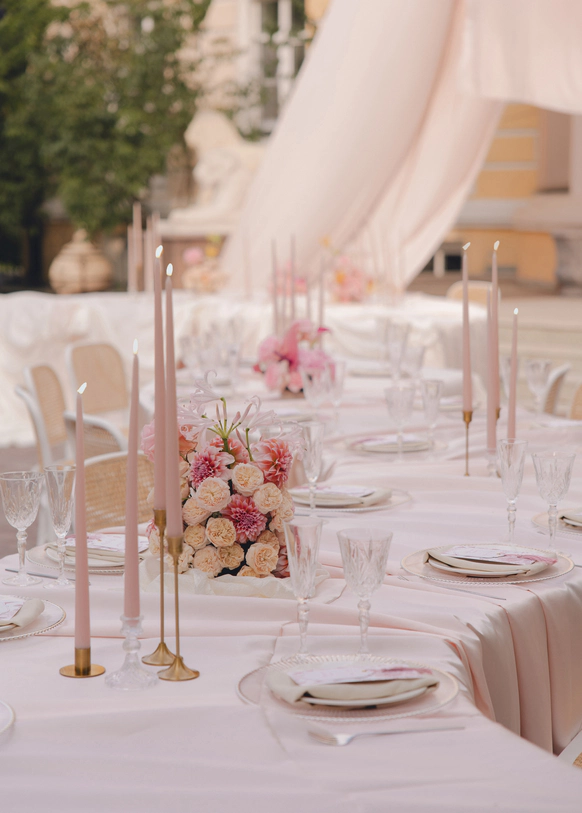 Локация мечты: лазурное море, могучие скалы, золотое солнце. Самое главное - уже есть. Это любовь ребят, их близкие и гости. Оставалась добавить легкую огранку этому дню. Вилла была прекрасна сама по себе, поэтому мы выбирали созвучные оттенки и ткани для декора. Через перголы террасы пропустили сливочные провесы, на столы сшили пышные скатерти из легкой и воздушной ткани. И, конечно, свечи для атмосферы! Акцентной стала сочная флористика и оливки.