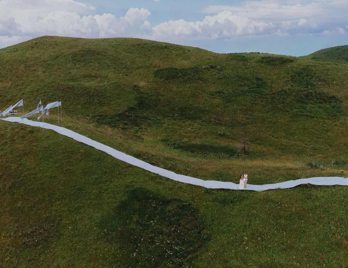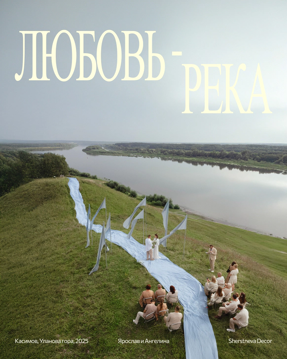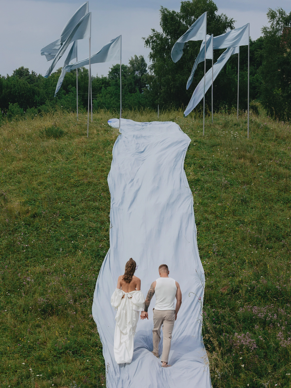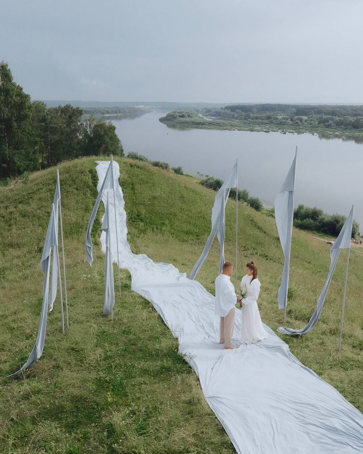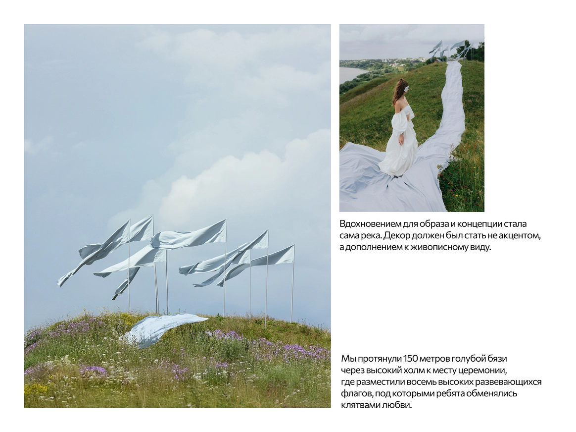 Вдохновением к образу и концепции стала сама река. Декор должен был стать не акцентом, а дополнением к живописному виду. Мы протянули 150 метров голубой бязи через высокий холм к церемонии, где разместили 8 высоких развевающихся флагов, под которыми ребята обменялись клятвами о любви.