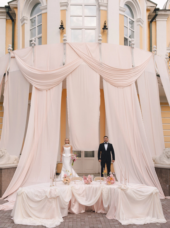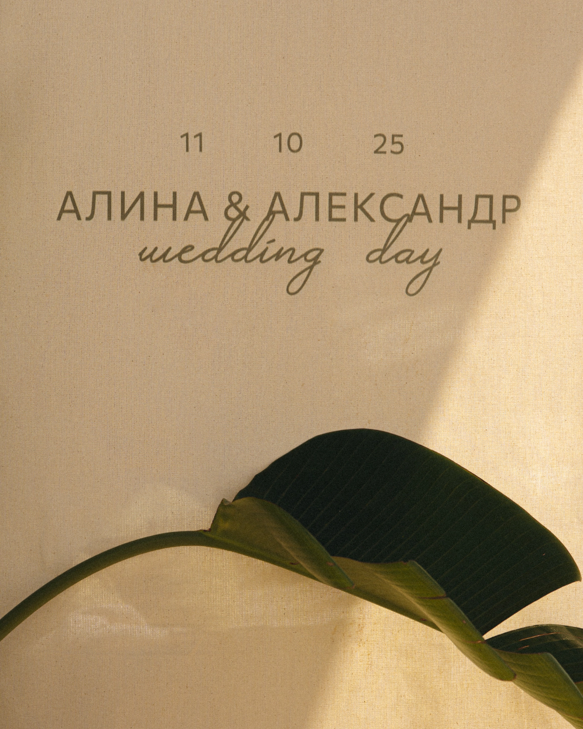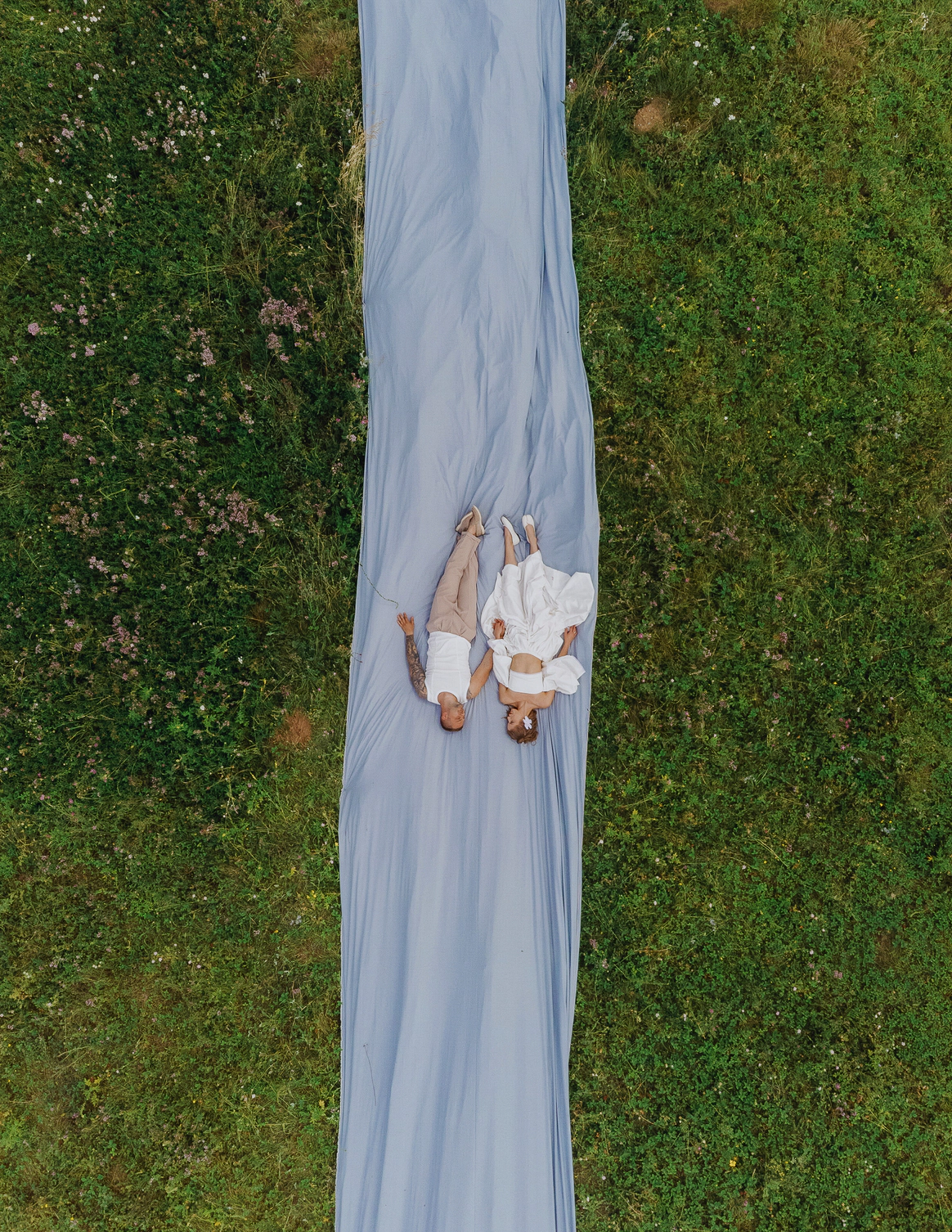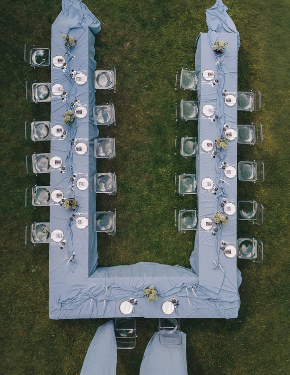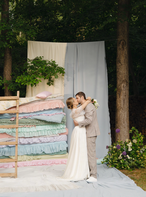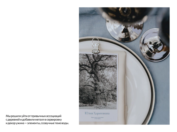 Вдохновением к образу и концепции стала сама река. Декор должен был стать не акцентом, а дополнением к живописному виду. Мы протянули 150 метров голубой бязи через высокий холм к церемонии, где разместили 8 высоких развевающихся флагов, под которыми ребята обменялись клятвами о любви.