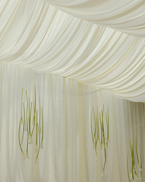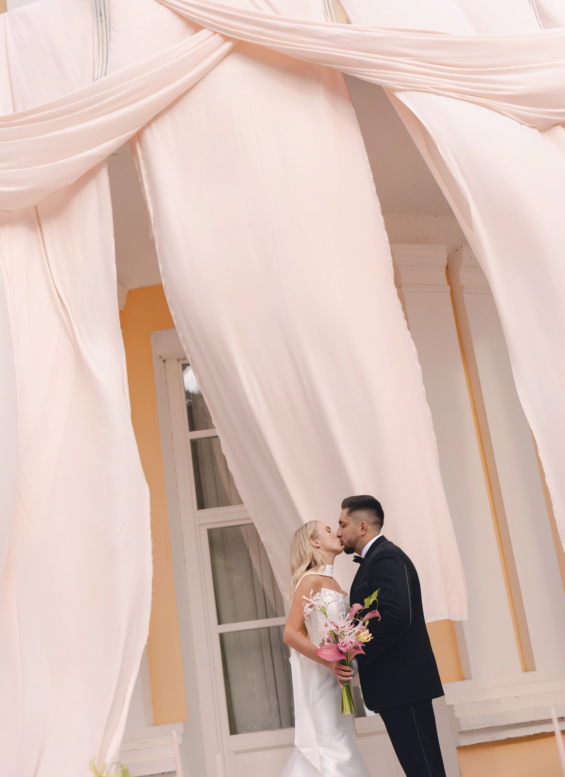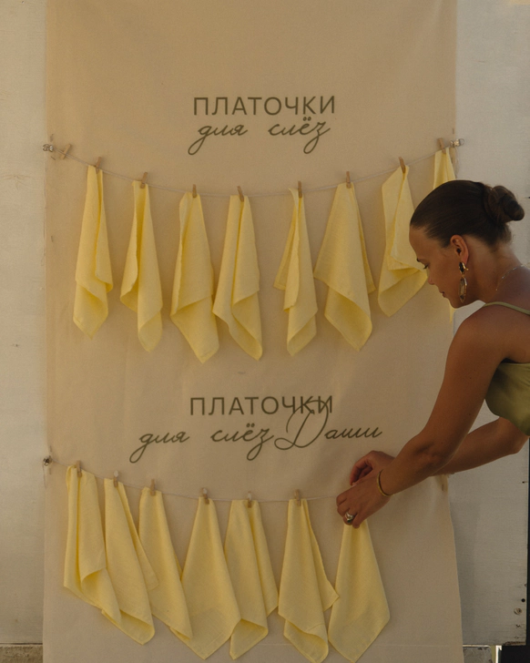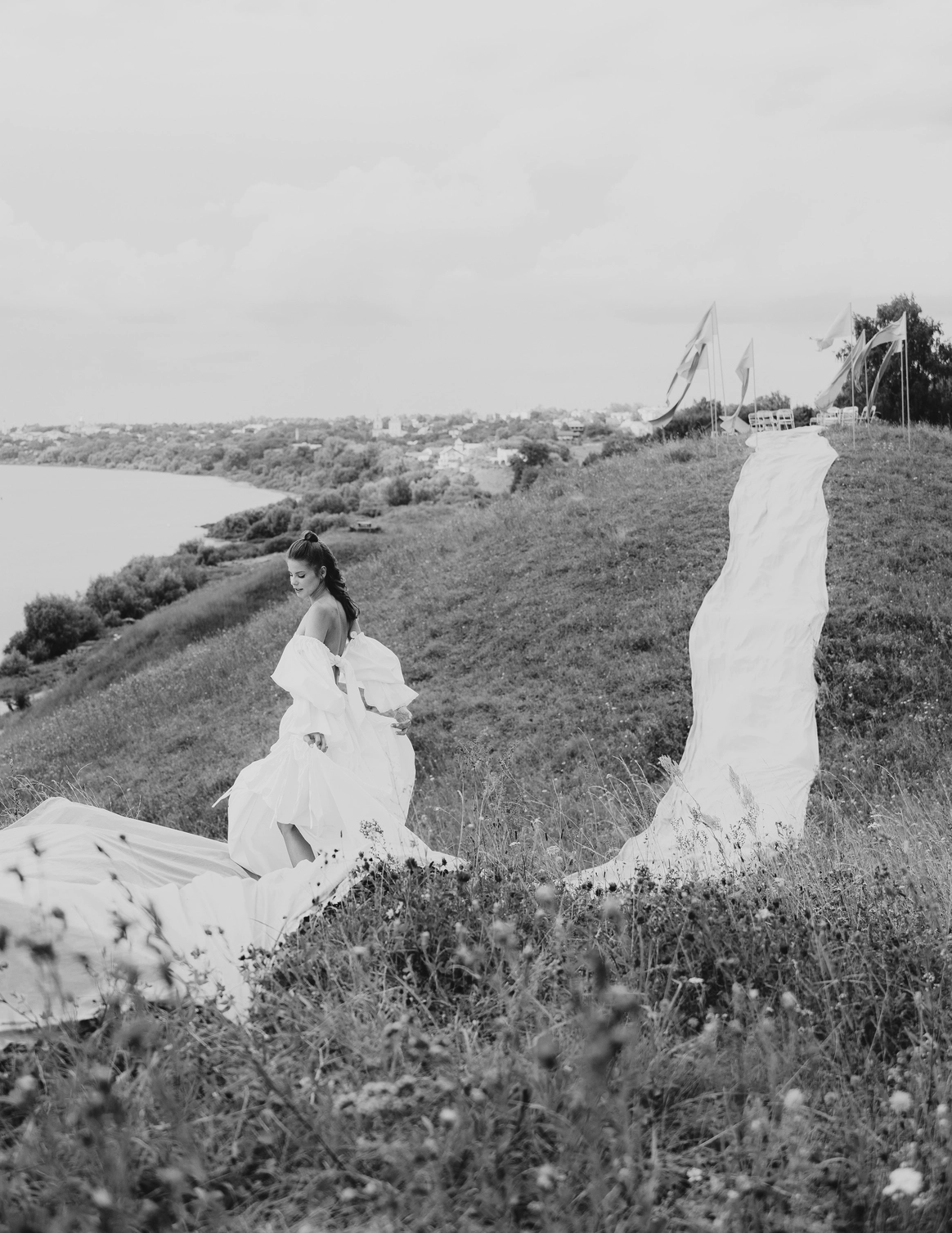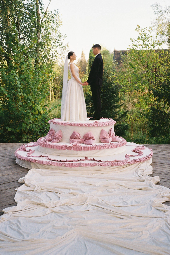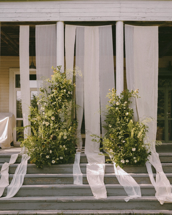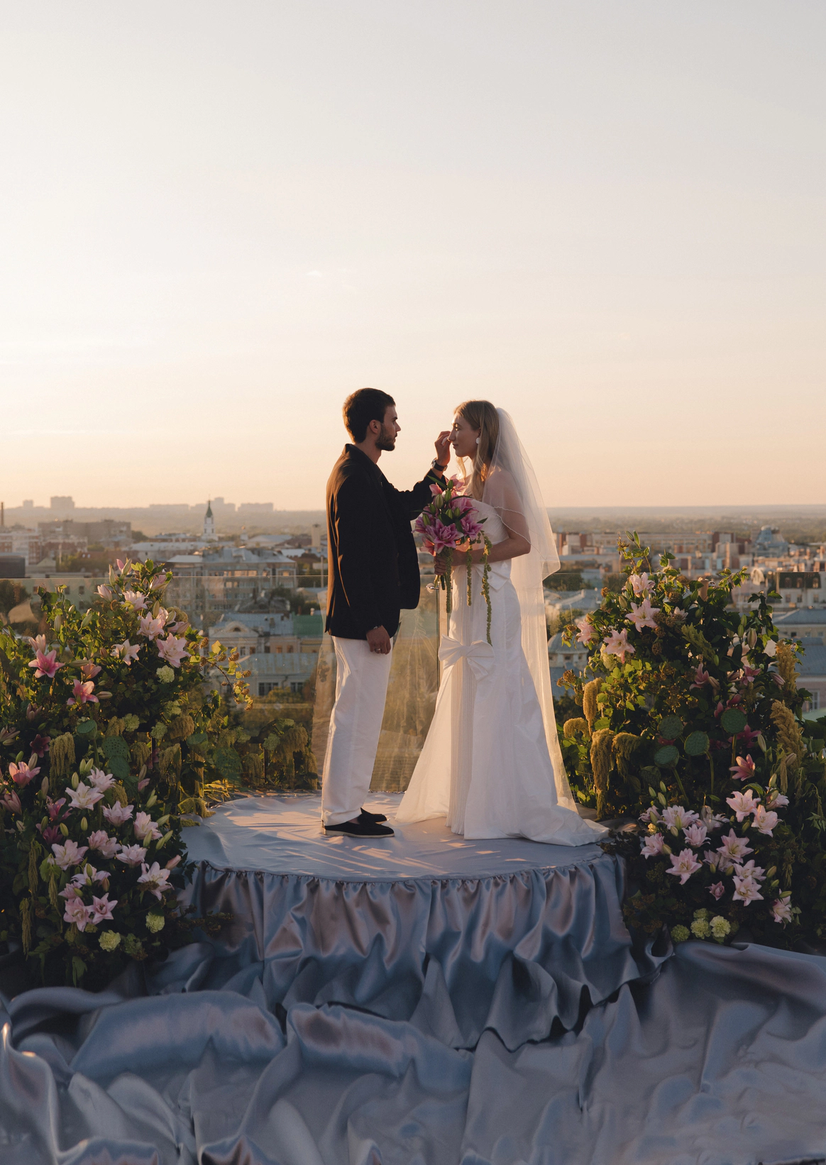 Вдохновением к образу и концепции стала сама река. Декор должен был стать не акцентом, а дополнением к живописному виду. Мы протянули 150 метров голубой бязи через высокий холм к церемонии, где разместили 8 высоких развевающихся флагов, под которыми ребята обменялись клятвами о любви.