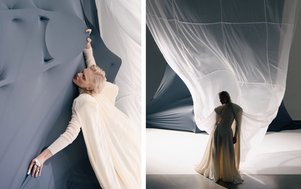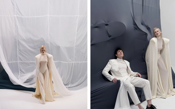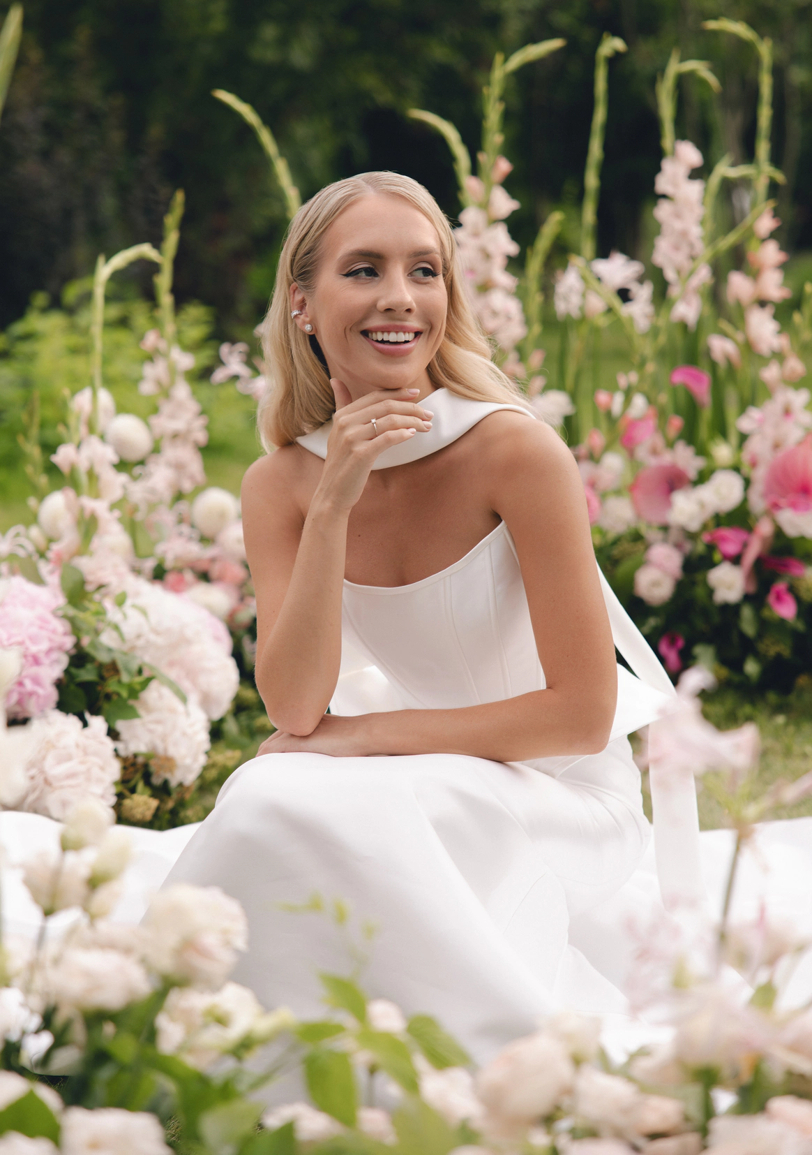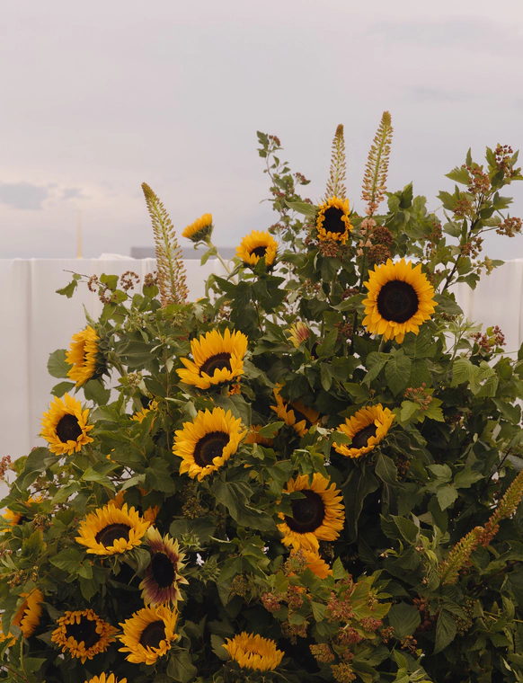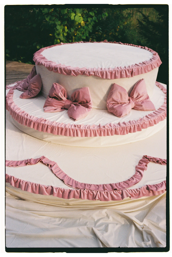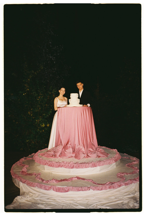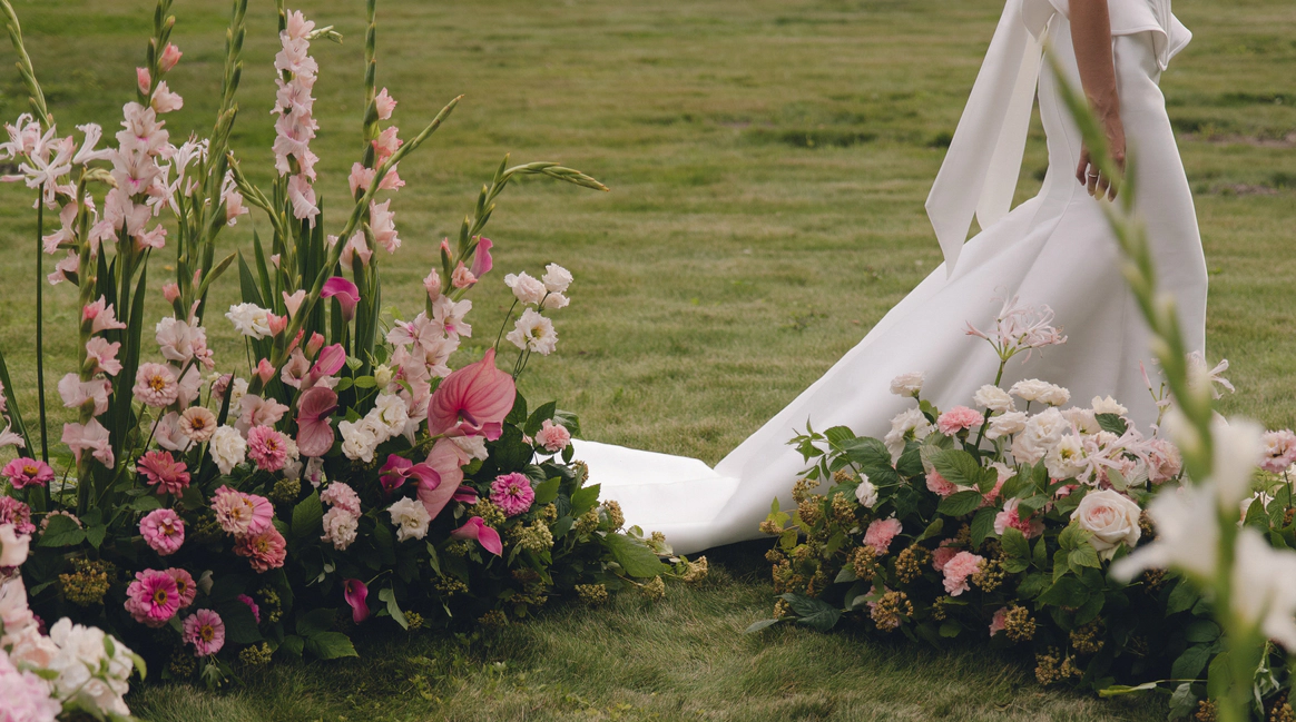 Вдохновением к образу и концепции стала сама река. Декор должен был стать не акцентом, а дополнением к живописному виду. Мы протянули 150 метров голубой бязи через высокий холм к церемонии, где разместили 8 высоких развевающихся флагов, под которыми ребята обменялись клятвами о любви.