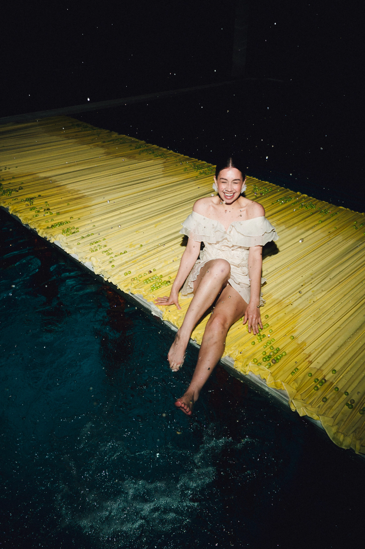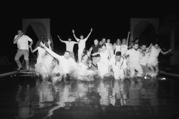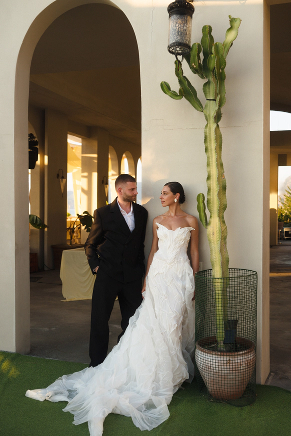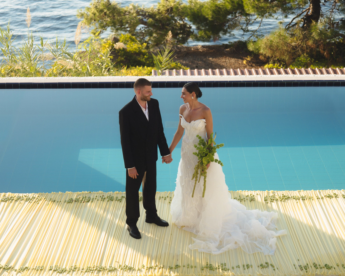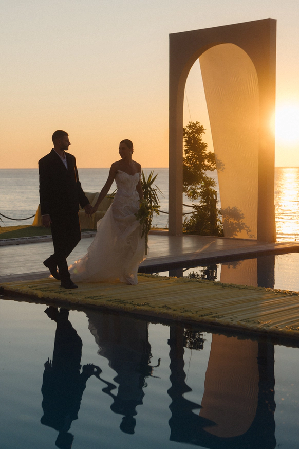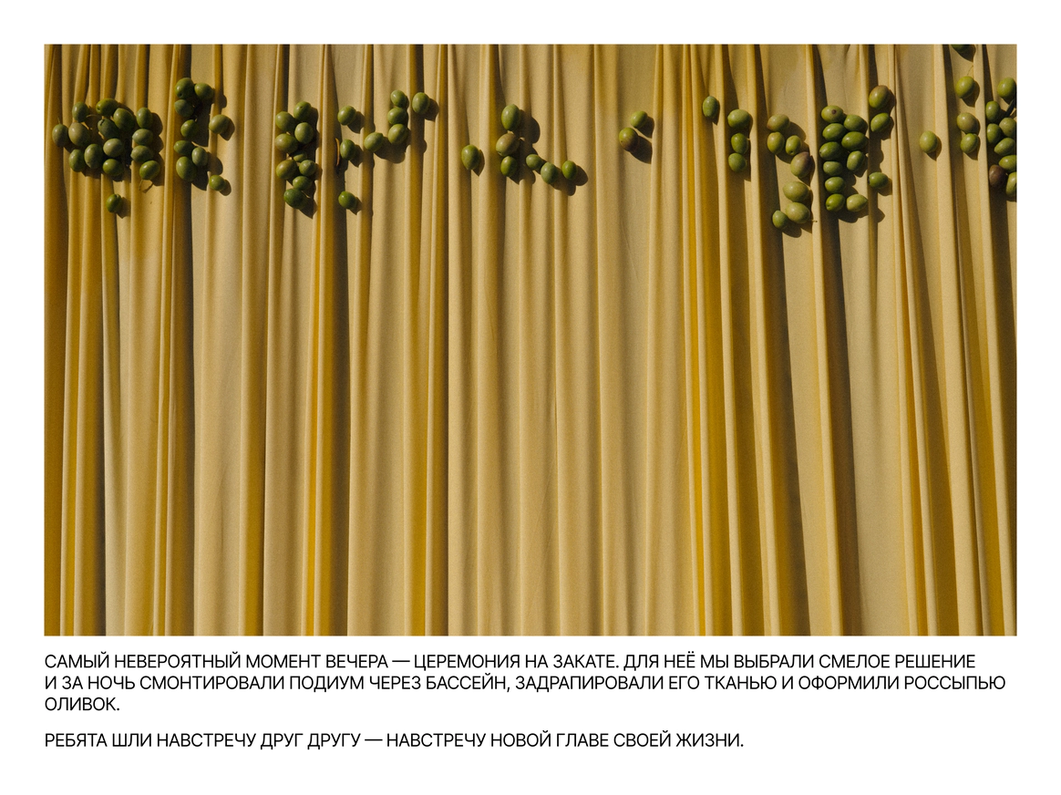 Самый невероятный момент вечера - церемония на закате. Для нее выбрали смелое решение и через бассейн за ночь смонтировали подиум, задрапированный тканью и оформленный россыпью оливок. Ребята шли навстречу друг другу, навстречу новой главе в их жизни!