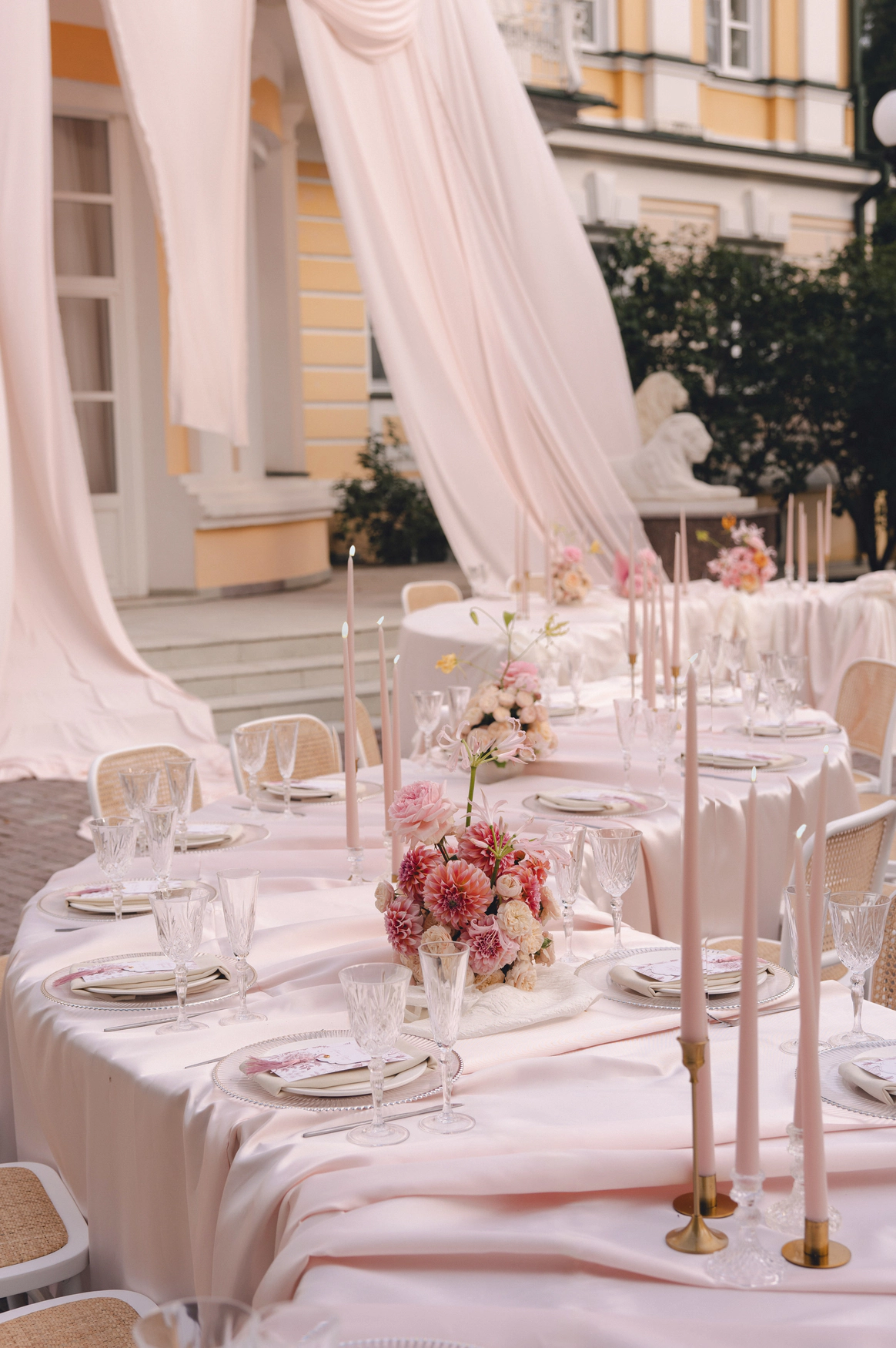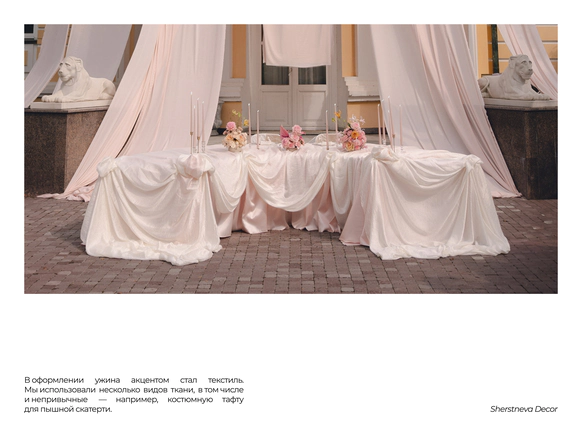 В оформлении ужина акцентом стал текстиль. Мы использовали несколько видов ткани, в том числе и непривычные, например, костюмную тафту для пышной скатерти. На фасаде струящиеся с балконов полотна, плавно переходящие в планировку ужина. Столы волнами, свечи, пышные скатерти , выразительная флористика и сервировка - мы постарались создать атмосферу настоящей сказки и все получилось !