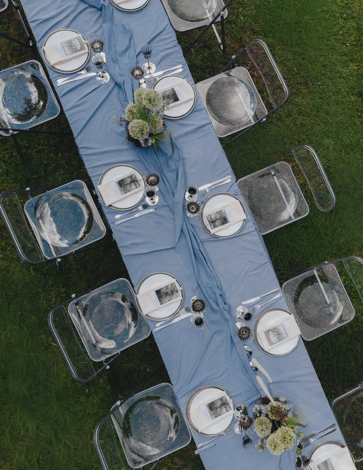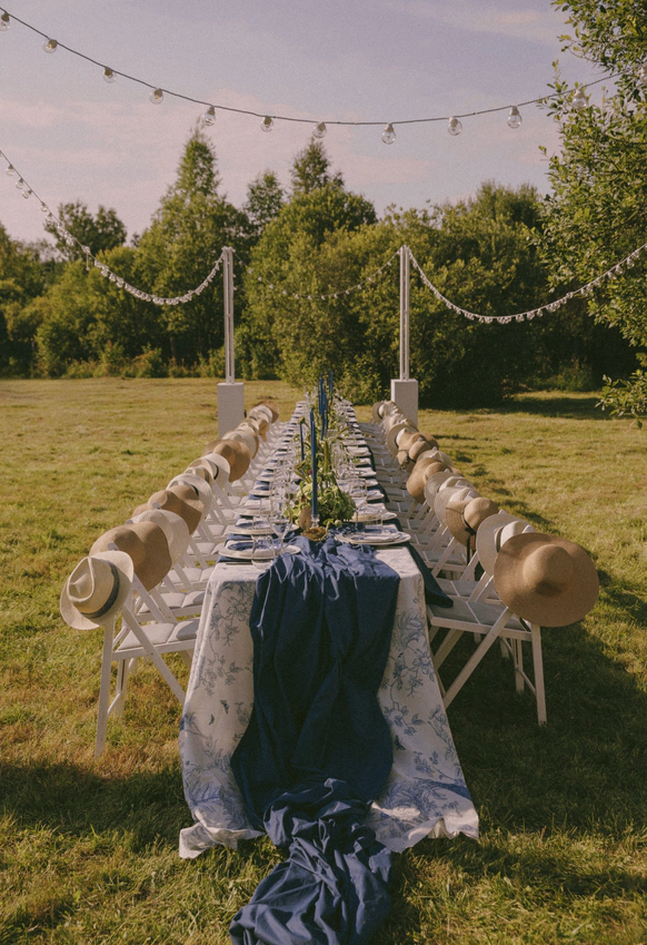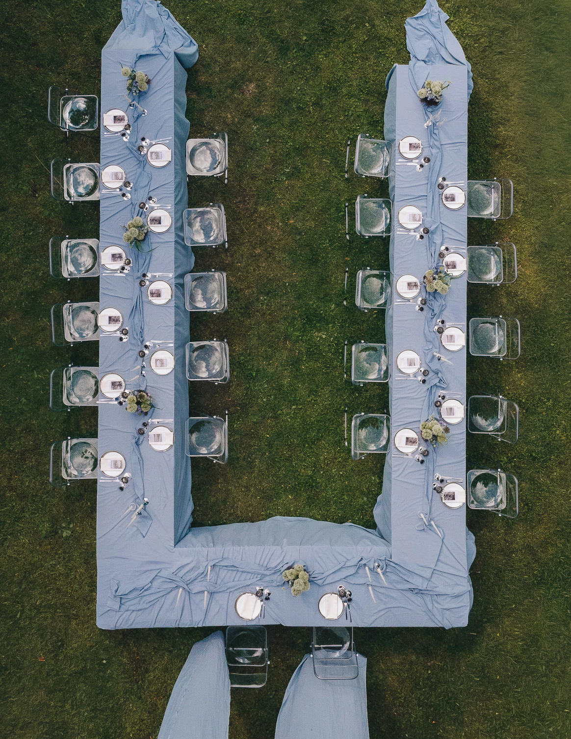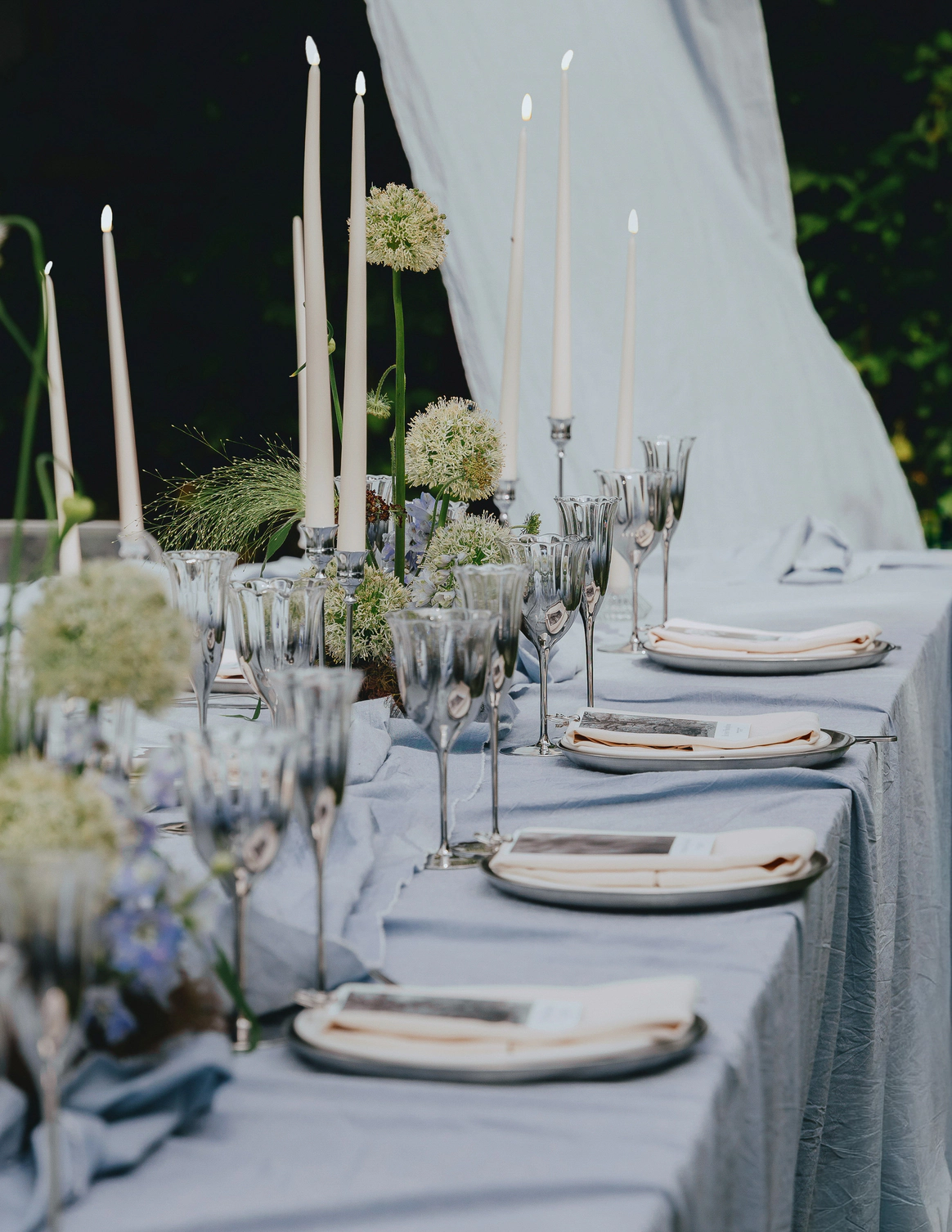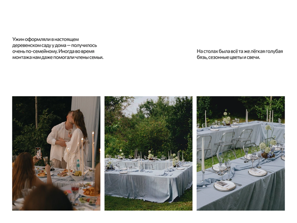 Ужин оформляли в настоящем деревенском саду дома, это было очень по-семейному, иногда в монтаже нам даже помогали члены семьи. На столах была все та же легкая голубая бязь, сезонные цветы и свечи. Мы решили уйти от привычных ассоциаций с деревней и добавили металл в сервировке и декоре ужина, созвучные теме воды