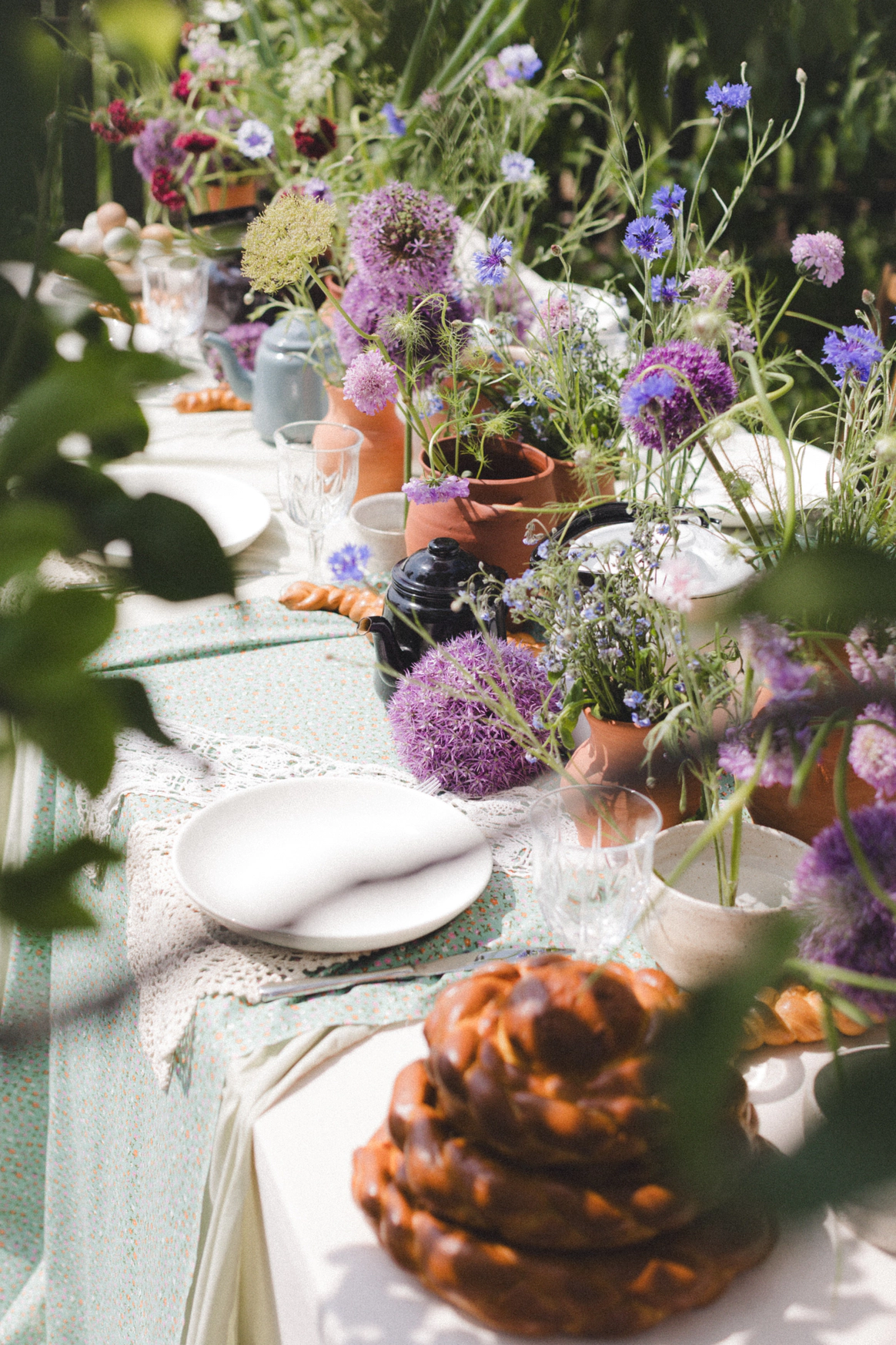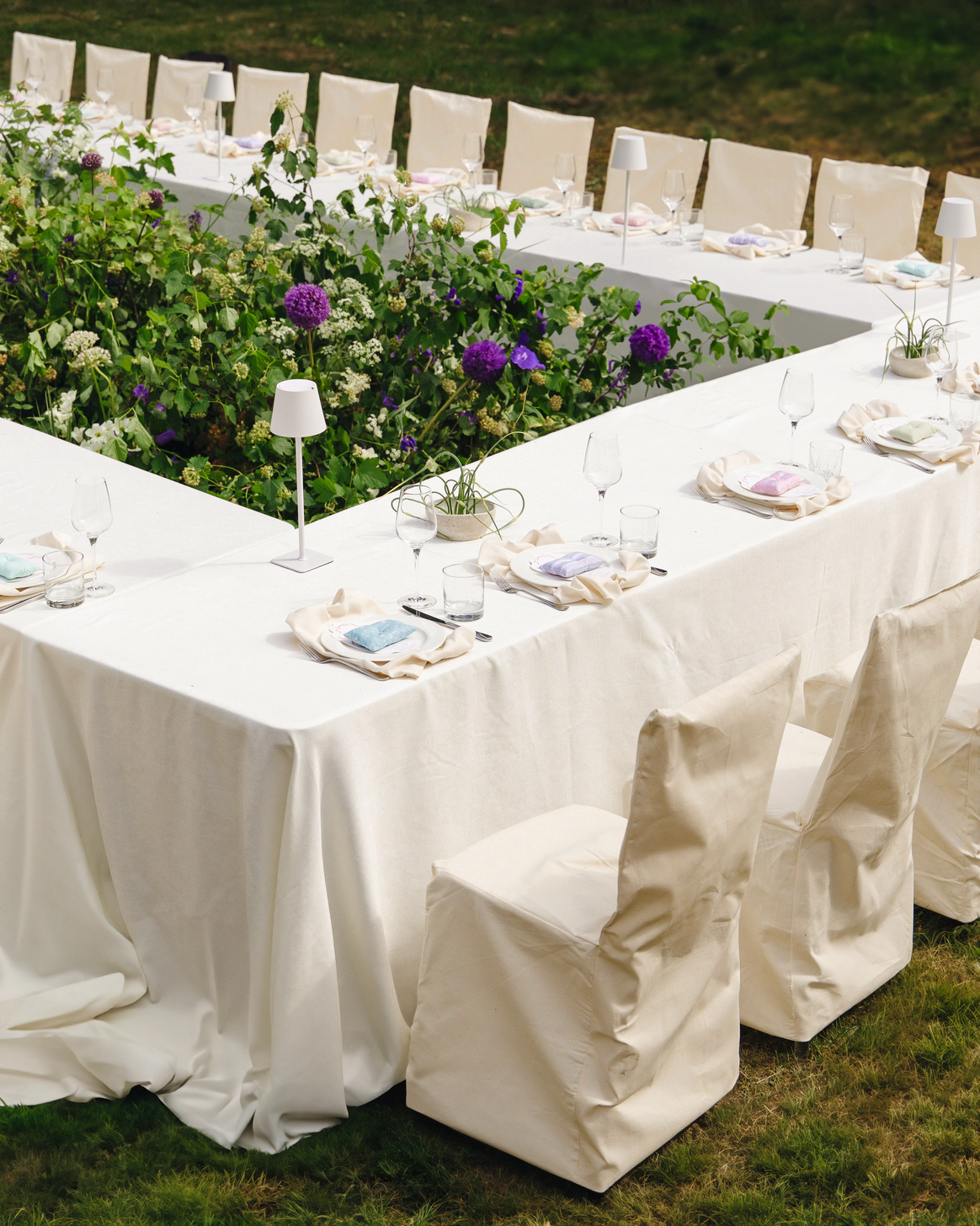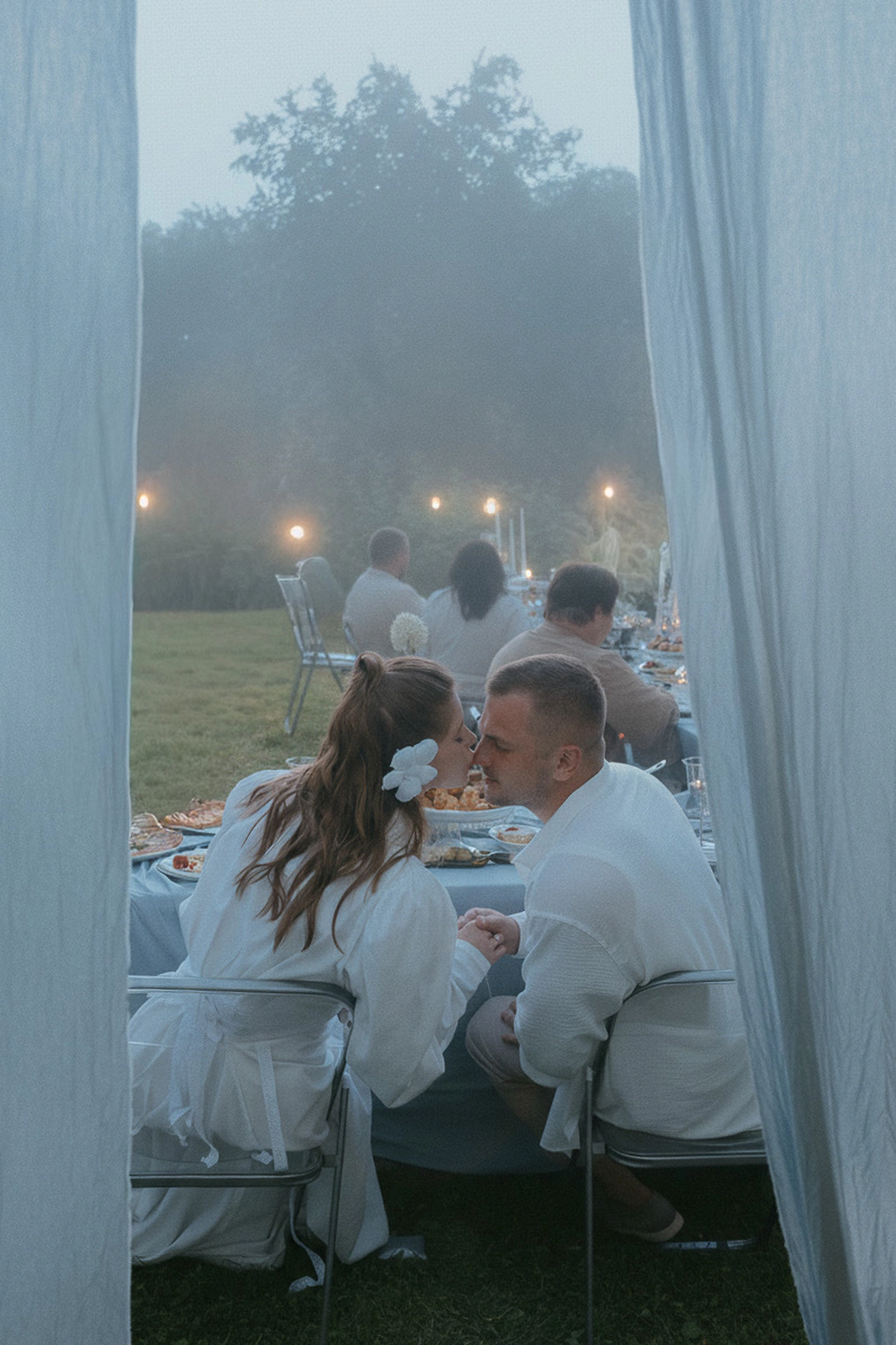 Ужин оформляли в настоящем деревенском саду дома, это было очень по-семейному, иногда в монтаже нам даже помогали члены семьи. На столах была все та же легкая голубая бязь, сезонные цветы и свечи. Мы решили уйти от привычных ассоциаций с деревней и добавили металл в сервировке и декоре ужина, созвучные теме воды