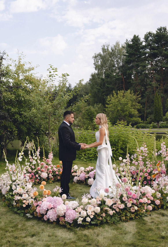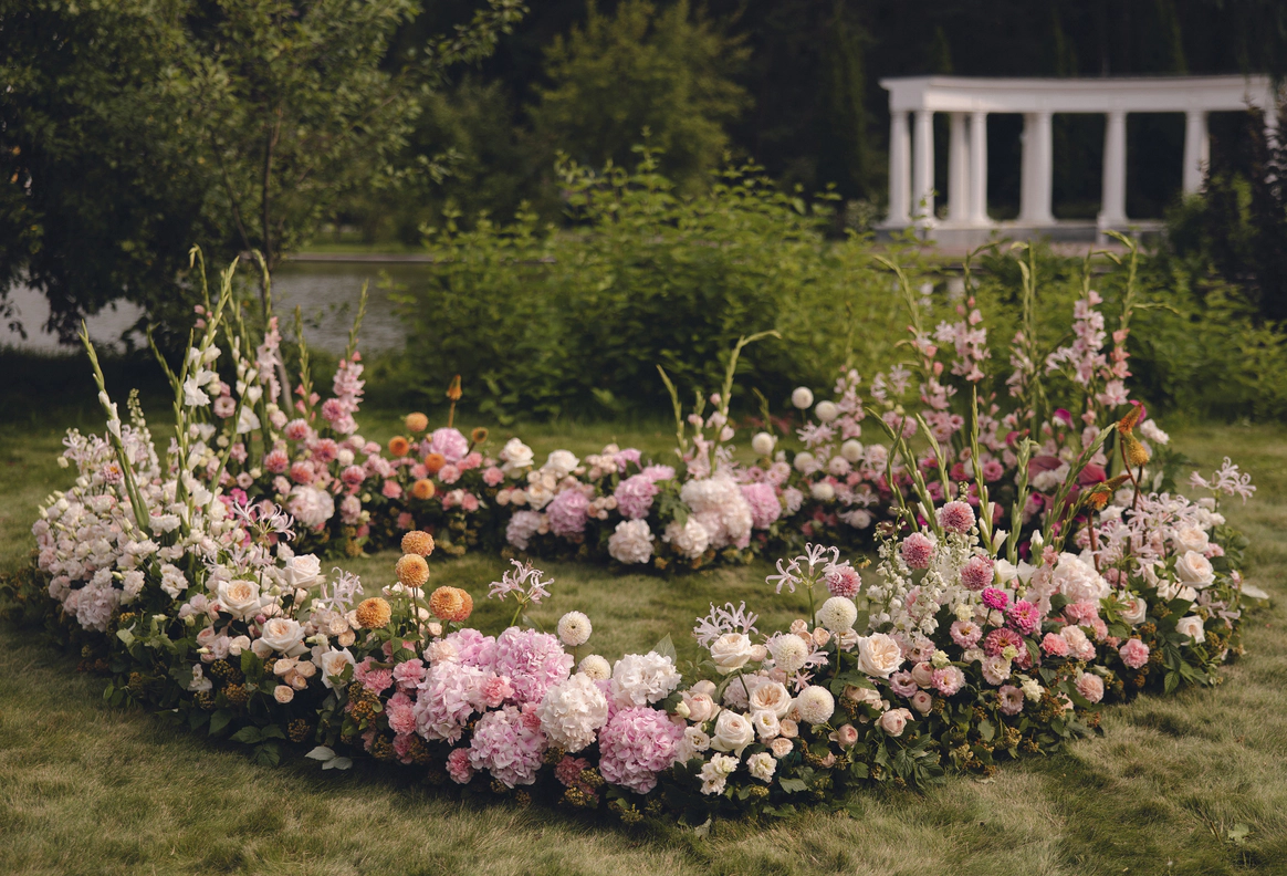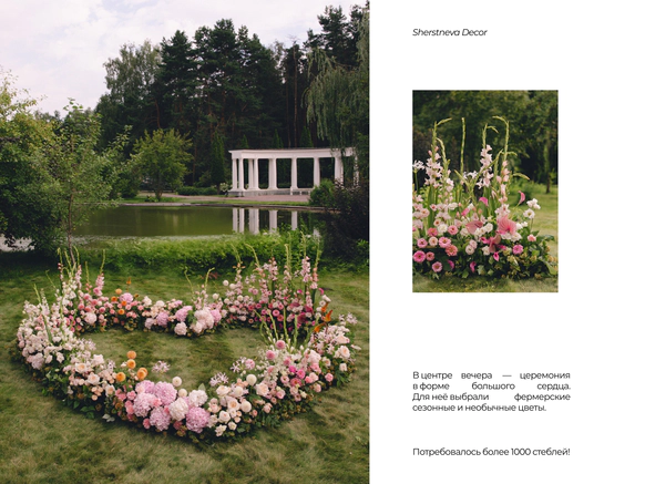 В центре вечера - церемония в форме большого сердца. Выбрали фермерские сезонные, либо необычные цветы для нее. Потребовалось более 1000 стеблей! В усадьбе много живописных локаций, поэтому постарались выбрать самые выразительные виды для каждого ключевого момента вечера. На заднем плане церемонии - пруд и «неслучайная» колоннада, которая осмысленно стала частью образа еще на эскизах .