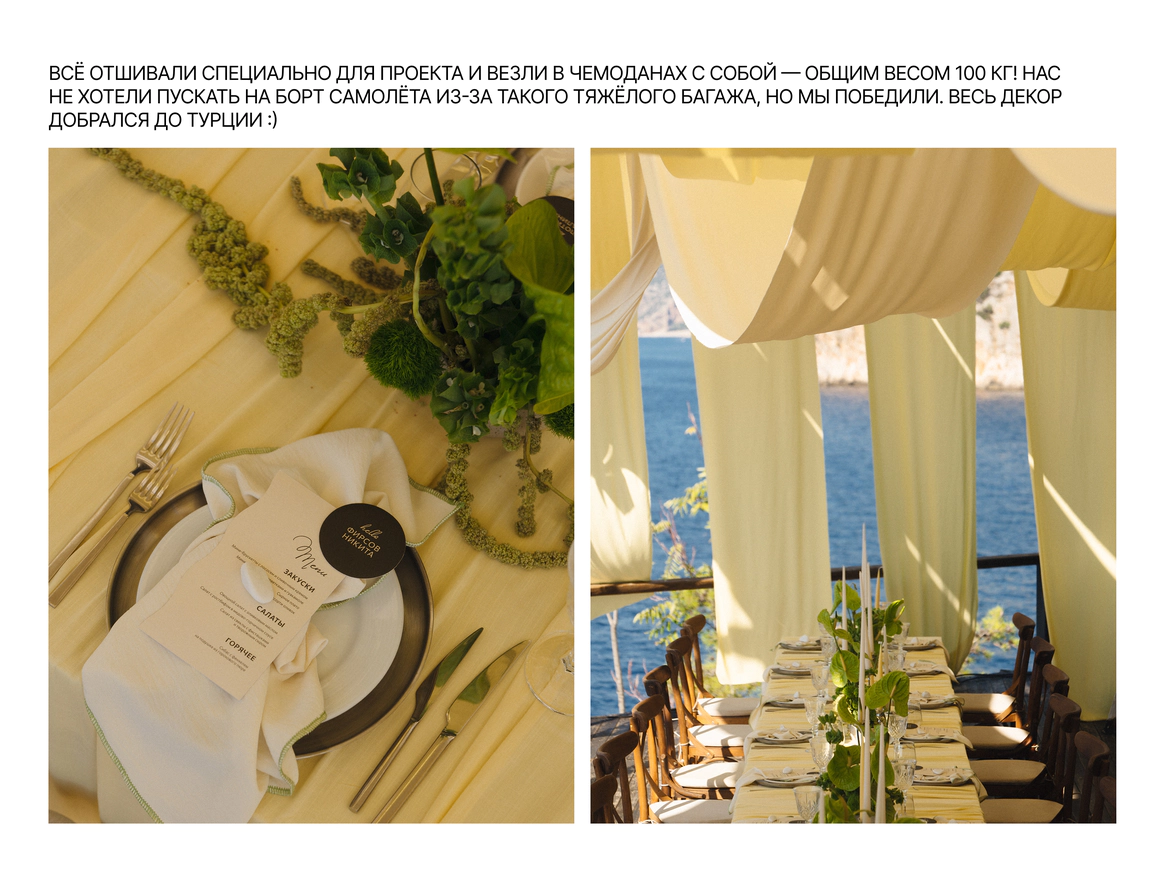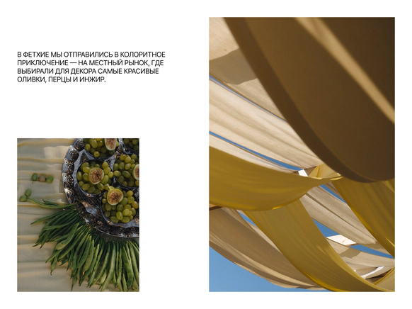 Все отшивали специально для проекта и везли в чемоданах с собой, общим весом в 100кг! Нас не хотели пускать на борт самолета из-за такого большого веса багажа, но мы победили! Весь декор добрался до Турции:) В Фетхие мы отправились в колоритное приключение на местный рынок, где выбирали для декора самые красивые оливки, перцы, инжир.