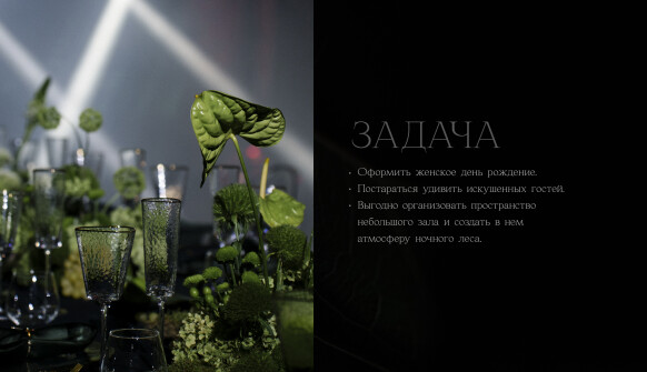 Мы команда прогрессивных декораторов, дизайнеров, флористов и технических специалистов. Наша миссия — создавать уникальный и оригинальный декор. Мы реализуем проекты про искусство и технологии, классику и фэнтези. Постоянно экспериментируем, используем новые формы и нестандартные решения. Мы можем всё! От застройки форумов, до создания уютных семейных событий.