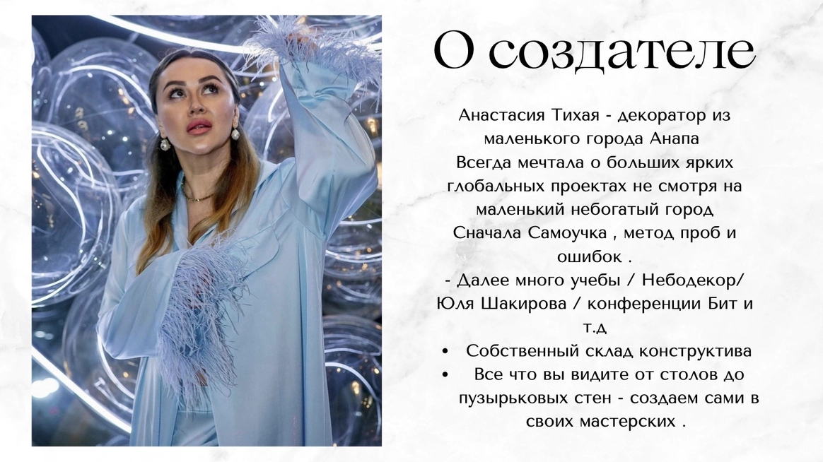 Анастасия Тихая - декоратор из маленького города Анапа . Всегда мечтала о больших ярких глобальных проектах не смотря на маленький небогатый город . Сначала Самоучка , метод проб и ошибок . - Далее много учебы / Небодекор/ Юля Шакирова / конференции Бит и т д . - Собственный склад конструктива . - Все что вы видите от столов до пузырьковых стен - создаем сами в своих мастерских .
