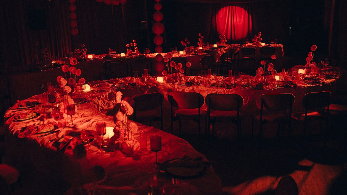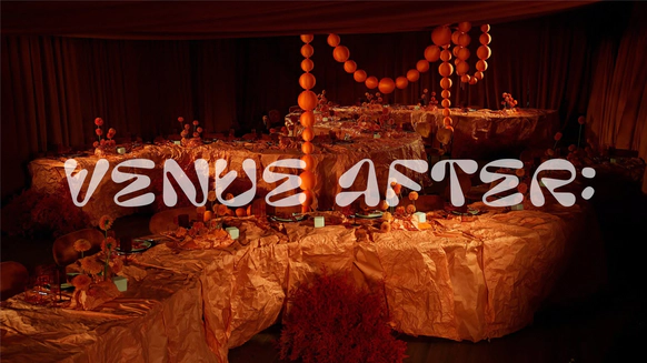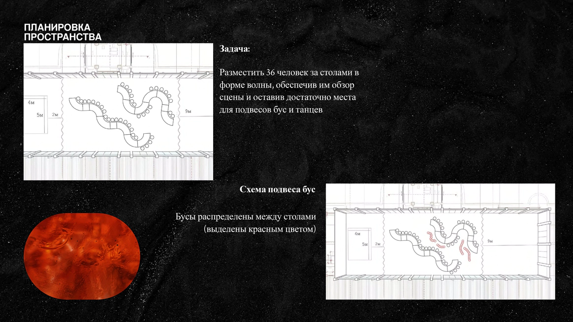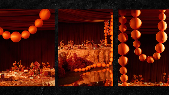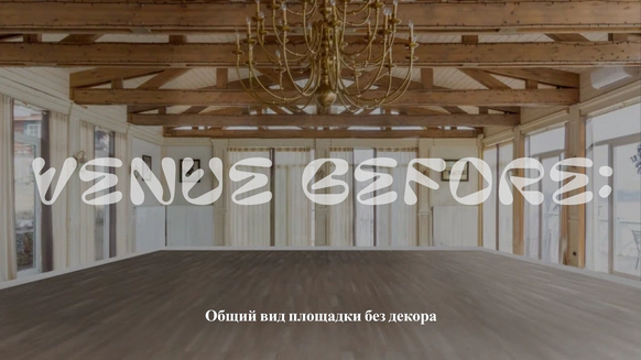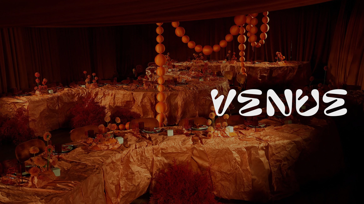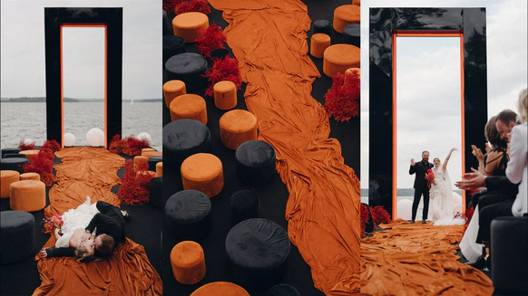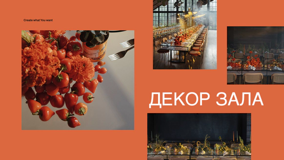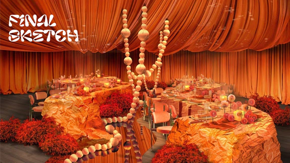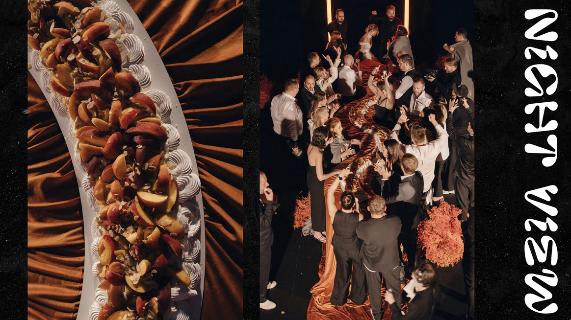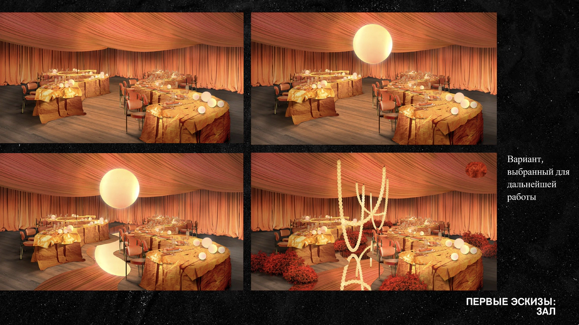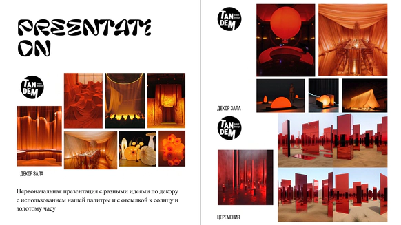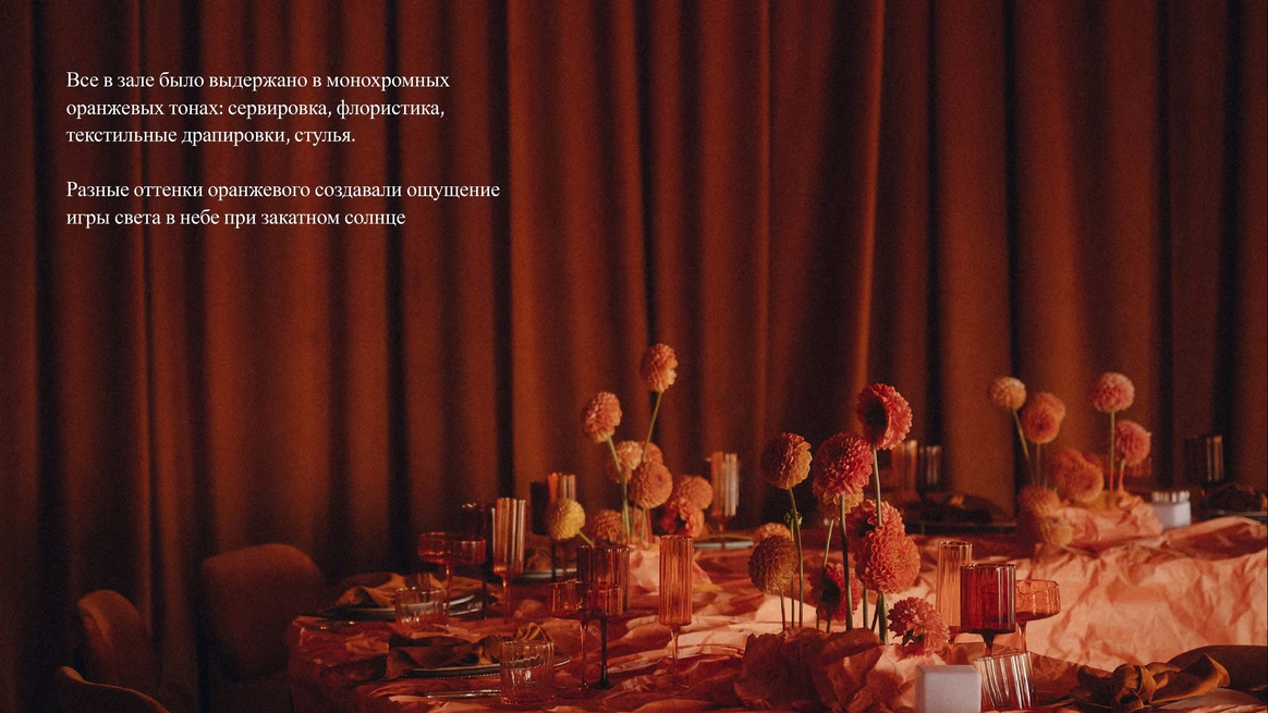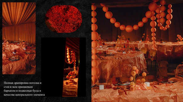 Мы полностью преобразили площадку и буквально пересобрали пространство с нуля. Потолок и стены зашили в оранжевый бархат, добавили напольный акцент, привезли столы и сервировку.