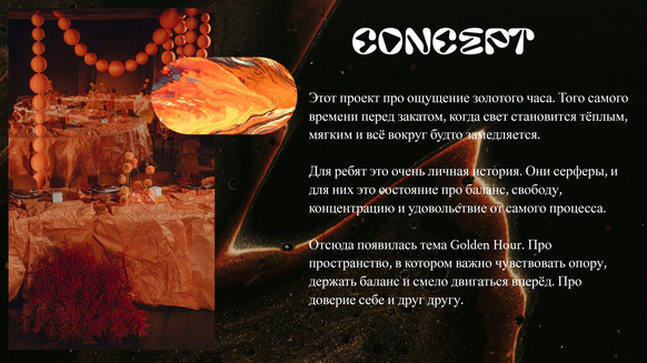 Для ребят это очень личная история. Они серферы, и для них это состояние про баланс, свободу, концентрацию и удовольствие от самого процесса.