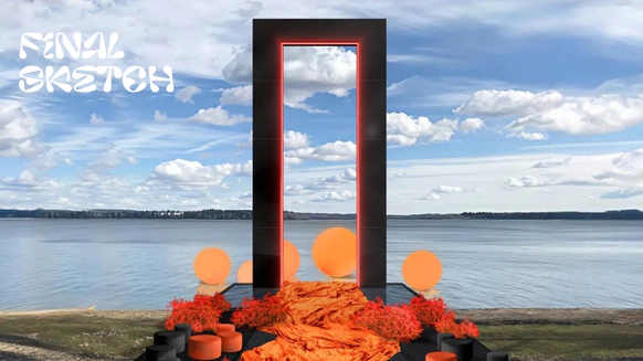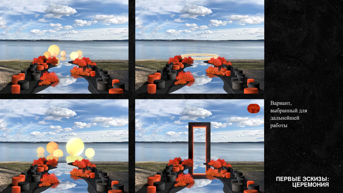 В зоне церемонии мы установили пятиметровую прямоугольную арку с подсветкой по внутреннему контуру. Арка была выполнена в глянцевом черном цвете и особенно эффектно смотрелась вечером, когда включили дополнительный свет - появлялась глубина и красивый контраст.
