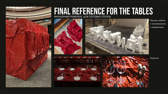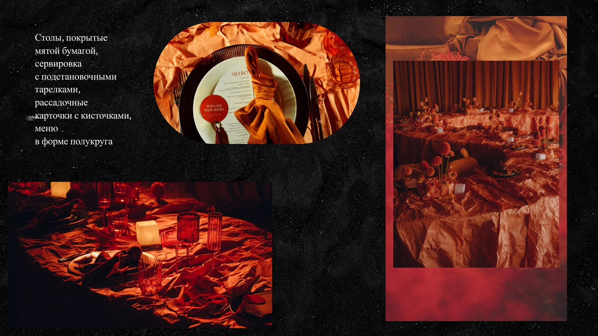 Столы накрыли сжатой бумагой, чтобы поиграть с фактурой и уйти от привычной фактуры скатертей. За счёт этого пространство получилось живым и тактильным.