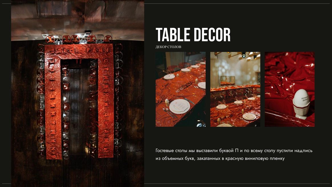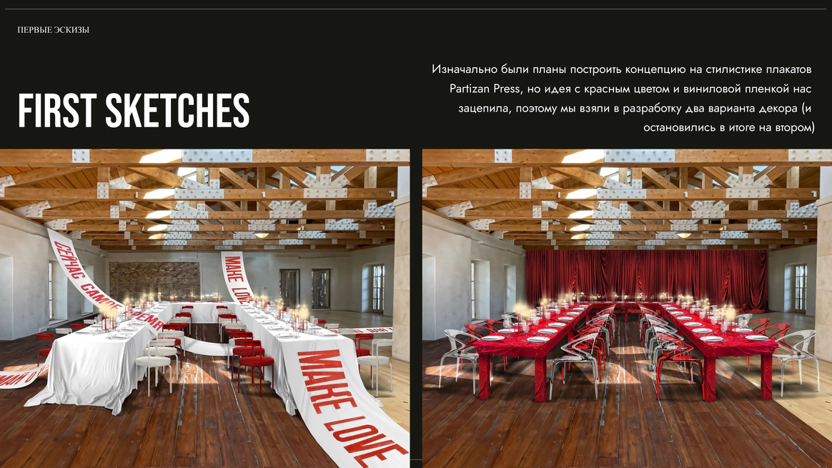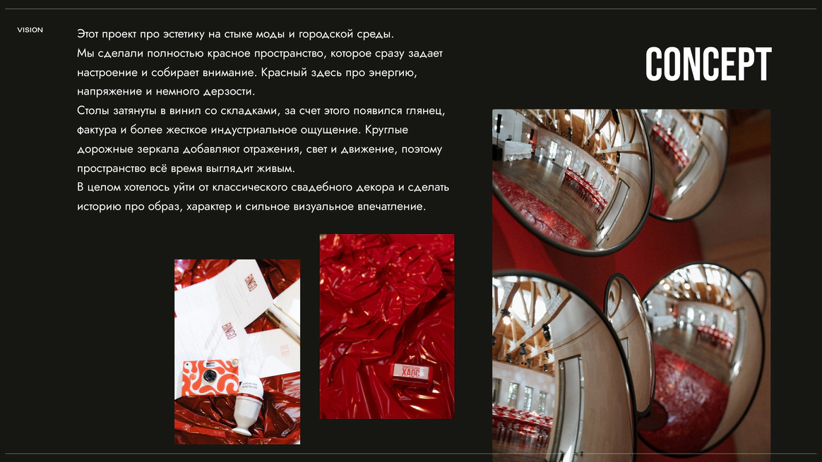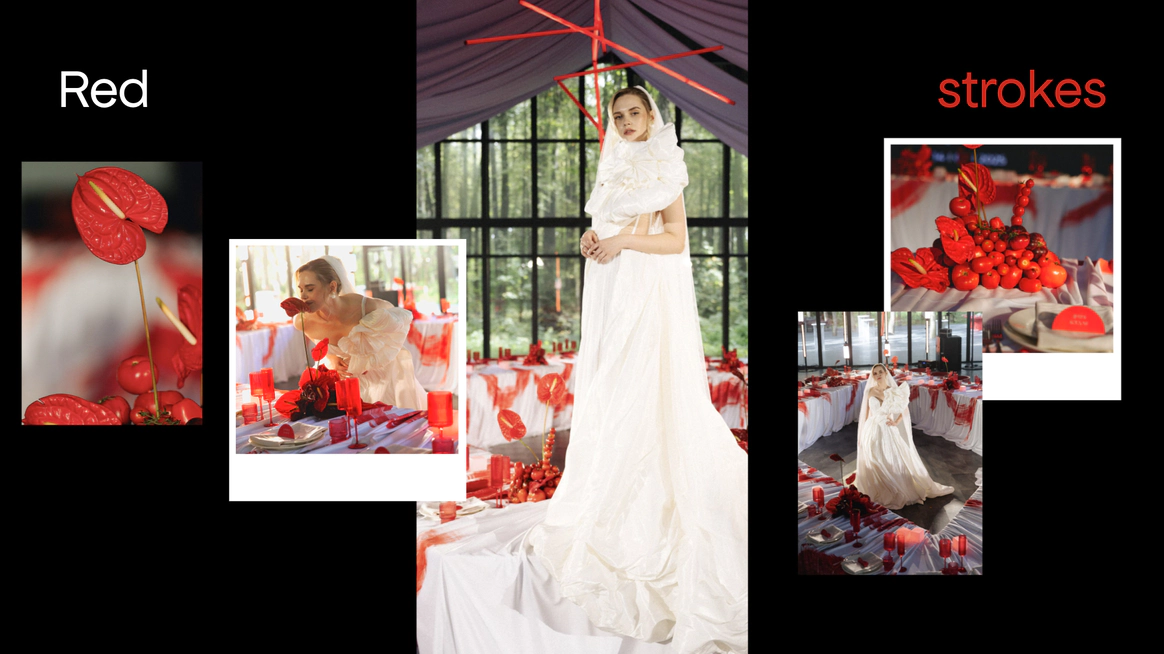 В целом хотелось уйти от классического свадебного декора и сделать историю про образ, характер и сильное визуальное впечатление.