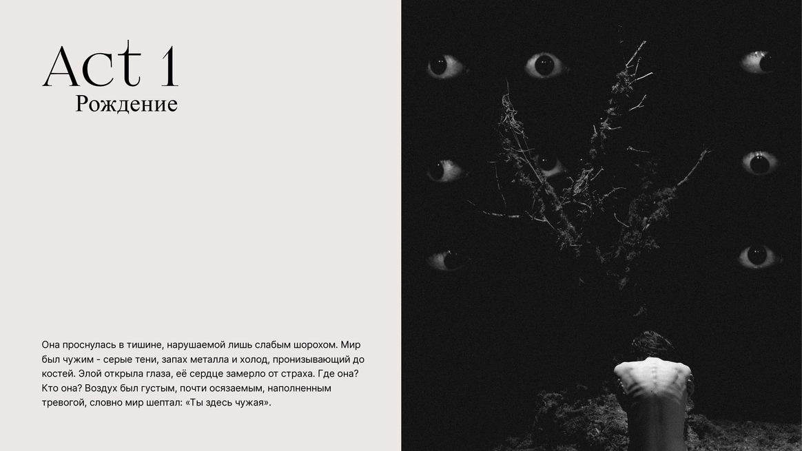 Она проснулась в тишине, нарушаемой лишь слабым шорохом. Мир был чужим - серые тени, запах металла и холод, пронизывающий до костей. Элой открыла глаза, её сердце замерло от страха. Где она? Кто она? Воздух был густым, почти осязаемым, наполненным тревогой, словно мир шептал: «Ты здесь чужая».
