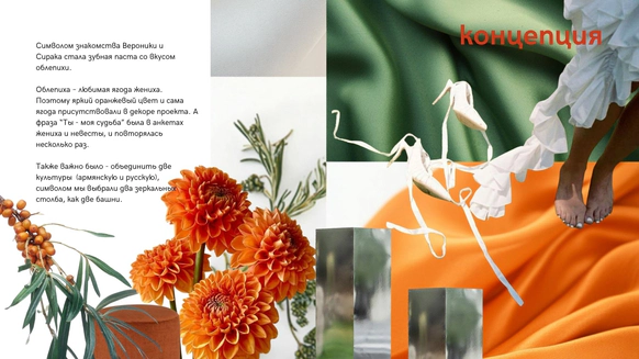 Мы использовали в деталях декора любимую ягоду Сирака, облепиху, и любимые цветы Вероники, георгины.